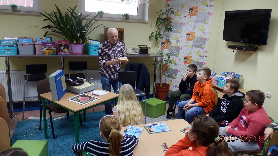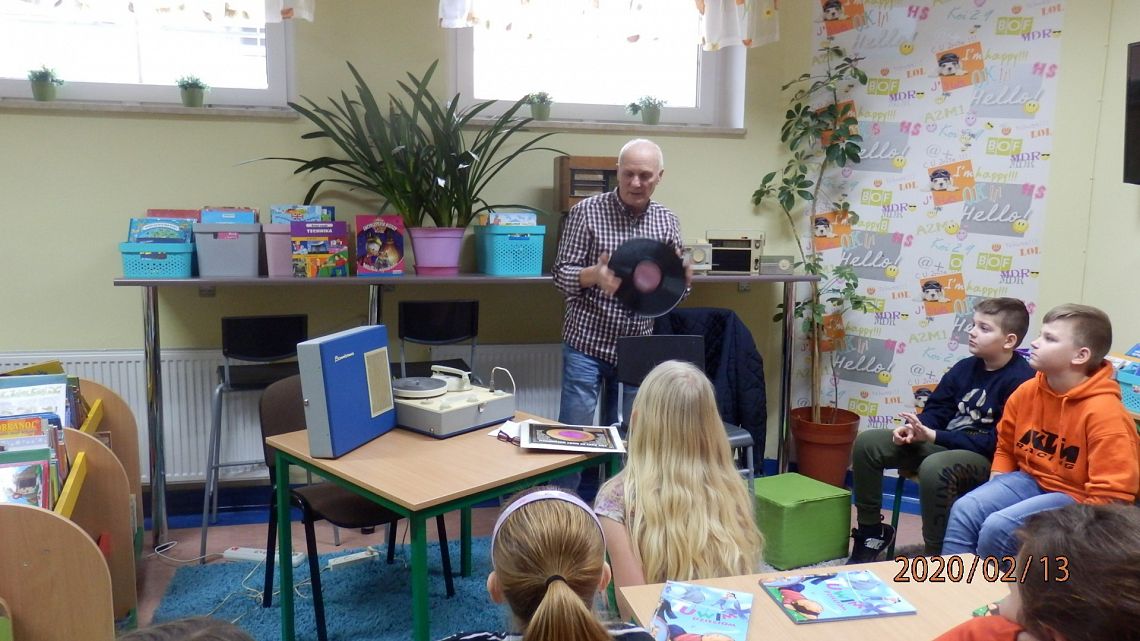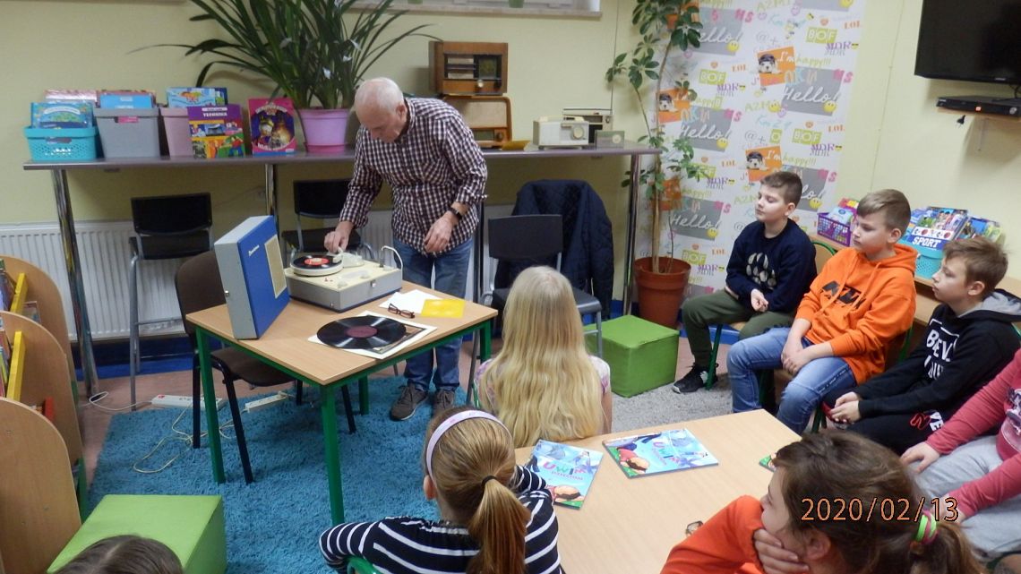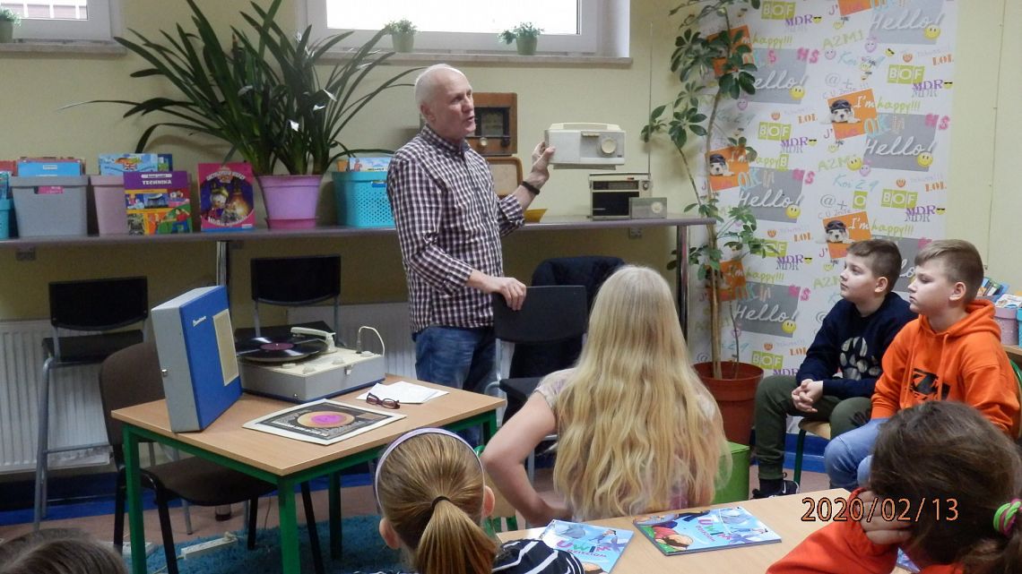 Okazją do kolejnego spotkania były obchody nietypowego święta, a mianowicie „Dnia Radia”. Tym razem bibliotekę odwiedzili uczniowie klasy V c, z którymi spotkał się Pan Bogdan Godzisz z Łęczyc. Jak wiadomo, Pan Bogdan jest miłośnikiem starych telefonów i radioodbiorników. W ciągu ostatnich lat widywał się już z uczniami naszej szkoły, aby opowiedzieć o swoim hobby. I tym razem z ogromną przyjemnością spotkał się z młodzieżą, aby zaprezentować przyniesione ze sobą radia i najnowszy nabytek – działający gramofon Bambino z 1969 roku. Dzieci poznały historię radia oraz życiorys jego wynalazcy. Obejrzały eksponaty, wysłuchały kilku utworów odtworzonych na starym gramofonie oraz rozwiązywały tematyczne łamigłówki.