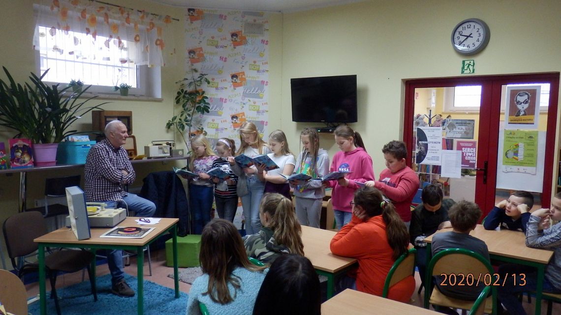 Na zakończenie, w podziękowaniu za interesujące spotkanie, grupa uczniów przygotowała dla Pana Bogdana prezentację wiersza Juliana Tuwima … „Ptasie radio”.