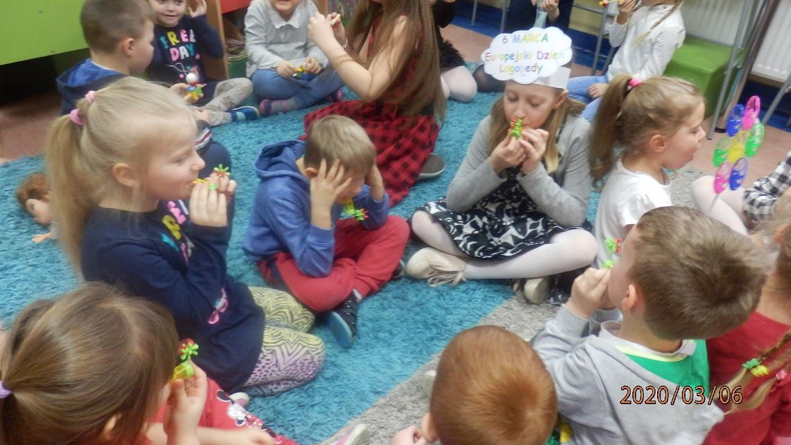 Okazją do kolejnego spotkania w bibliotece szkolnej był Europejski Dzień Logopedy. 6 marca, na zajęciach spotkała się z przedszkolakami z grupy O C Pani Grażyna Łangowska – logopeda szkolny. Po krótkiej inscenizacji pt: „Abecadłowo”, w wykonaniu Zuzi, Patrycji, Pauliny, Emilii i Ani z klasy II a, dzieci przystąpiły do potyczek logopedycznych. Chętnie wzięły udział w ćwiczeniach oddechowych, wiele radości sprawiły im również zabawy ruchowe usprawniające mowę. Taka forma aktywności bardzo im się spodobała, a najbardziej naśladowanie ssania pysznej pastylki. Przy tym ćwiczeniu mlaskać można było do woli.