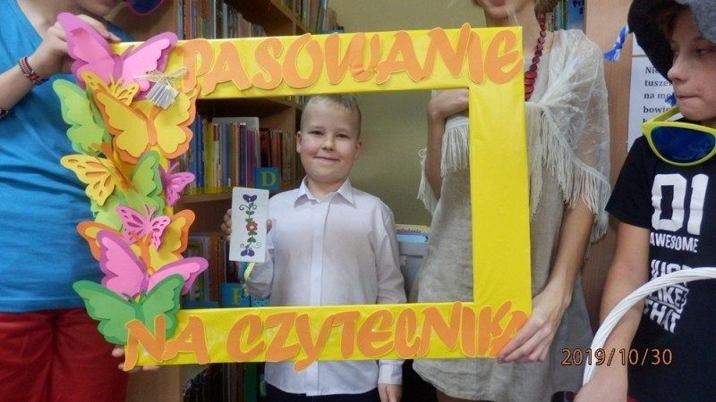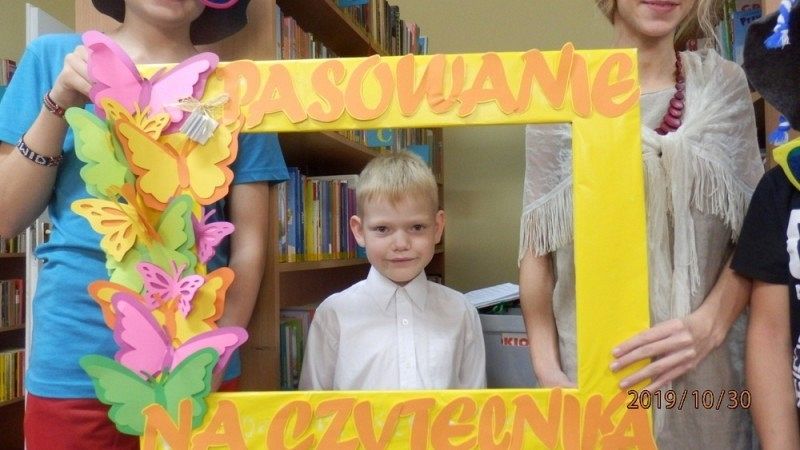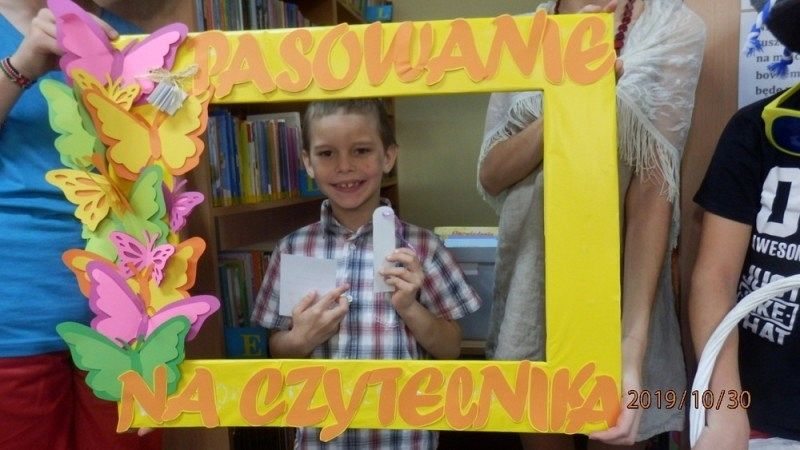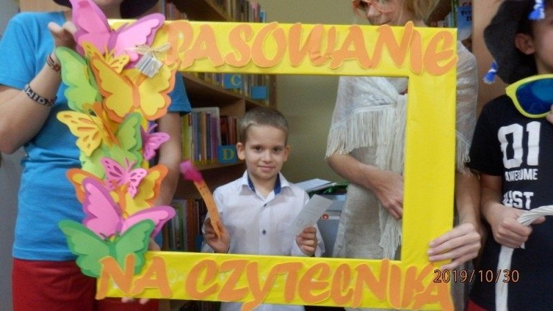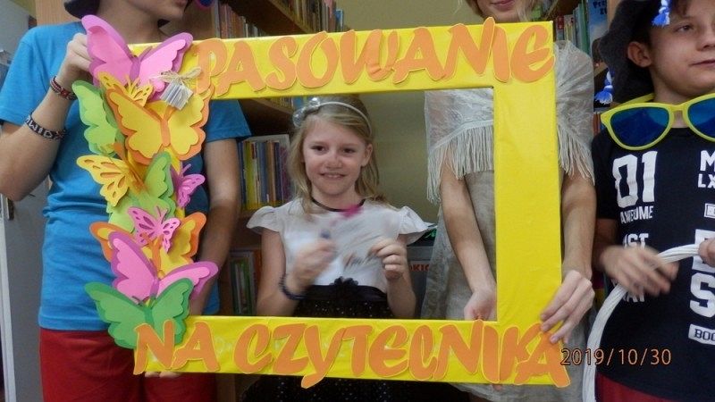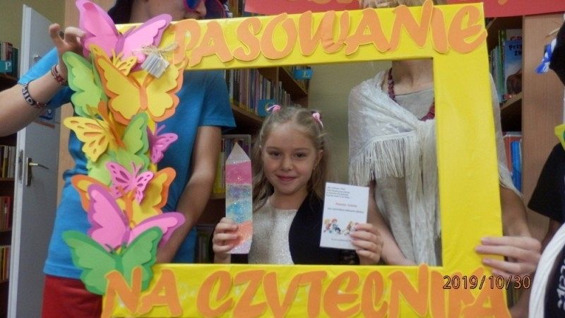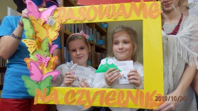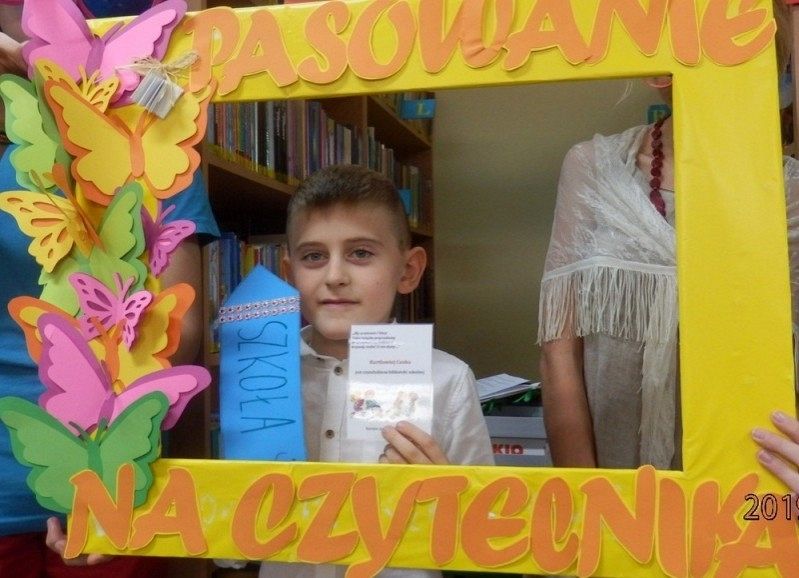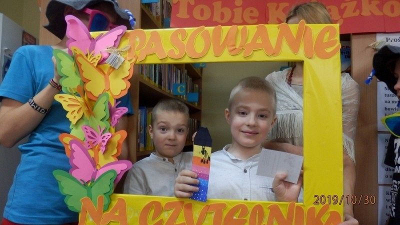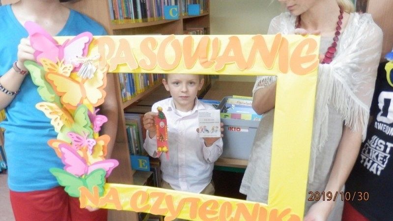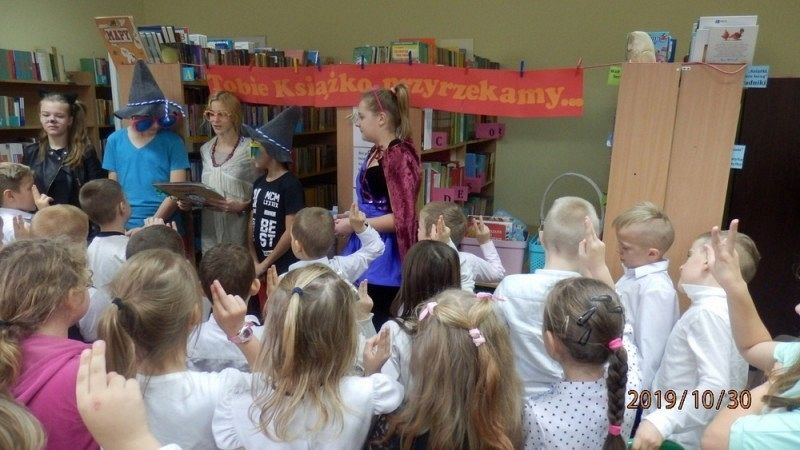 Tekst przytoczonej przysięgi uczniowie klas pierwszych wypowiedzieli podczas uroczystego pasowania na czytelników, które odbyło się 30 października. W obecności wice dyrektor – p. Anny Kotłowskiej, pań wychowawczyń oraz zaproszonych rodziców przyszli czytelnicy obejrzeli przedstawienie, przygotowane przez „aktorów” z klasy VIII b. Dowiedzieli się, jak należy dbać o książki i prawidłowo zachować się w bibliotece. Następnie złożyli uroczyste przyrzeczenie, że będą odpowiedzialnymi czytelnikami. Na zakończenie nowi czytelnicy otrzymali legitymacje i zakładki, z którymi pozowali do pamiątkowego zdjęcia, w specjalnie przygotowanej na tę chwilę „foto ramce”.