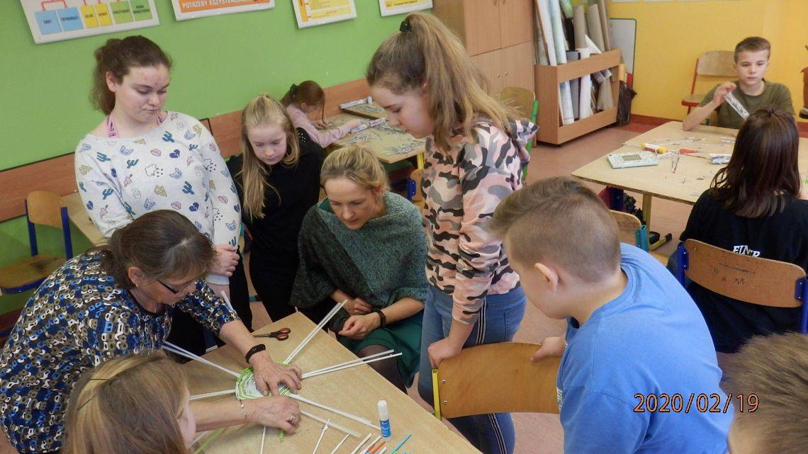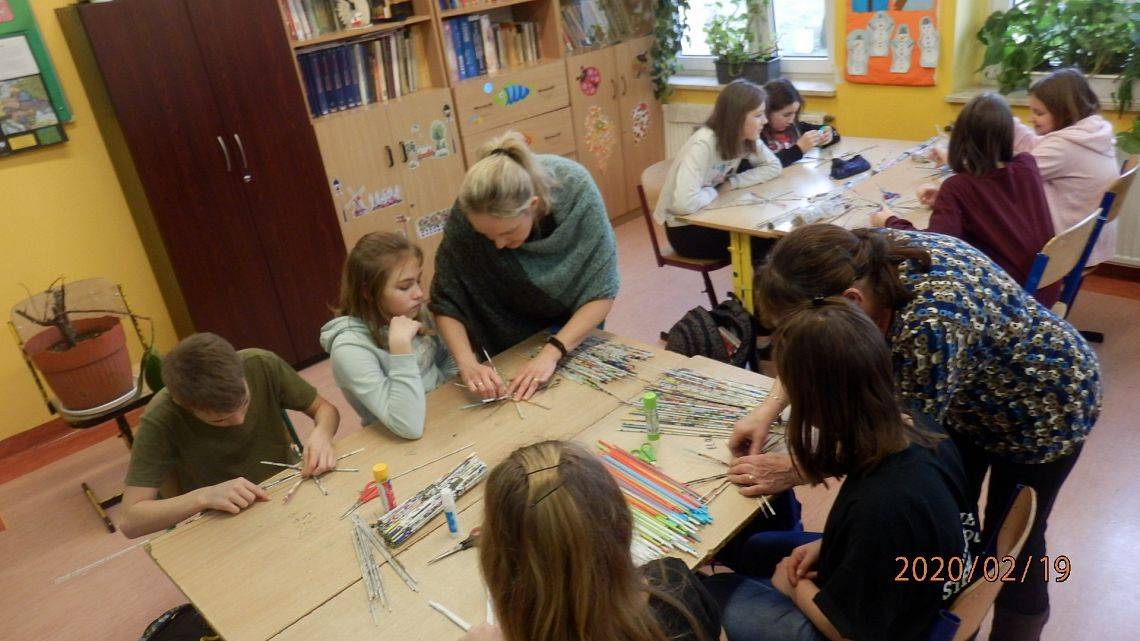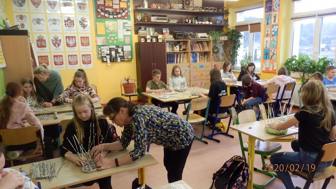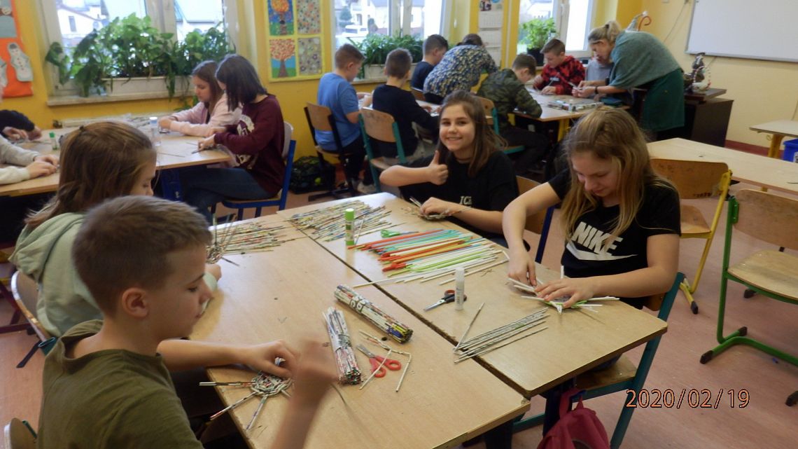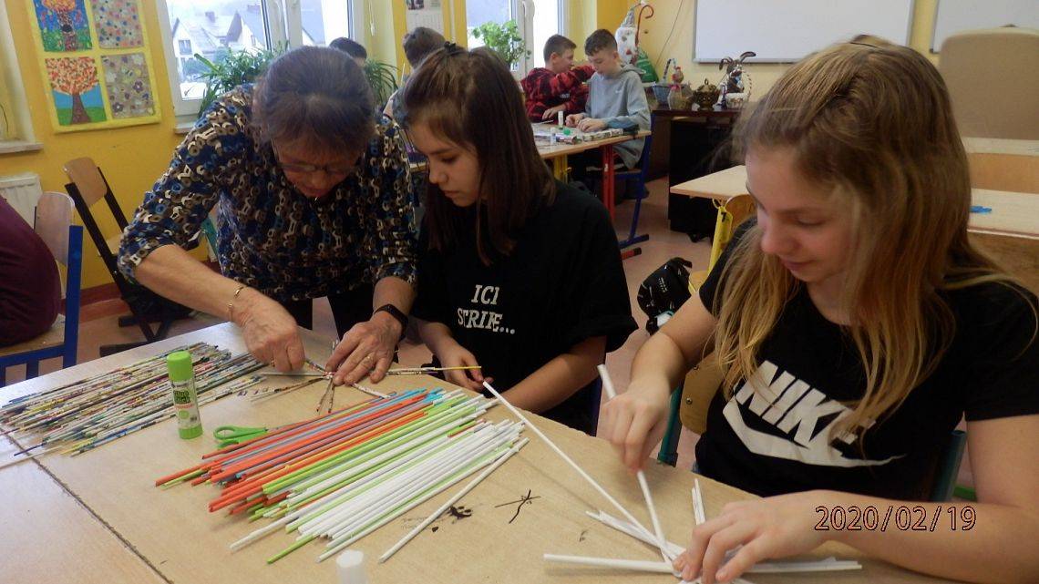 18 lutego, uczniowie podjęli się wyplatania koszyczka z wikliny papierowej. Pracy dzieci przyglądała się Pani Teresa Keller z Bożegopola – znawczyni tej techniki. Pierwsze próby wychodziły nieco niezdarnie, ale już kolejne kroki wyplatania przyniosły pożądane efekty.