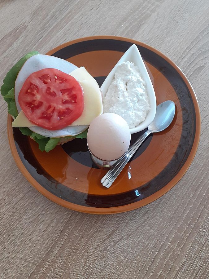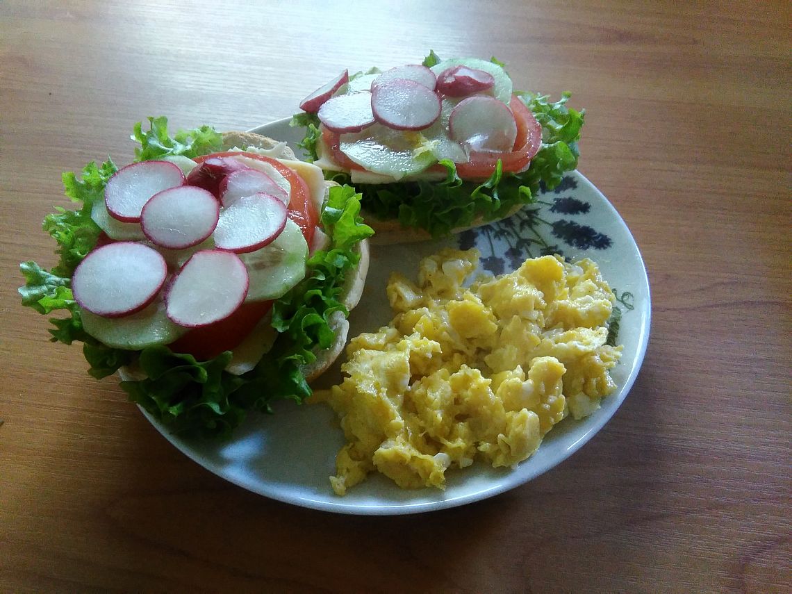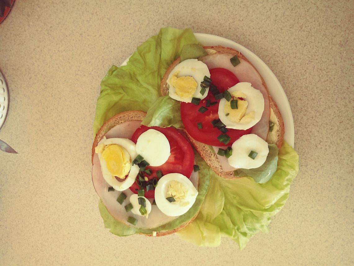 Z serem, jajeczkiem, rzodkiewką, pomidorkiem, kiełkami, sałatą na wieloziarnistej bułce, posypane wszystko szczypiorkiem
