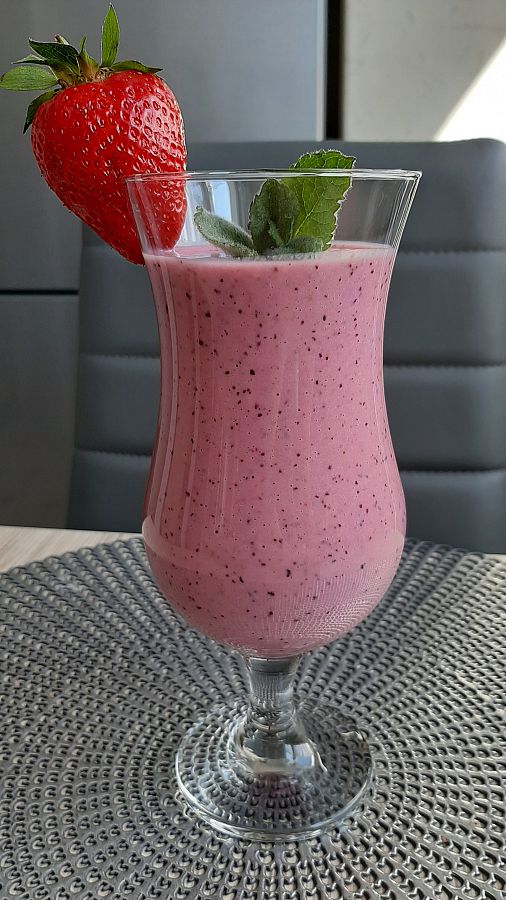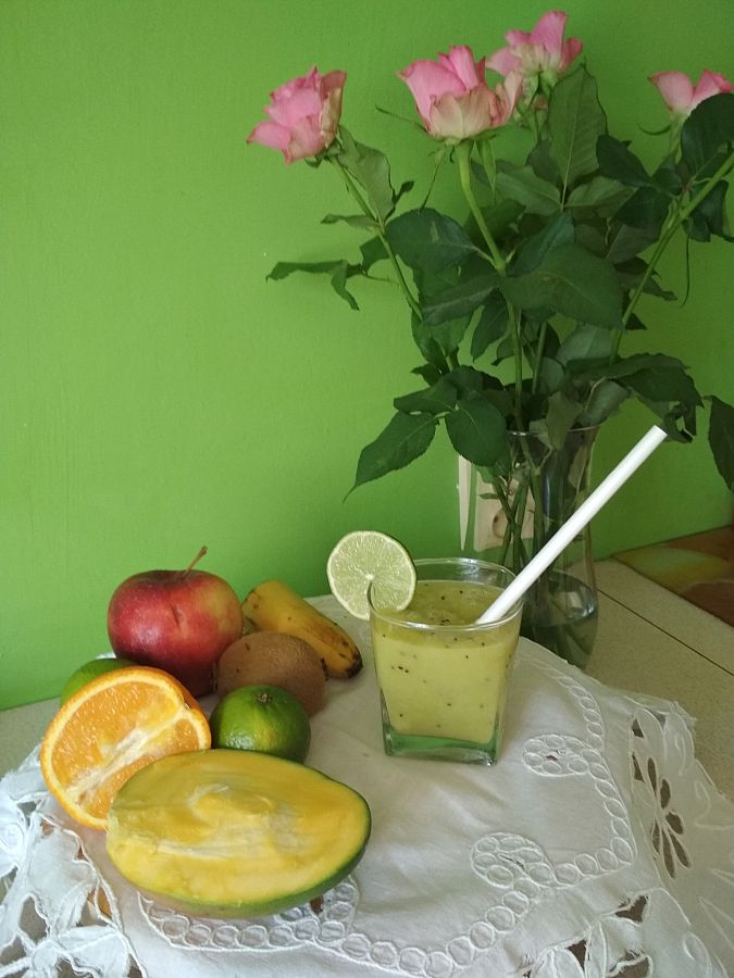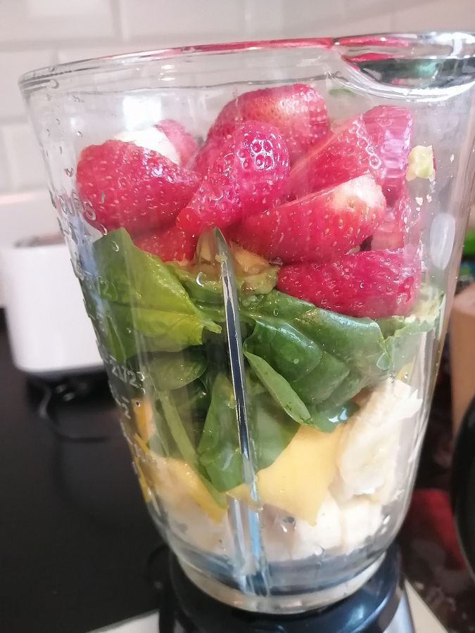 Zrobiony ze szpinaku ,awokado,banana,truskawek,mango i pomarańczy oraz wody