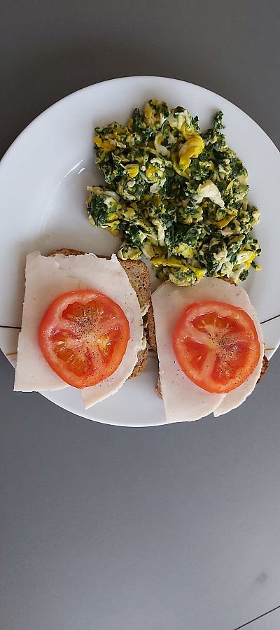 Jajecznica ze szpinakiem kanapka z szynką i pomidorkiem