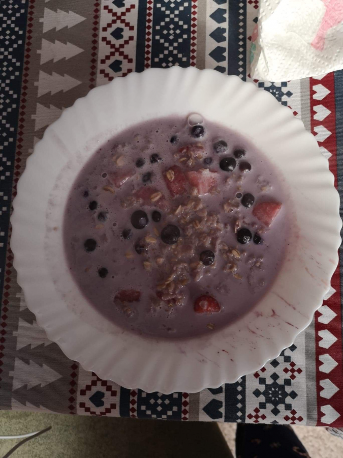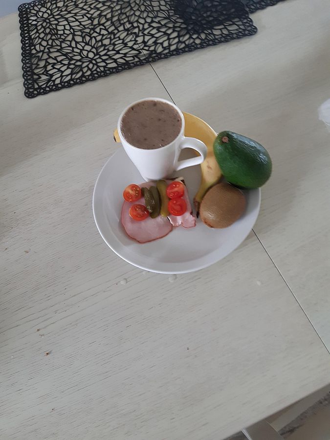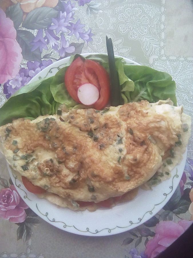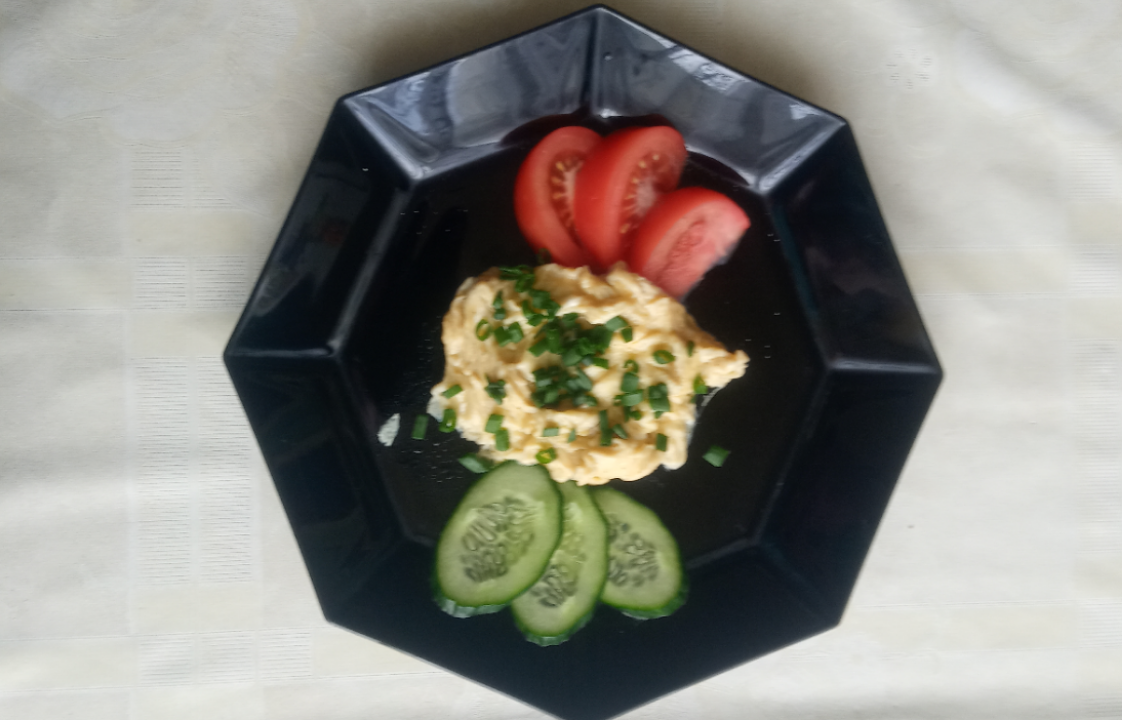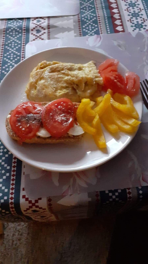 Moje sniadanie:jajecznica na maśle,pomidor,ogorek,czypiorek,odrobina soli i pieprzu