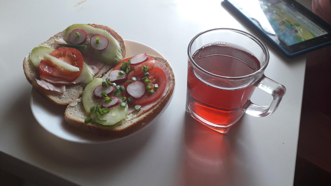 Składniki: kakao, ogórek, pomidor, kiełbasa, ser, chleb