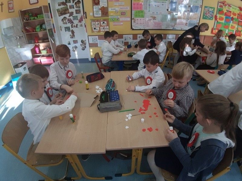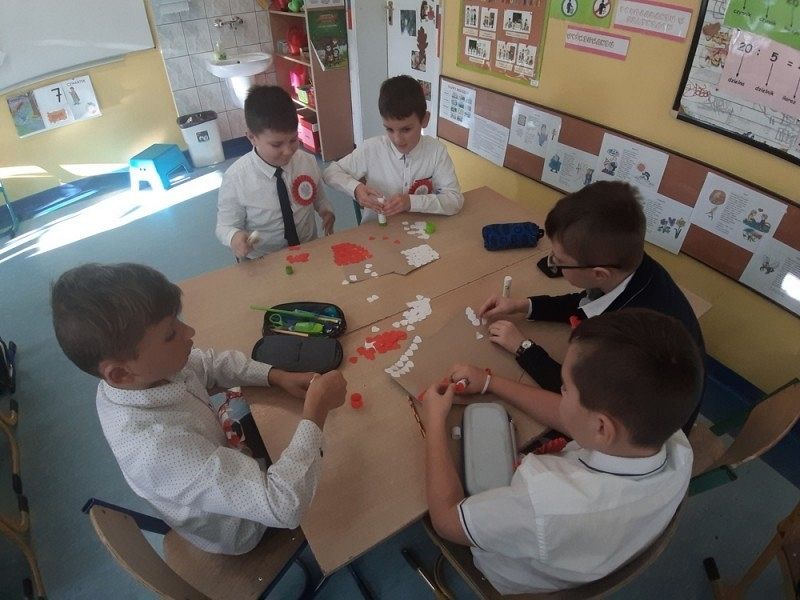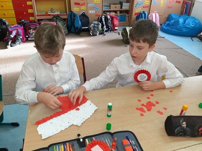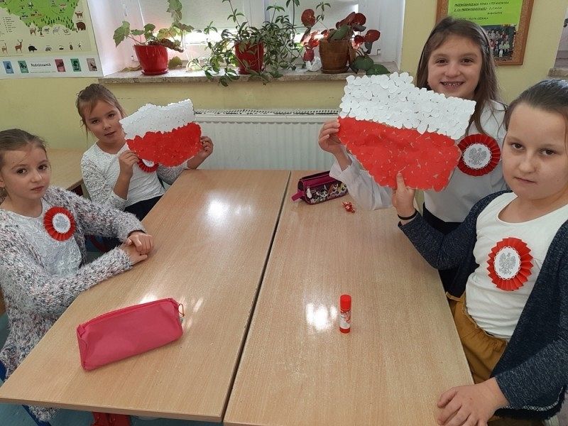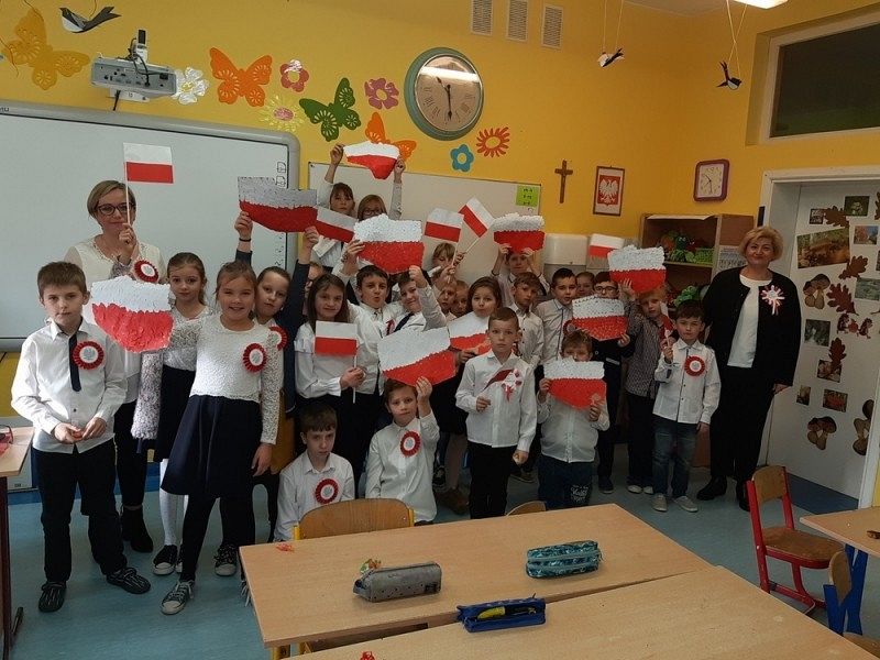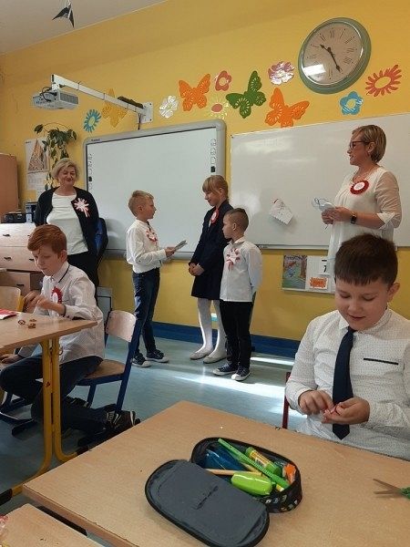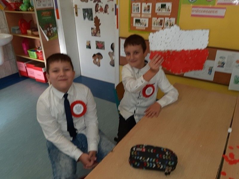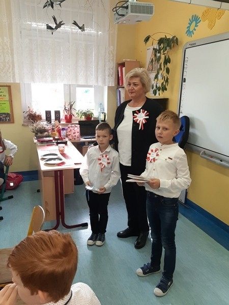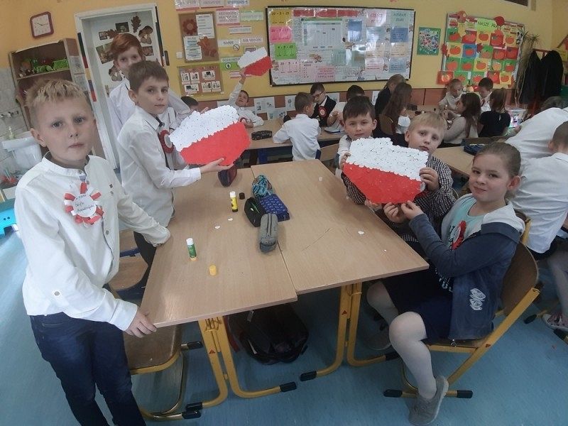 Dzień 8 listopada w Zespole Szkolno- Przedszkolnym w Łęczycach był dniem szczególnym i wyjątkowym dla całej społeczności uczniowskiej, a zwłaszcza dla uczniów klas trzecich. W tym dniu klasę IIIB odwiedzili uczniowie klasy III z Brzeźna Lęborskiego, którzy wspólnie z wychowawczyniami – P. Magdaleną Petta oraz P. Dorotą Pranga czynnie uczestniczyli w uroczystym apelu poświęconym odzyskaniu niepodległości. Po apelu nastąpił dalszy ciąg świętowania- uczniowie jak na prawdziwych patriotów przystało wyklejali kontury Polski serduszkami w barwach narodowych. Podczas zajęć integracyjnych towarzyszyła uczniom radosna i przyjazna atmosfera w czasie wspólnie wykonywanego zadania. Takie lekcje sprzyjają prawidłowej komunikacji, nawiązywaniu pozytywnych kontaktów między uczniami, a u niektórych dzieci wzrasta pewności siebie. To wszystko wpływa na łatwość w podejmowaniu odważnych decyzji oraz otwarciu na drugiego człowieka tak ważnych w dzisiejszych czasach. Po zakończeniu pracy nastąpiła prezentacja wspólnie wykonanych dzieł i pamiątkowa, wspólna fotografia uczniów obu szkół. Następnie uczniowie udali się do biblioteki szkolnej gdzie wzięli udział we wspólnej zabawie poznając prawdziwą historię niedźwiedzia Wojtka-czworonożnego przyjaciela żołnierzy z Armii Andersena. Bibliotekarka-Pani Bogusława Kondratko przeczytała dzieciom fragmenty książki Ł. Wierzbickiego „Dziadek i Niedźwiadek”, na podstawie której uczniowie rozwiązywali zadania m. in. odszukiwali na globusie miejsca związane z losami bohaterów książki. Wszystkie te przedsięwzięcia zintegrowały uczniów obu szkół oraz poszerzyły wiedzę związaną z historią Polski.