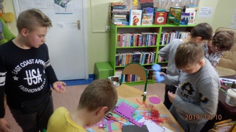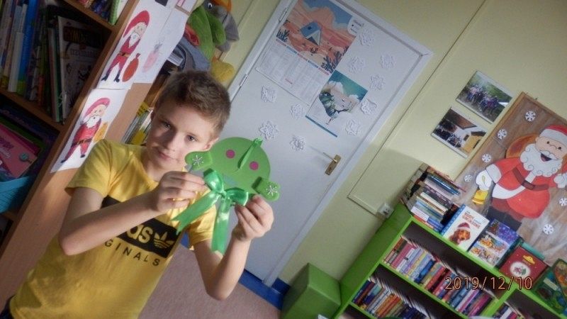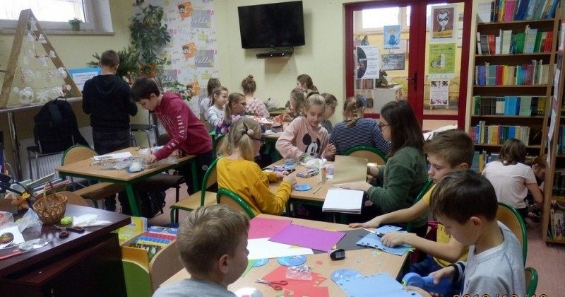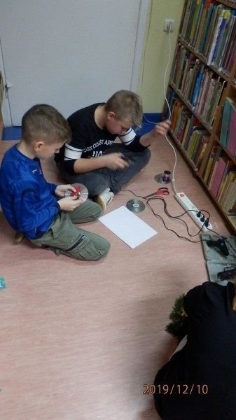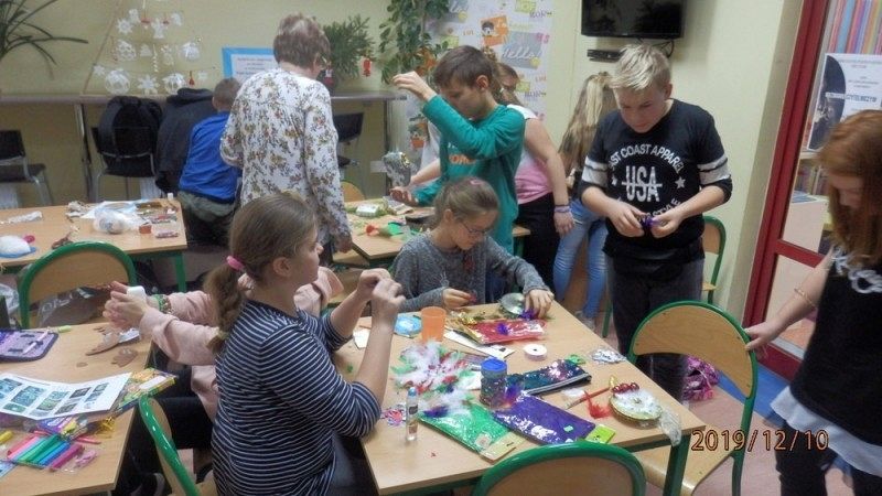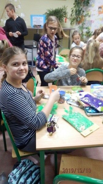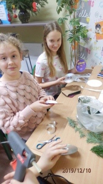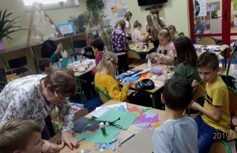 10 grudnia w bibliotece szkolnej odbyły się warsztaty tworzenia ozdób świątecznych. Zajęcia po raz kolejny poprowadziła Pani Alicja Godzisz z Łęczyc. Tym razem Pani Alicja postanowiła podzielić się swoimi pomysłami z uczniami klasy 5 b, którym zaproponowała wykorzystanie płyt CD. Pomysł był bardzo trafiony, ponieważ dzieci z zaangażowaniem tworzyły swoje ozdoby. Własnoręcznie wykonane stroiki i bombki przyniosły im wiele satysfakcji oraz wprowadziły w przedświąteczny nastrój. Uczniowie mają nadzieję, że osoby obdarowane ich rękodziełami nawet nie zauważą, że pod ozdobami kryją się płyty przeznaczone do recyklingu, a efektownie wykorzystane.