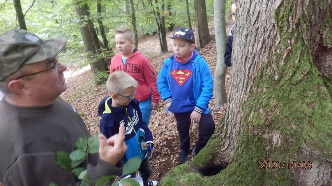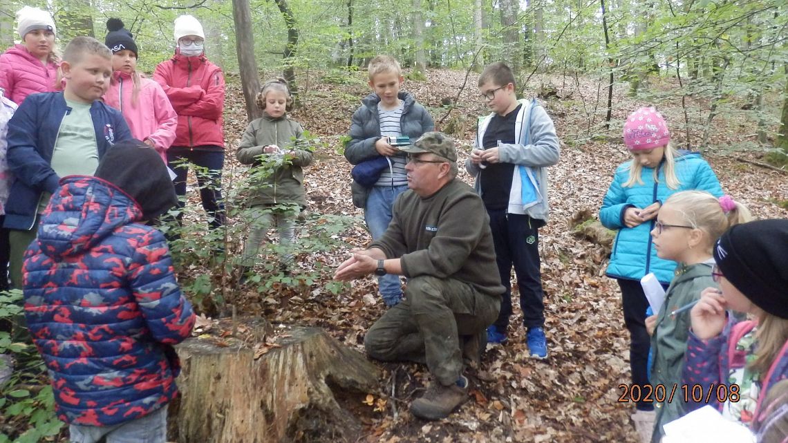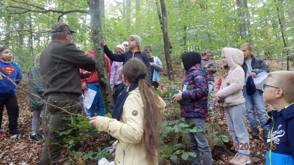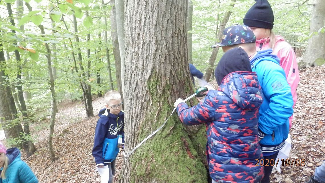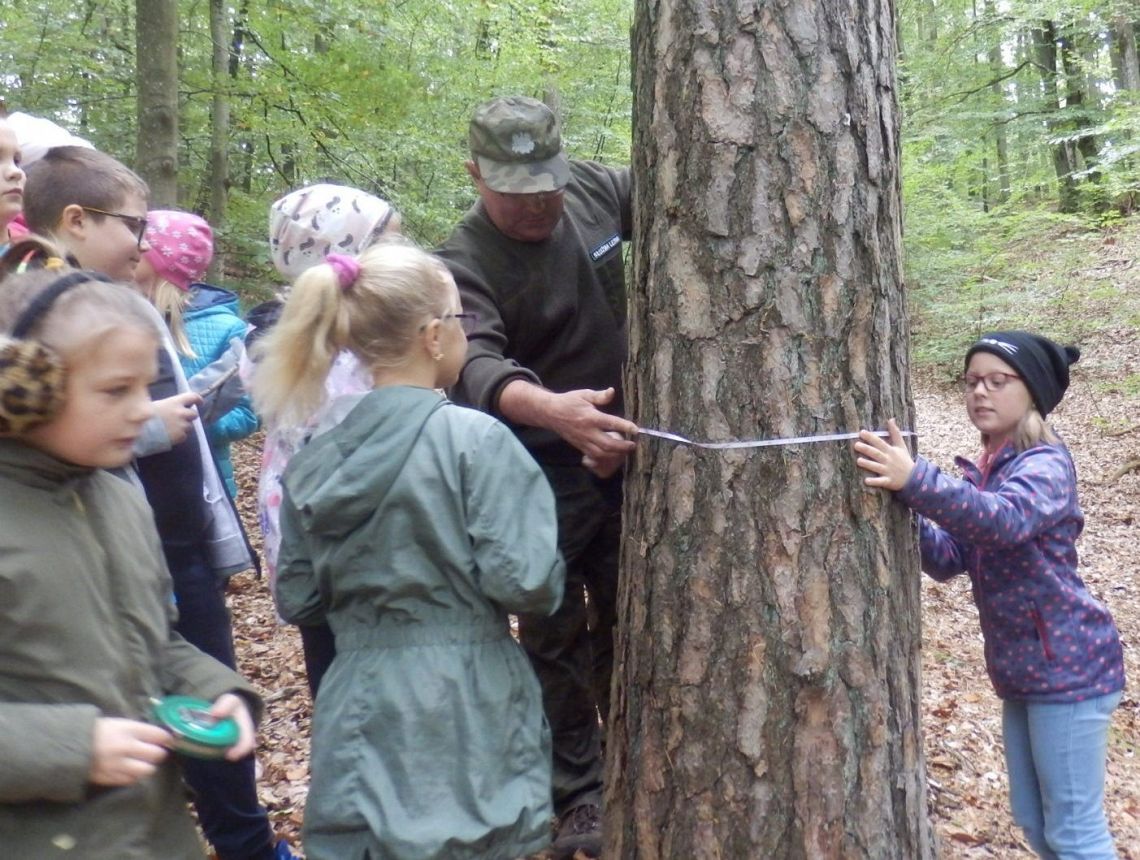Uczniowie z Łęczyc świętowali Dzień Drzewa...między drzewami. W lesie spotkali się z Panem leśniczym, któremu zadawali mnóstwo pytań dotyczących przyrody oraz wykonywanego zawodu. Następnie młodzi przyrodnicy przystąpili, pod czujnym okiem Leśniczego, do mierzenia obwodów pni oraz szukania skarbów lasu. Natrafili na norki borsuka i lisa, między gałęziami spostrzegli wiewiórkę, a w liściach nawet muchomora sromotnikowego. Wszystkie spostrzeżenia notowali na karcie pracy, którą dokończyli uzupełniać już w klasie.
