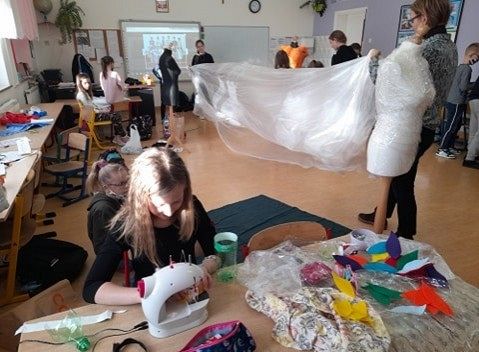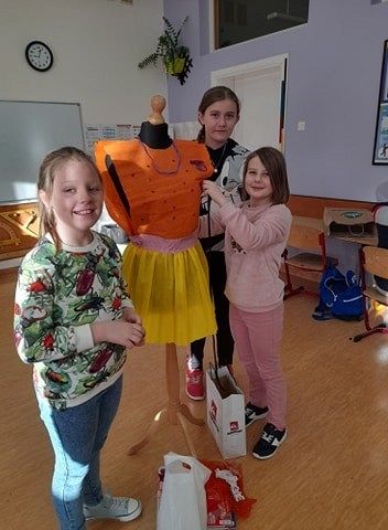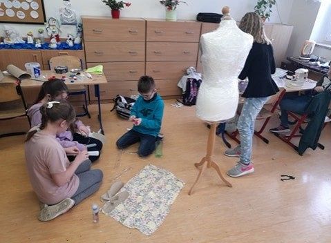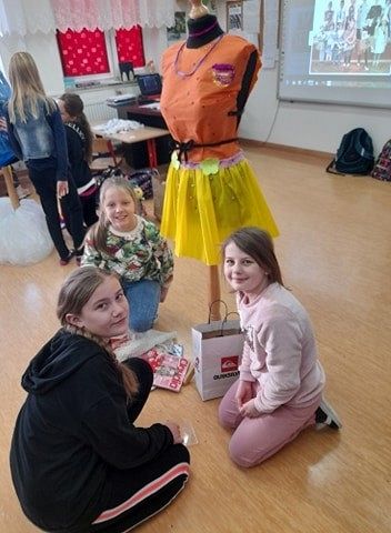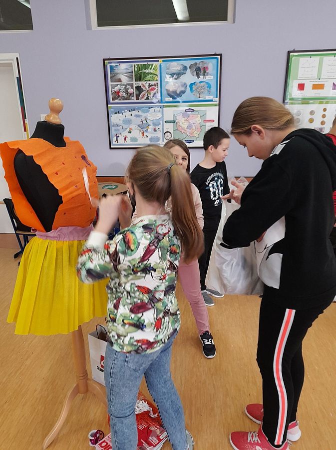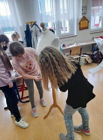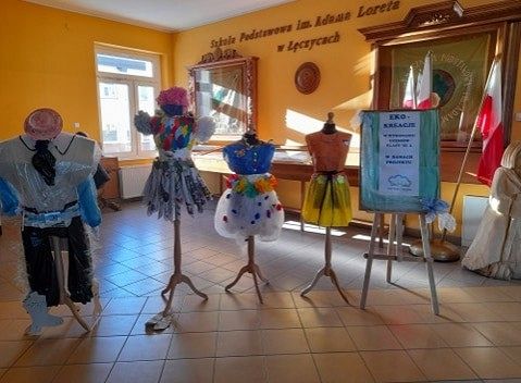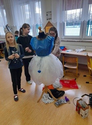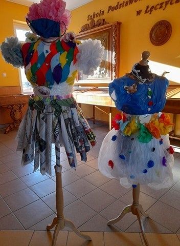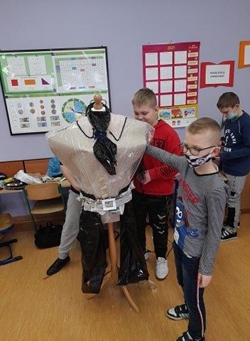 Oj, co to się dzisiaj działo w klasie III a w szkole w Łęczycach ! Sala lekcyjna zamieniła się w pracownię projektantów mody. Uczniowie, z ogromnym zaangażowaniem ubierali ....manekiny. Z eko materiałów tworzyli, kleili, a nawet na maszynie szyli ...przecudne kreacje. Efekty ich pracy mogą podziwiać wszyscy, ponieważ modnie ubrane manekiny zdobią korytarz szkolny.