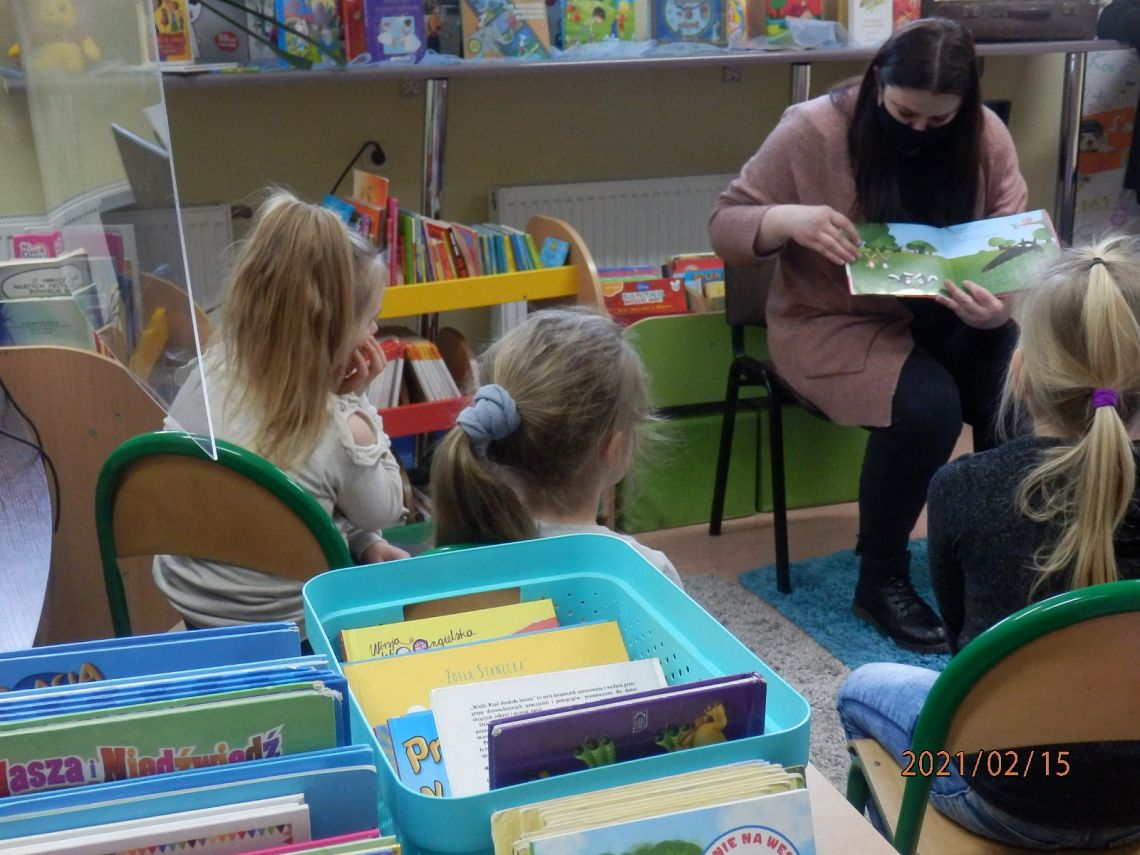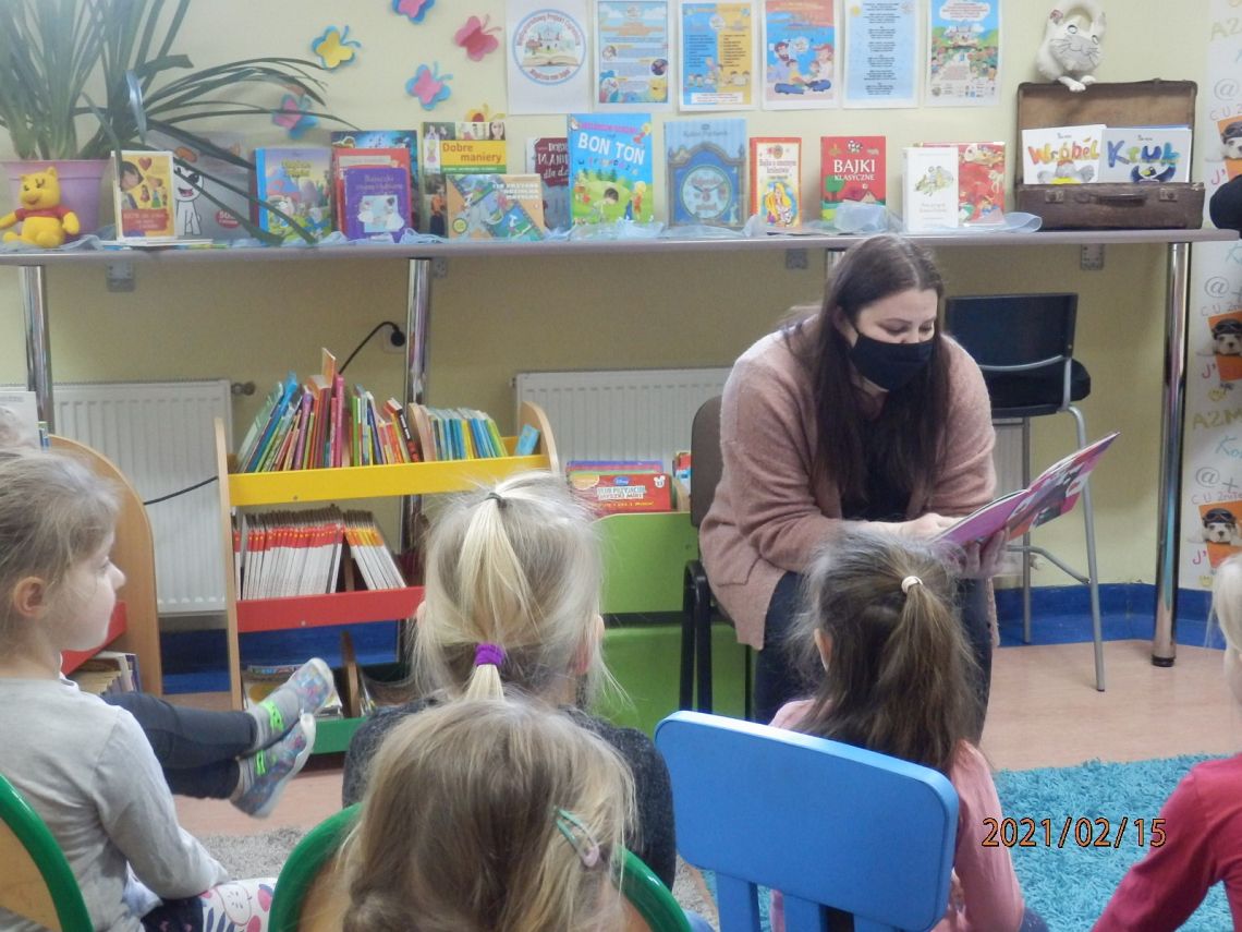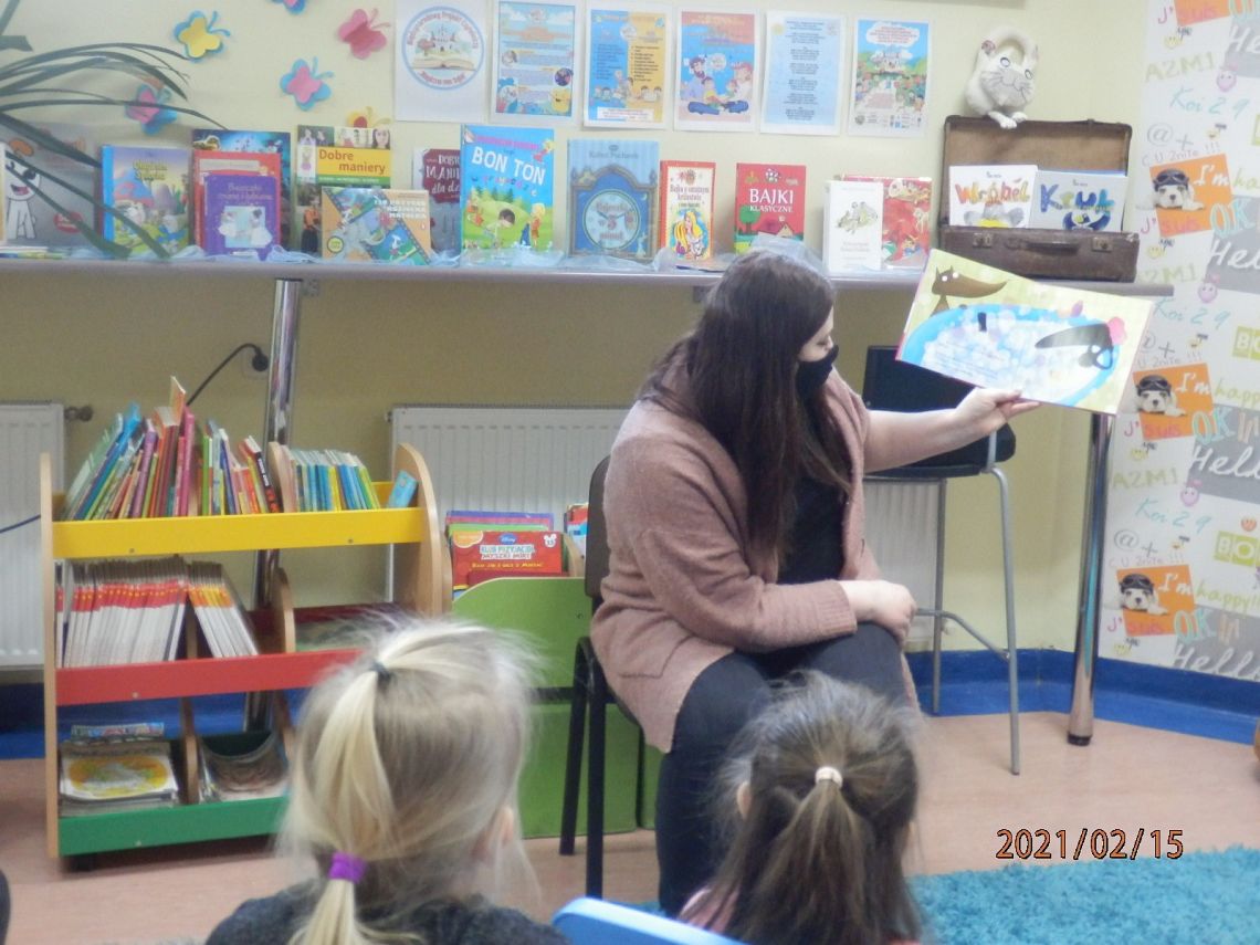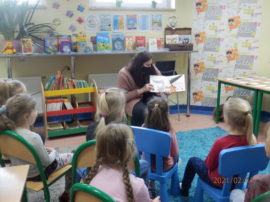 W Bibliotece Szkolnej odbyło się natomiast spotkanie z uczniami klasy 0. Dzieci wysłuchały opowieści Orianne Lallemand „O Wilku, który chciał się zakochać” i zagrały