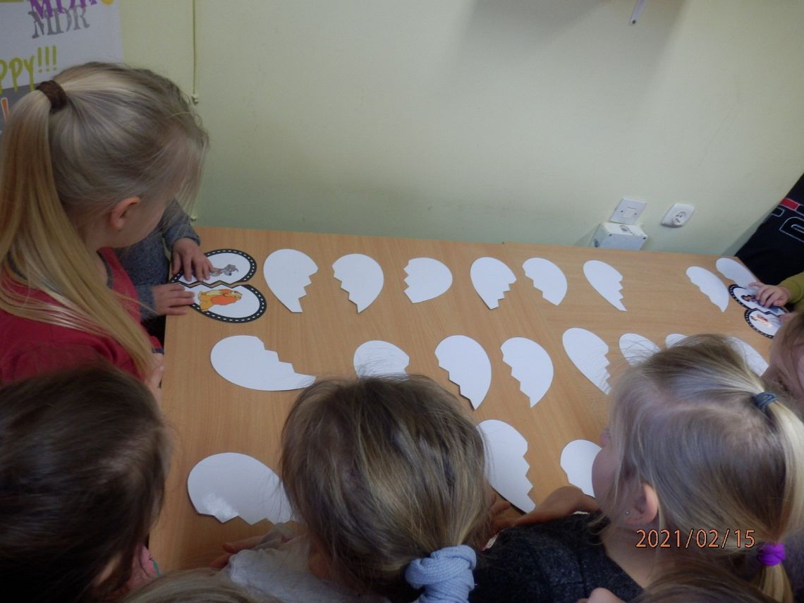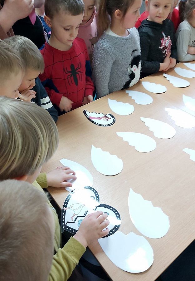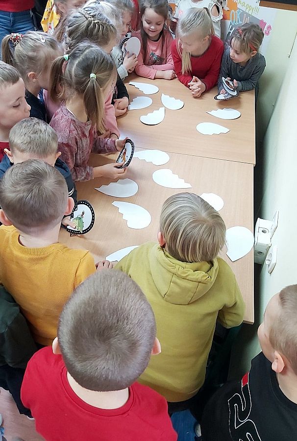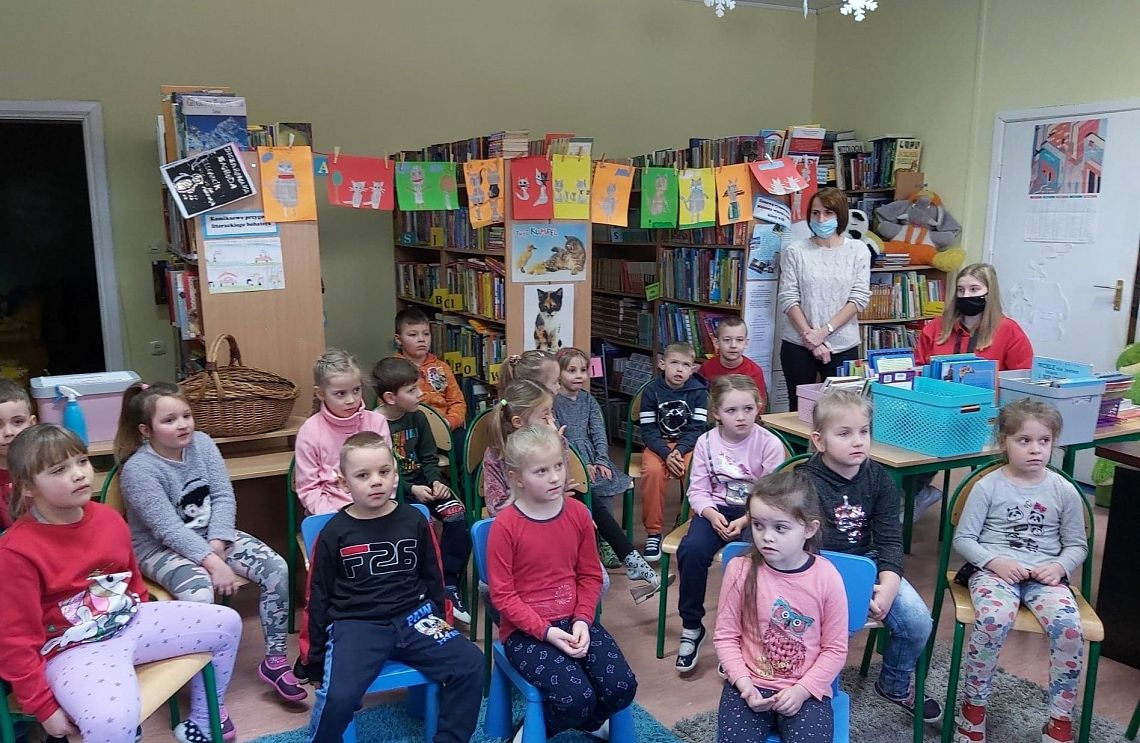 W Bibliotece Szkolnej odbyło się natomiast spotkanie z uczniami klasy 0. Dzieci wysłuchały opowieści Orianne Lallemand „O Wilku, który chciał się zakochać” i zagrały