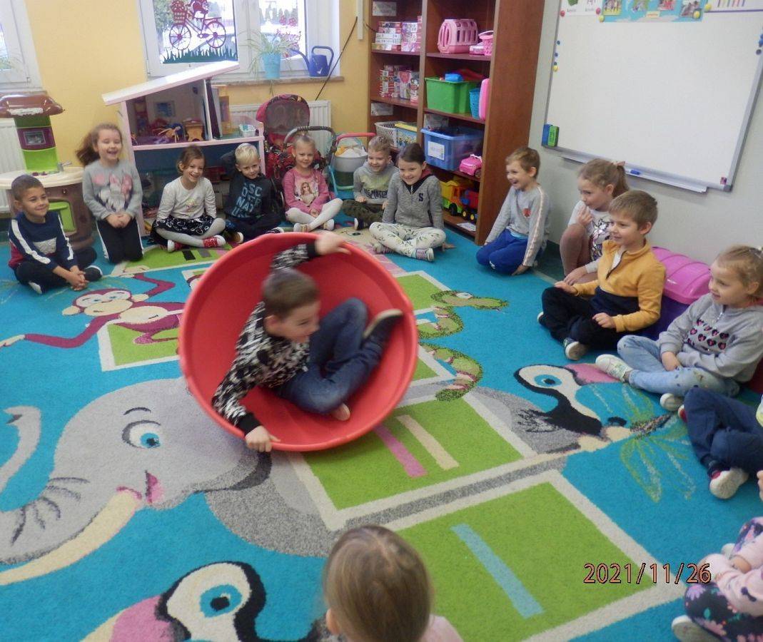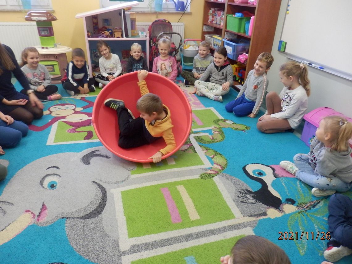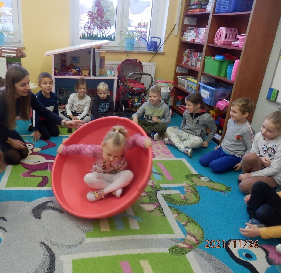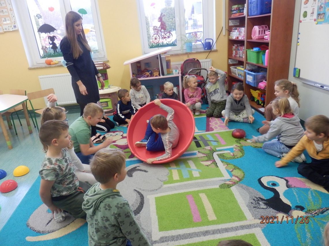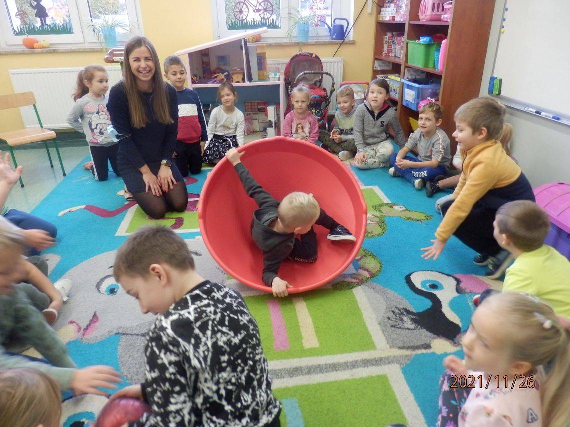 "Pan Maluśkiewicz i wieloryb" to kolejna z książek "Biblioteki Przedszkolaka". Pełną wdzięku i humoru opowieść o niezwykłej morskiej wyprawie najmniejszego człowieka na świecie, przeczytała dzieciom Pani Anna - właścicielka Gabinetu Terapeutycznego "Sensoryk " w Łęczycach. Pani Ania, w swoim gabinecie prowadzi terapię integracji sensorycznej, terapię ręki oraz terapię logopedyczną. Sprawiła dzieciom wielką niespodziankę, przynosząc na zajęcia zabawki do integracji sensorycznej. Przedmioty o różnej fakturze, kształtach, kolorach i wzorach, stymulowały rączki i nóżki oraz pobudzały wyobraźnię dzieci. Największe zainteresowanie wzbudził wirujący stożek, w którym, wbrew pozorom, wcale nie było łatwo się kołysać. Serdecznie dziękujemy Pani Ani za czytelniczo-terapeutyczne spotkanie. Życzymy zadowolenia z wykonywanej pracy oraz wielu pozytywnych efektów terapeutycznych.