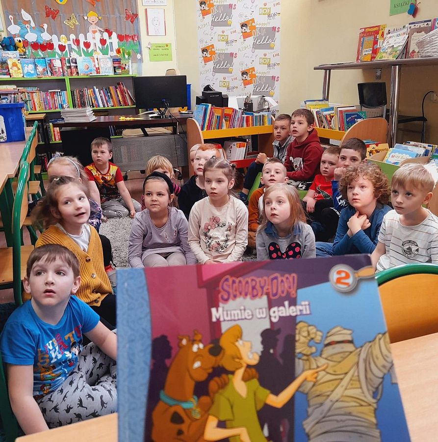 Pani Agnieszka przeczytała dzieciom książkę o przygodach czwórki przyjaciół oraz psa o detektywistycznych zdolnościach imieniem Scooby-Doo ! Przedszkolakom bardzo spodobała się przeczytana książeczka oraz wiele innych zaprezentowanych przez Panie Bibliotekarki.