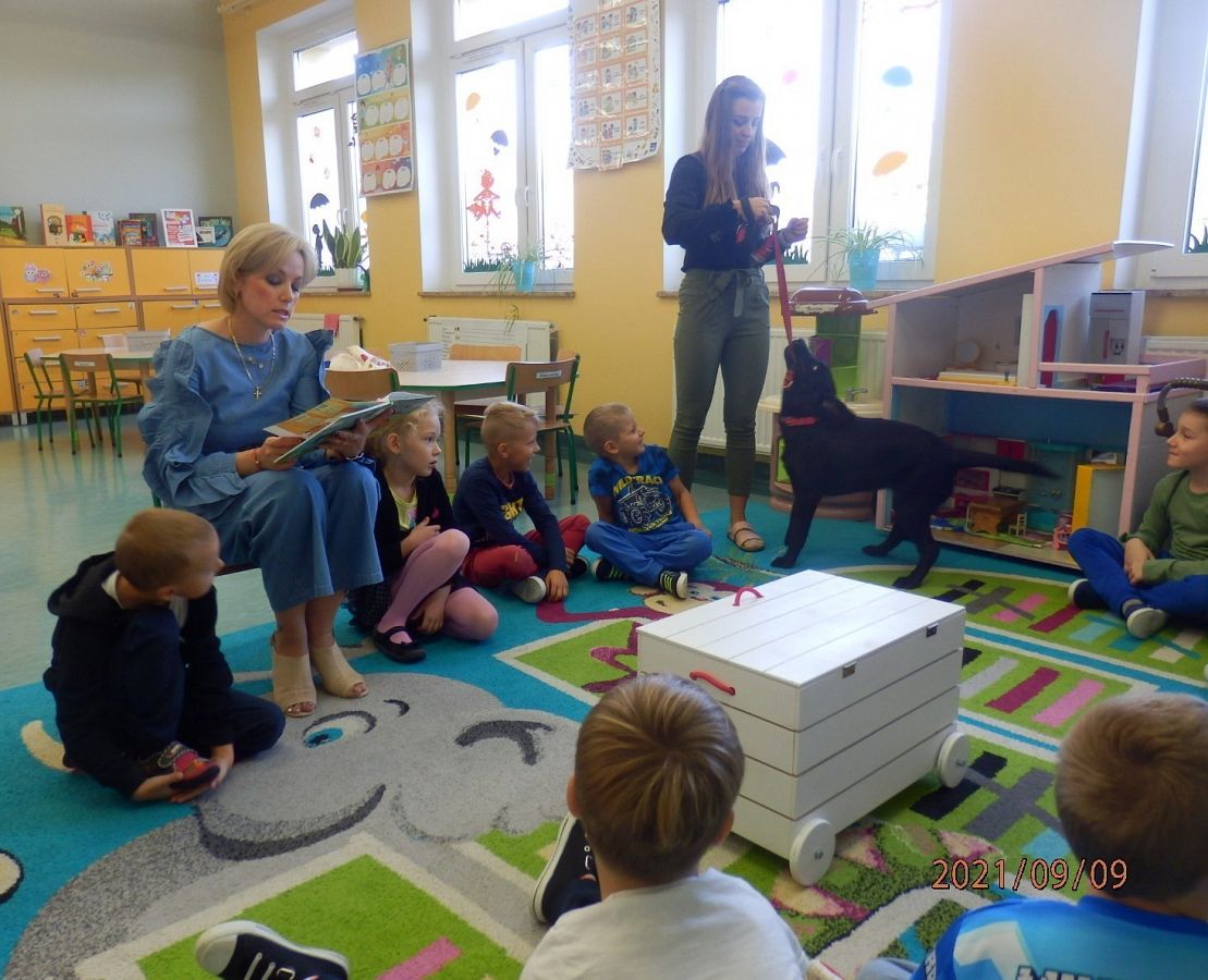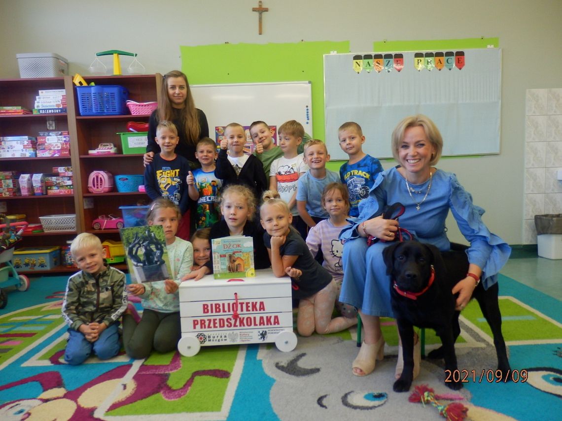 Cykl jesiennych spotkań rozpoczęliśmy 9 września, od lektury „Dżok – legenda o psiej wierności” Barbary Gawryluk, której fragmenty przedszkolakom przeczytała dyrektor szkoły, Pani Magdalena Petta. Dzieci z ciekawością wysłuchały wzruszającej historii psa Dżoka, inspirowanej prawdziwymi krakowskimi zdarzeniami. Opowiedziały również o swoich, nie tylko, psich pupilach, niemniej jednak ich serca skradła labradorka Baja, która również przybyła na spotkanie. Pani dyrektor sprawiła dzieciom ogromną radość, przedstawiając im kilkumiesięczną sunię Baję, czworonożnego wiernego przyjaciela rodziny.