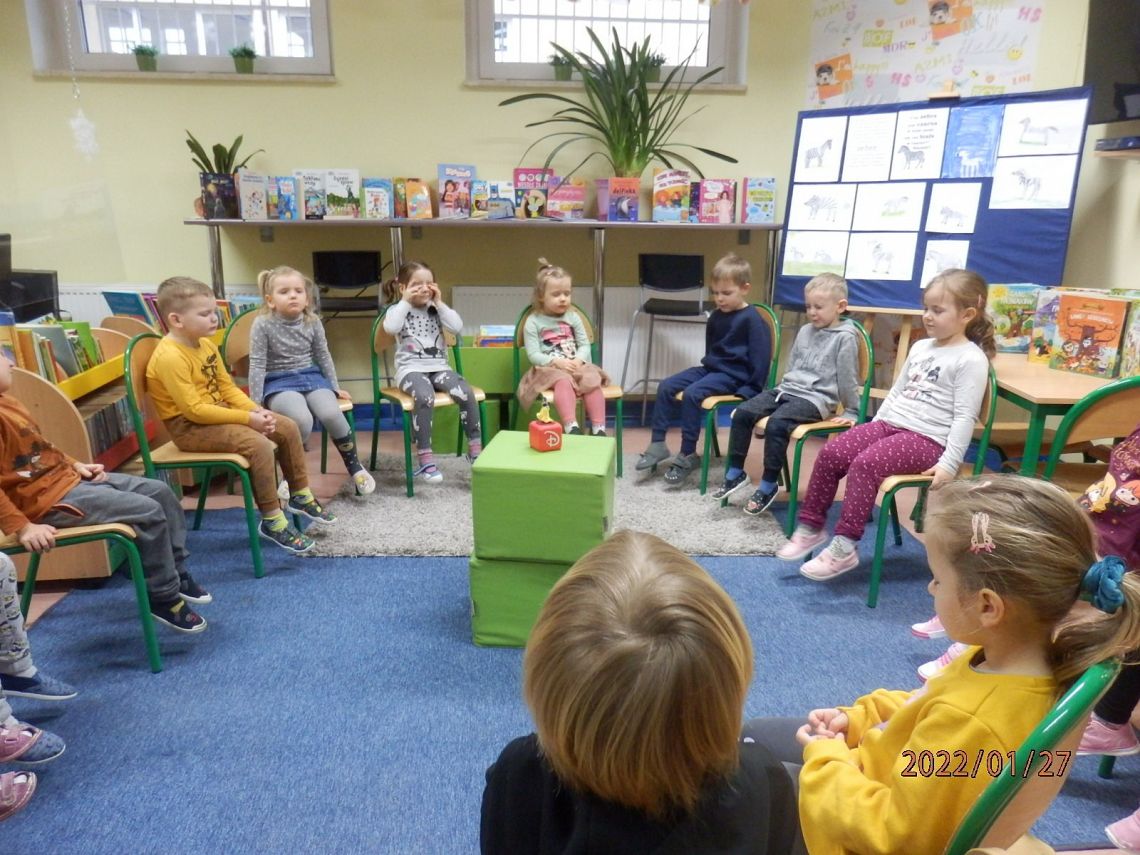W dniu dzisiejszym gościliśmy w bibliotece przedszkolaki z grupy O E. Okazją do spotkania było zbliżające się nietypowe święto, Dzień Łamigłówki. Na początku spotkania przedszkolaki przeniosły się do świata książki. Słuchając baśni o Królewnie Śnieżce, nie mogły się nadziwić, że owa baśń nie była czytana przez Panie Bibliotekarki, tylko przez lektora. Przyjemny dla ucha głos, płynący z podświetlanego głośnika z figurką Królewny Śnieżki, przeniósł dzieci w magiczny świat baśni.