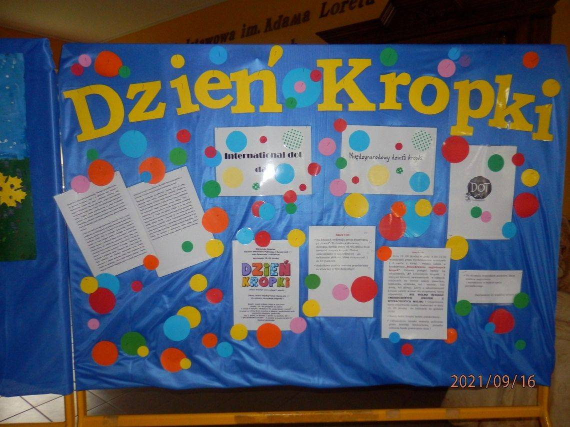 Nasza szkoła świętowała Dzień Kropki na wiele sposobów. Z samego rana Bibliotekę Szkolną i GBP w Łęczycach odwiedziły maluchy z klas „0”, które obejrzały, przygotowany na podstawie książki „Kropka”, teatrzyk kamishibai. Dowiedziały się one również, czym jest kod Morse’a i zobaczyły, jak przy jego użyciu można zaszyfrowywać tytuły książek. Dzieci z najmłodszych klas wzięły udział w konkursie plastycznym pt. „Jesień”. Dla uczniów klas IV-VIII Biblioteka Szkolna wraz z Samorządem Szkolnym oraz GBP przygotowały grę terenową „Poszukiwacze zaginionych kropek”. Kropki pojawiły się tego dnia na szkolnych korytarzach, a także na ubraniach uczniów i nauczycieli. W rywalizacji klas, w kategorii I-III, zwyciężyła klasa II b, II miejsce zajęła III b, III miejsce przypadło klasom I b i II c. W kategorii IV-VIII zwyciężyła IV a, przed VII b oraz klasą VI a.Gratulujemy !