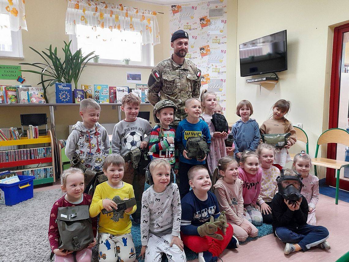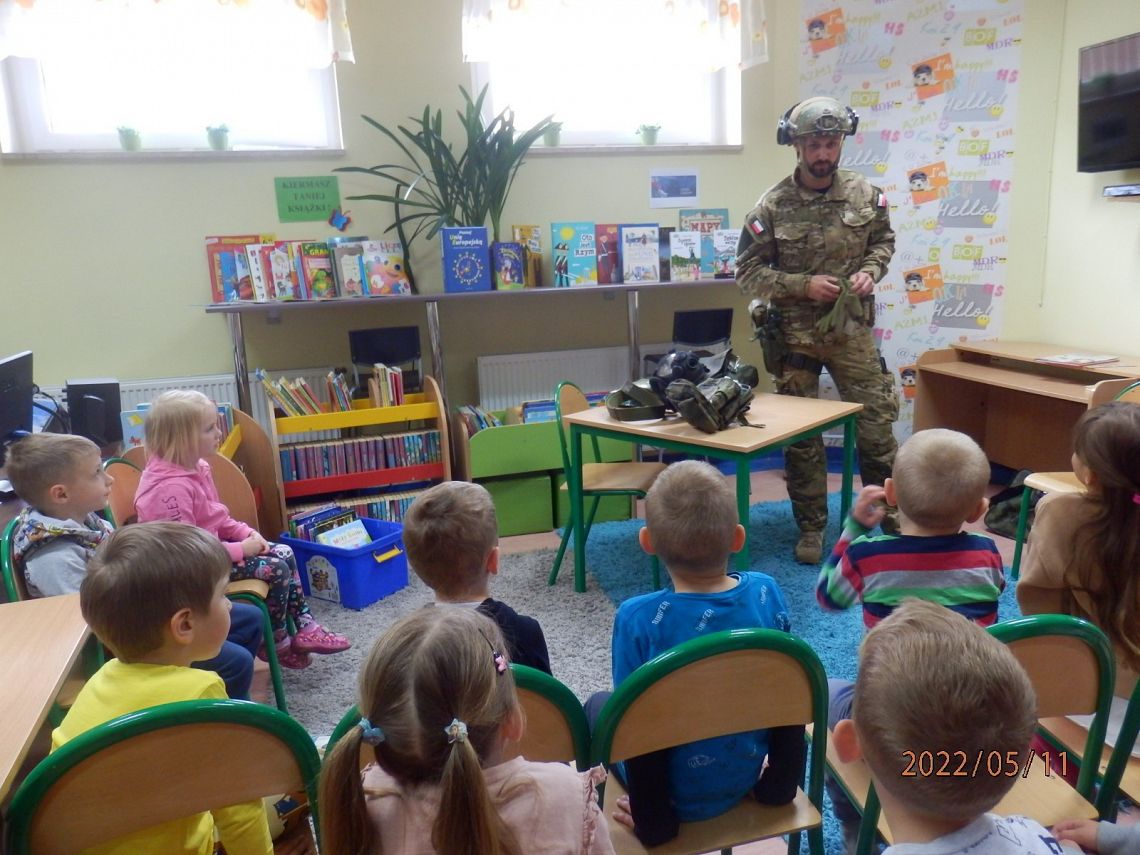 Dzisiaj w bibliotece gościliśmy niezwykłego gościa. Z przedszkolakami grupy 0C, która uczestniczy w projekcie „Magiczna moc bajek”, spotkał się z Pan Michał - strażak i żołnierz pełniący służbę w Ośrodku Szkolenia Poligonowego Wojsk Specjalnych w Strzepczu, prywatnie tata Tosi z tejże grupy.