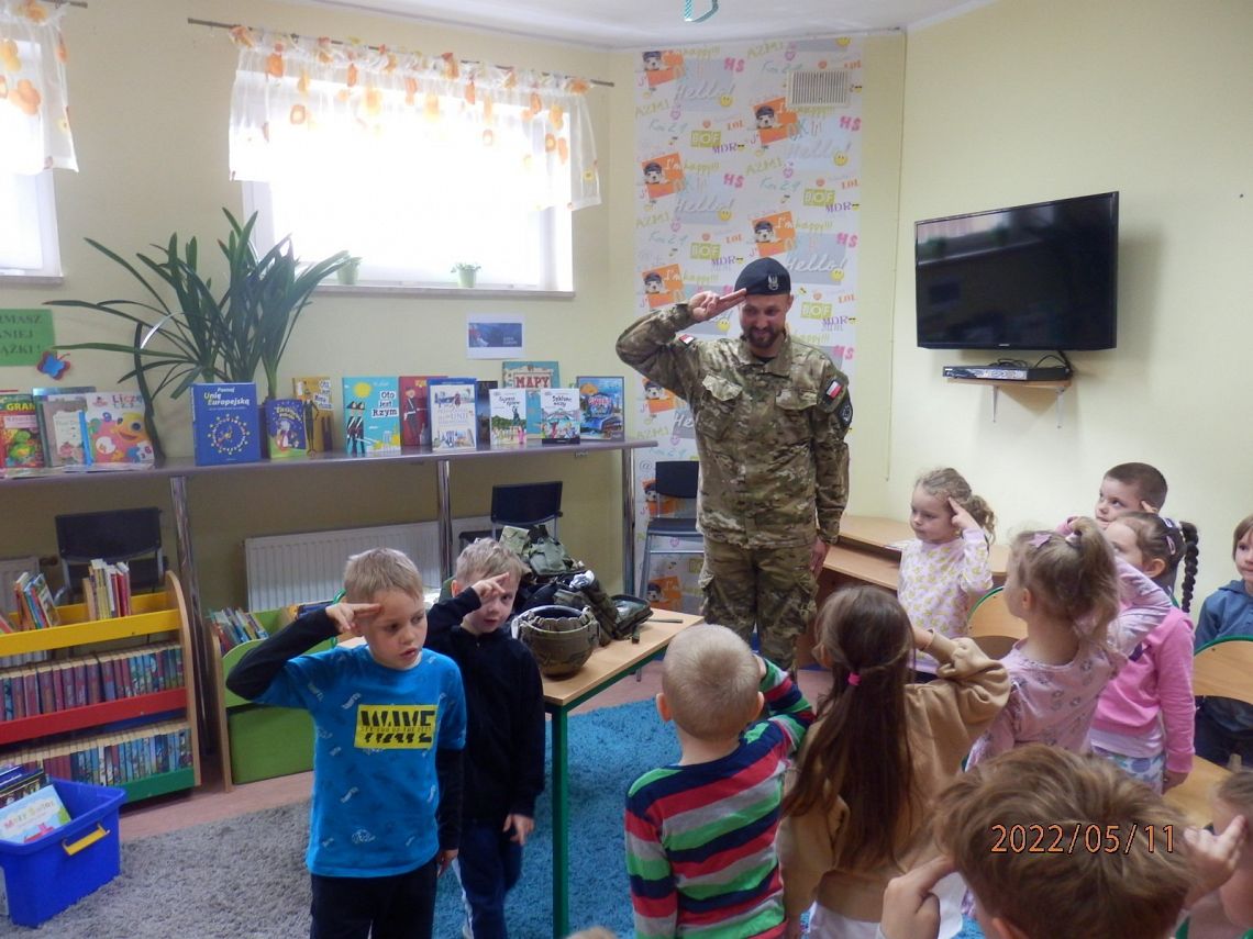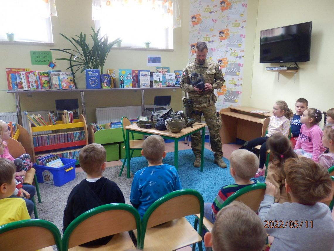 Pan Michał rozpoczął swoją wizytę od snucia opowieści o patriotyzmie - historii zaczerpniętej z książki Marka Michalaka pt.„Opowieści o tym, co w życiu ważne”. Po czytaniu i interesującej dyskusji zaproszony gość, opowiedział dzieciom o swojej służbie, zaprezentował także własny mundur. Największe zainteresowanie wzbudził jednak żołnierski ekwipunek - hełm, maska przeciwgazowa, kamizelka kuloodporna, słuchawki, pas wojskowy, a nawet racja żywnościowa. Każdy chętny przedszkolak, przymierzając różne nakrycia głowy i inne żołnierskie elementy, choć przez chwilę mógł się poczuć jak prawdziwy żołnierz. Uczniowie dowiedzieli się również, co żołnierze robią na poligonie i jakie przybierają tam barwy maskujące, a na koniec spotkania mieli okazję nauczyć się salutować.