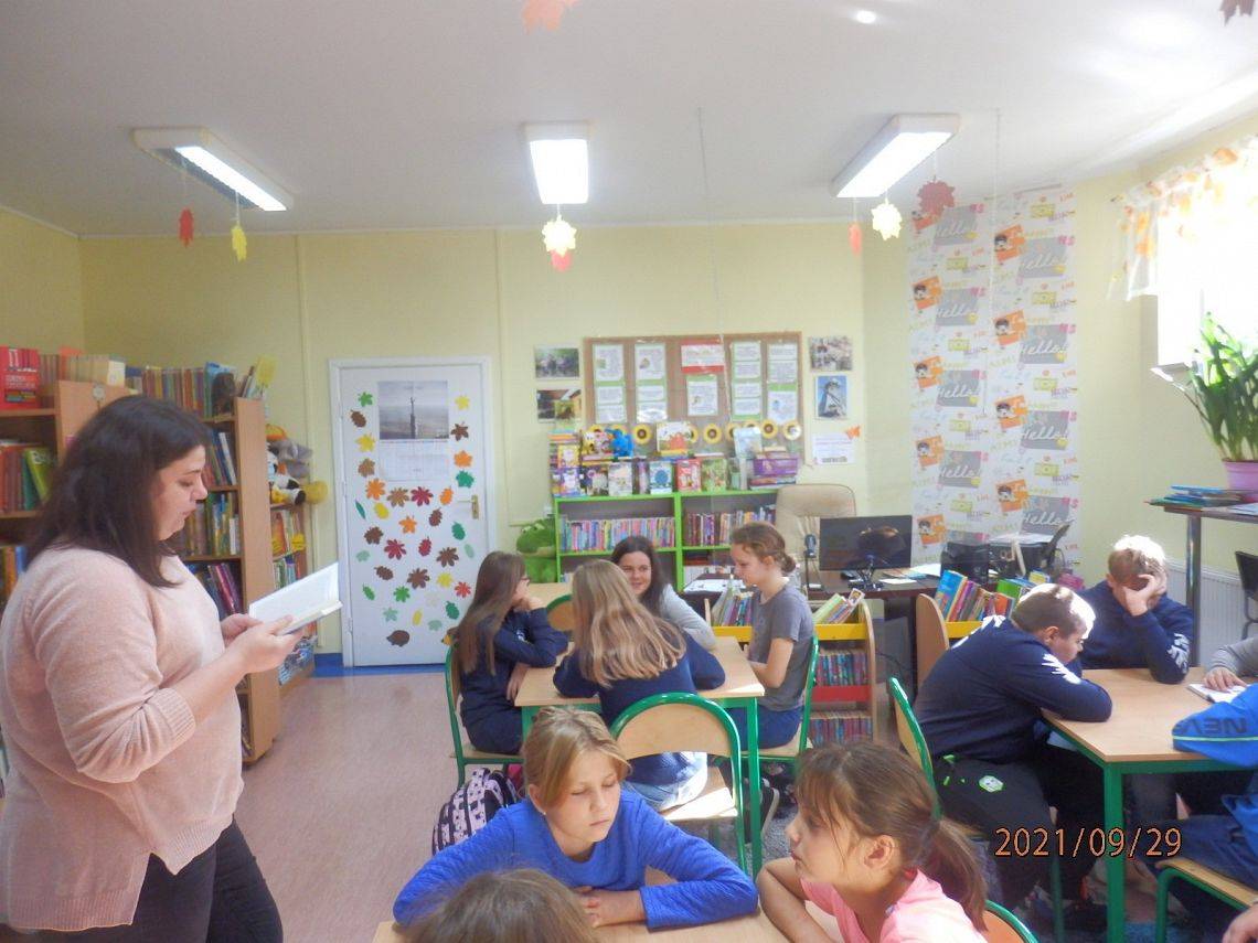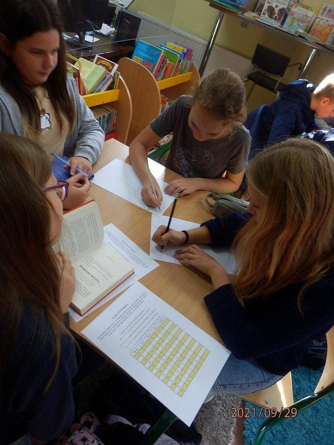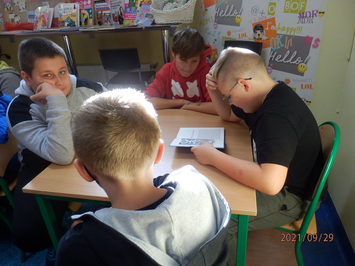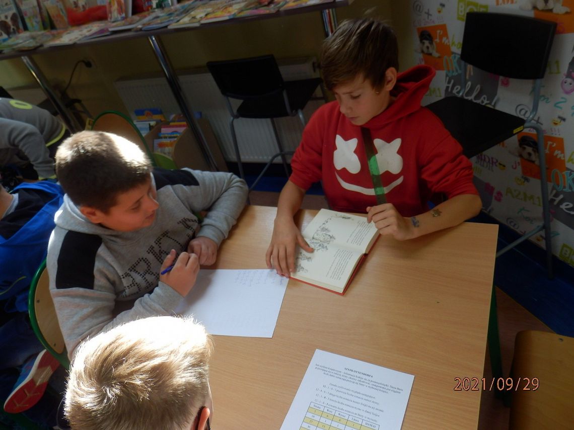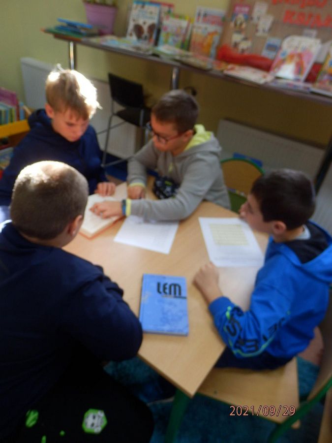 Tego dnia w bibliotece z „Bajkami robotów” Stanisława Lema zapoznali się uczniowie klasy VI a. Była to również okazja do świętowania setnej rocznicy urodzin pisarza, które przypadały 2 września. W „Bajkach robotów” autor znakomicie połączył motywy baśniowe z elementami właściwymi dla fantastyki naukowej. Uczniowie przeczytali fragmenty książki o trzech elektrycerzach, i jak sami przyznali …nie było wcale łatwo. Niewątpliwą atrakcją była dalsza część spotkania. Pani Agnieszka z Biblioteki Publicznej przedstawiła uczniom różne sposoby kodowania informacji, po czym przystąpili oni do szyfrowania kodem Ottendorfa (dla niewtajemniczonych - szyfrem książkowym). Zabawa z kodem zintegrowała grupę, a niektórych na tyle zainteresowała, że postanowili zagłębić tajniki kodowania w domu, wykorzystując przygotowane dla nich materiały.