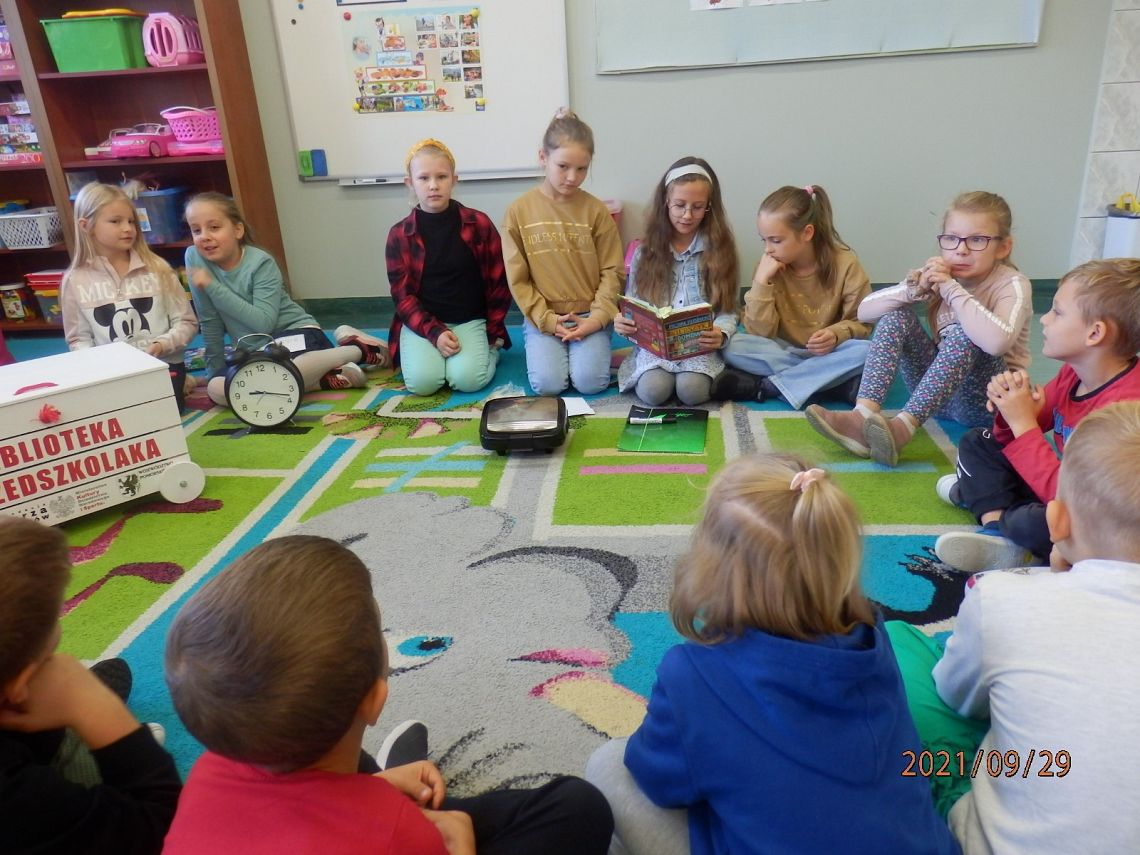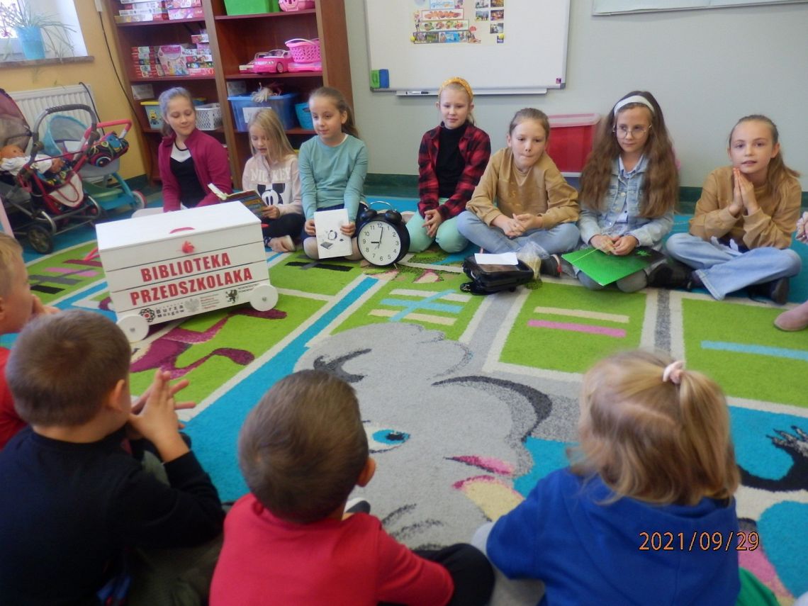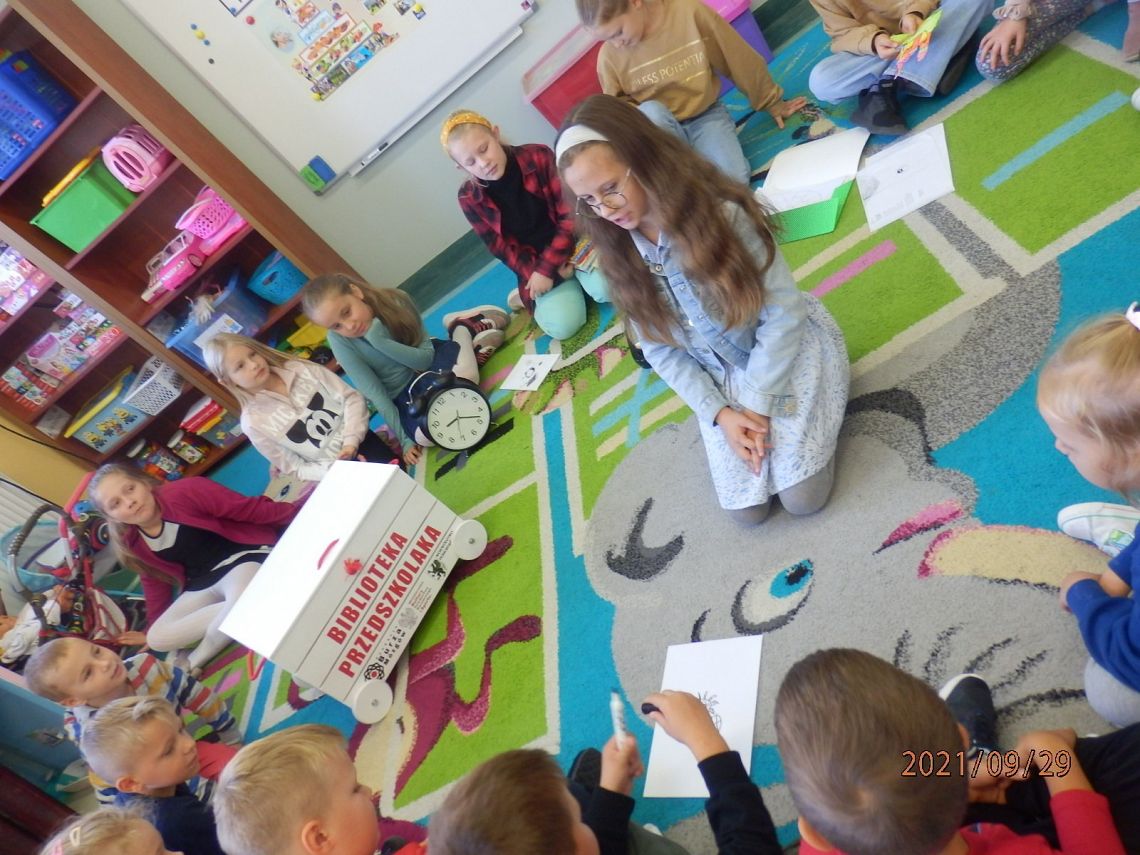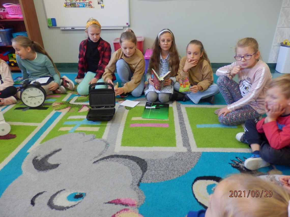 Dziewczynki przeczytały dzieciom wierszyki z książki Michała Rusinka „Wierszyki domowe”. Bardzo wesołe i wpadające w ucho wierszyki o otaczających nas rzeczach. Przyniosły na spotkanie rekwizyty min. ogromny budzik i toster, przygotowały pytania oraz zadania. Za ciekawe przeprowadzenie swojej pierwszej lekcji, prowadzące otrzymały od przedszkolaków niespodzianki, za które serdecznie dziękują.