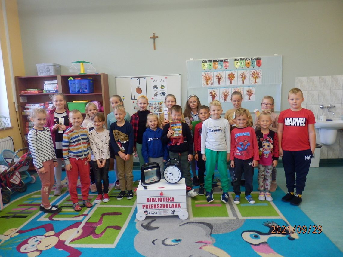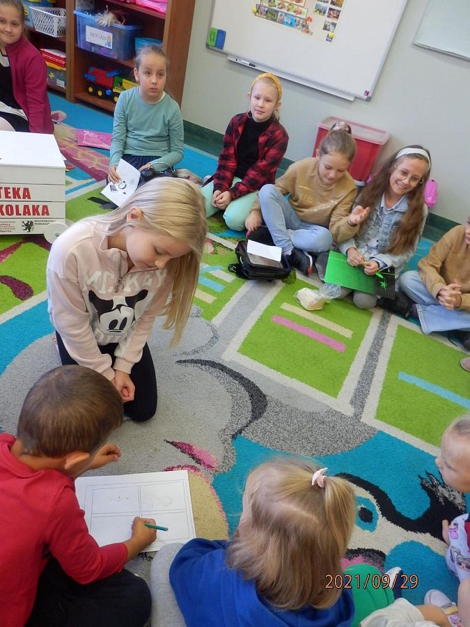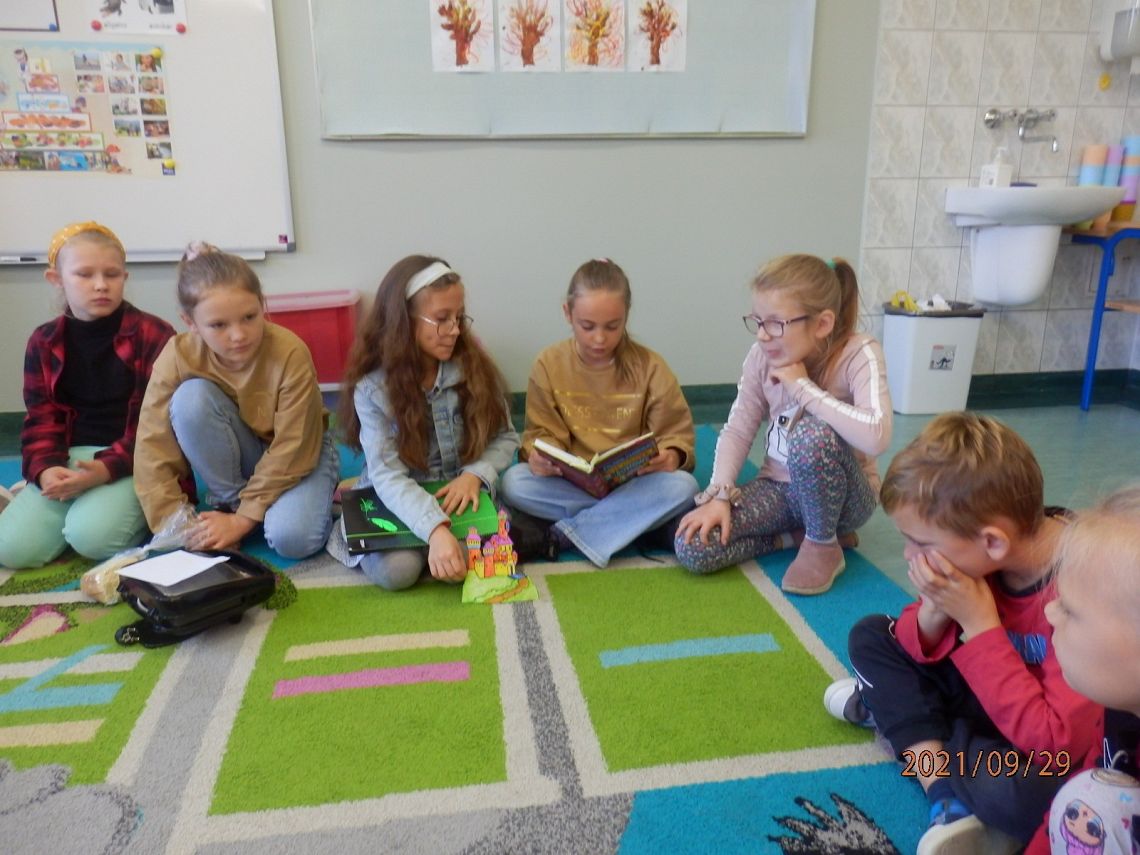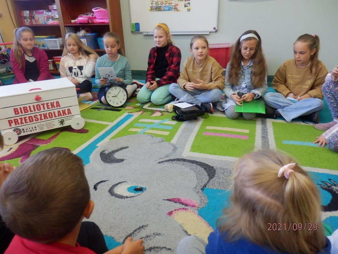 Dziewczynki przeczytały dzieciom wierszyki z książki Michała Rusinka „Wierszyki domowe”. Bardzo wesołe i wpadające w ucho wierszyki o otaczających nas rzeczach. Przyniosły na spotkanie rekwizyty min. ogromny budzik i toster, przygotowały pytania oraz zadania. Za ciekawe przeprowadzenie swojej pierwszej lekcji, prowadzące otrzymały od przedszkolaków niespodzianki, za które serdecznie dziękują.