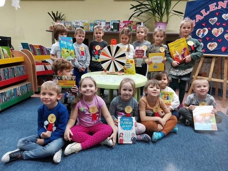 Za przedszkolakami z grypy 0 C kolejne zajęcia w ramach projektu „Magiczna moc bajek”. Tym razem Panie Bibliotekarki zaprosiły dzieci do biblioteki na quiz wiedzy o zasadach dobrego wychowania pt. „ Mistrz dobrych manier”. Zanim maluchy przystąpiły do zabawy, wysłuchały listu od Misia Uszatka, który przeczytała im pani Agnieszka. Następnie, kręcąc kołem fortuny, dzieci losowały dla siebie pytania dotyczące zasad dobrego zachowania. Na wszystkie odpowiadały celująco, dlatego, na zakończenie spotkania otrzymały odznaki „Mistrzów Dobrych Manier”.