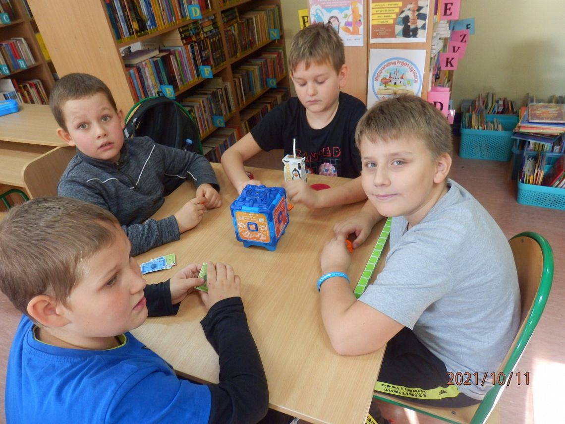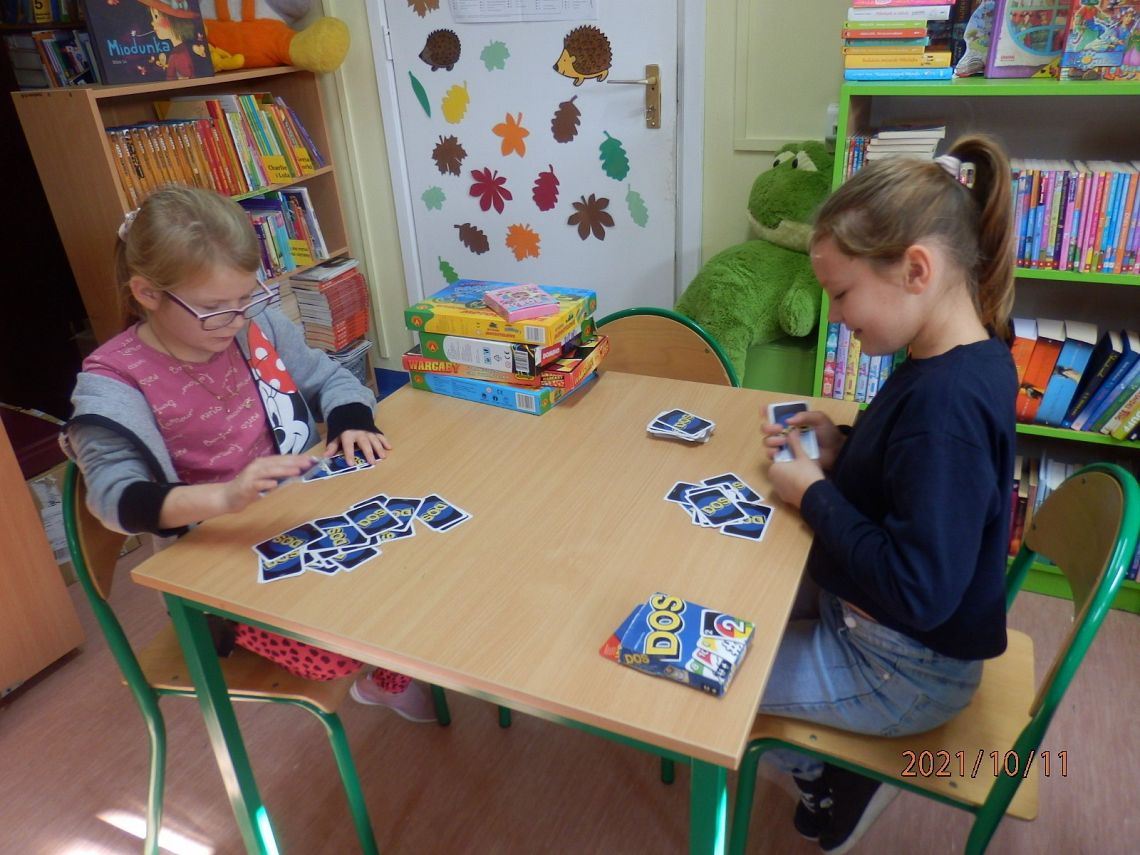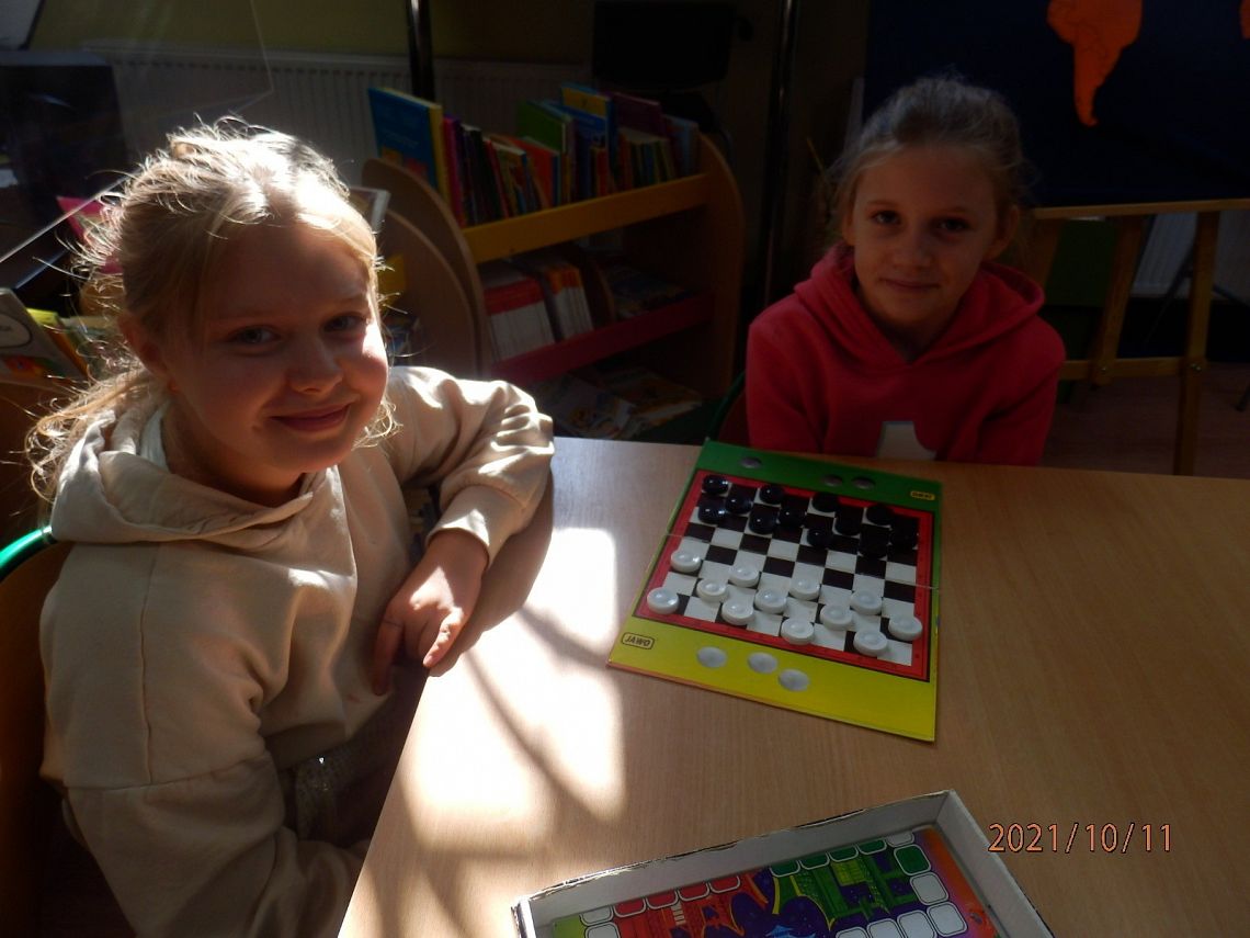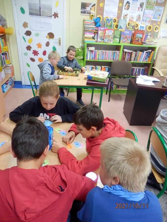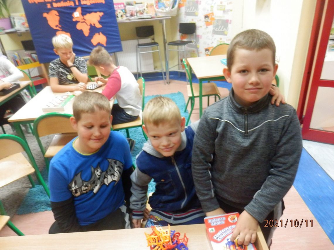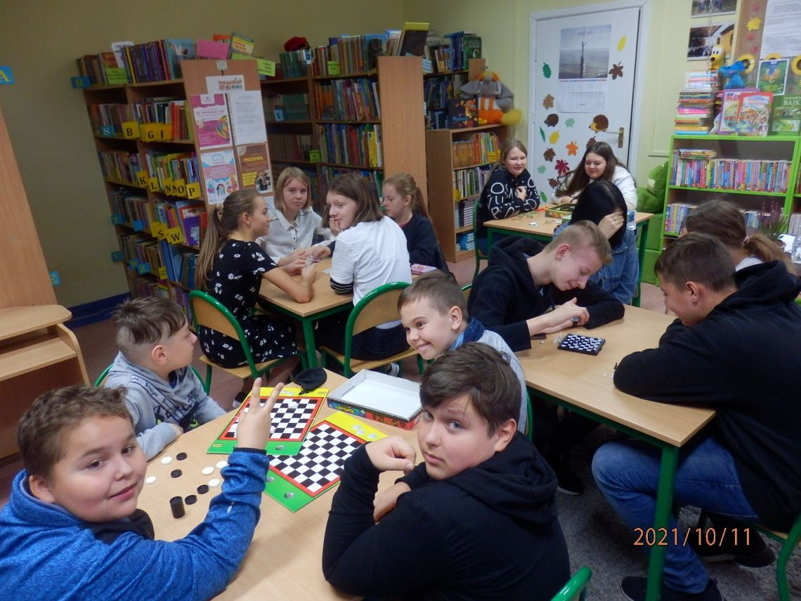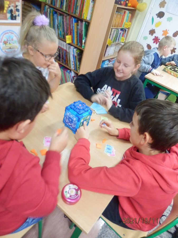10 października obchodziliśmy Dzień Gier Planszowych. Z tej okazji w poniedziałek, w obu bibliotekach na wszystkich przerwach! spotykali się miłośnicy gier planszowych. Gry cieszyły się ogromnym powodzeniem. Przy jednym stoliku grupa uczniów skupiła się na grze ”Skok na bank” emocjonującej grze interaktywnej, która trzymała w napięciu do samego końca…. a raczej do kolejnego dzwonka na lekcje. Przy drugim, młodsi i starsi łapali karalucha grając w zręcznościową” La Cucaracha”. Jedni zagrali w Uno inni w „Statki” , a jeszcze inni uczyli się cierpliwości rozrzucając i zbierając „Bierki” oraz układając wieżę z krzesełek. Dużym zainteresowaniem cieszył się również „Chińczyk ” rozłożony na podłodze oraz „Warcaby” i „Szachy”.