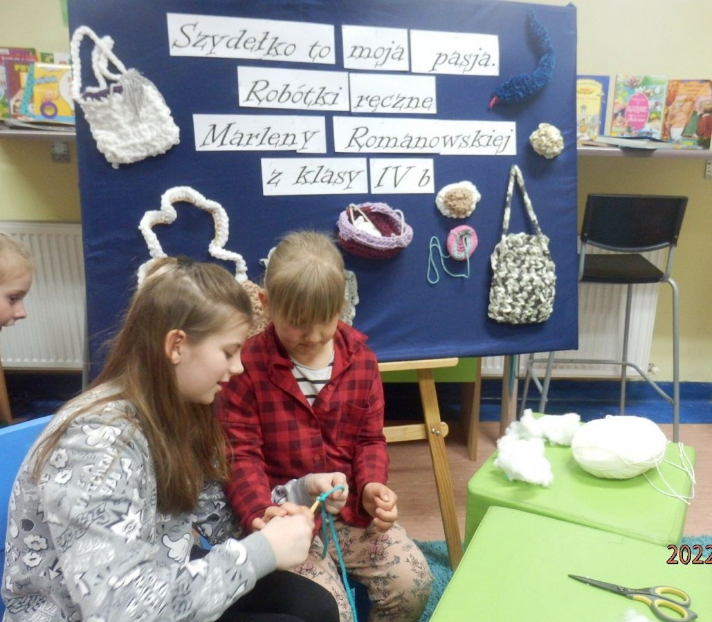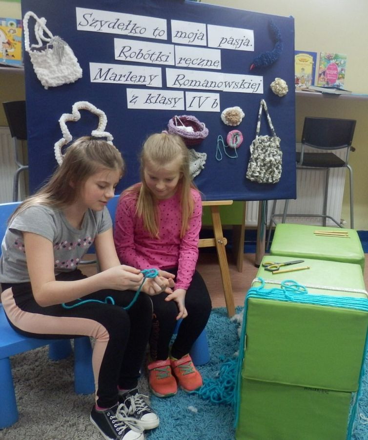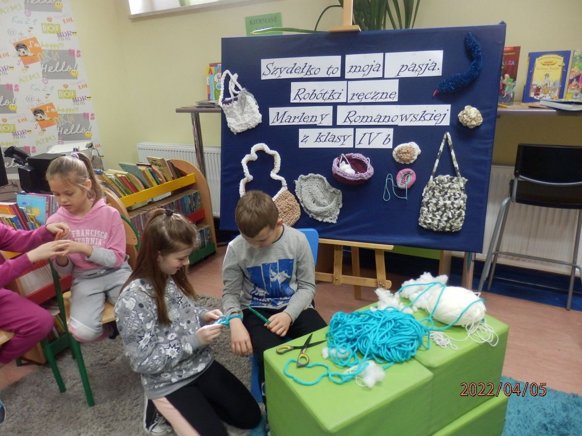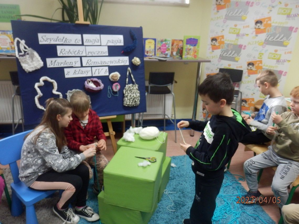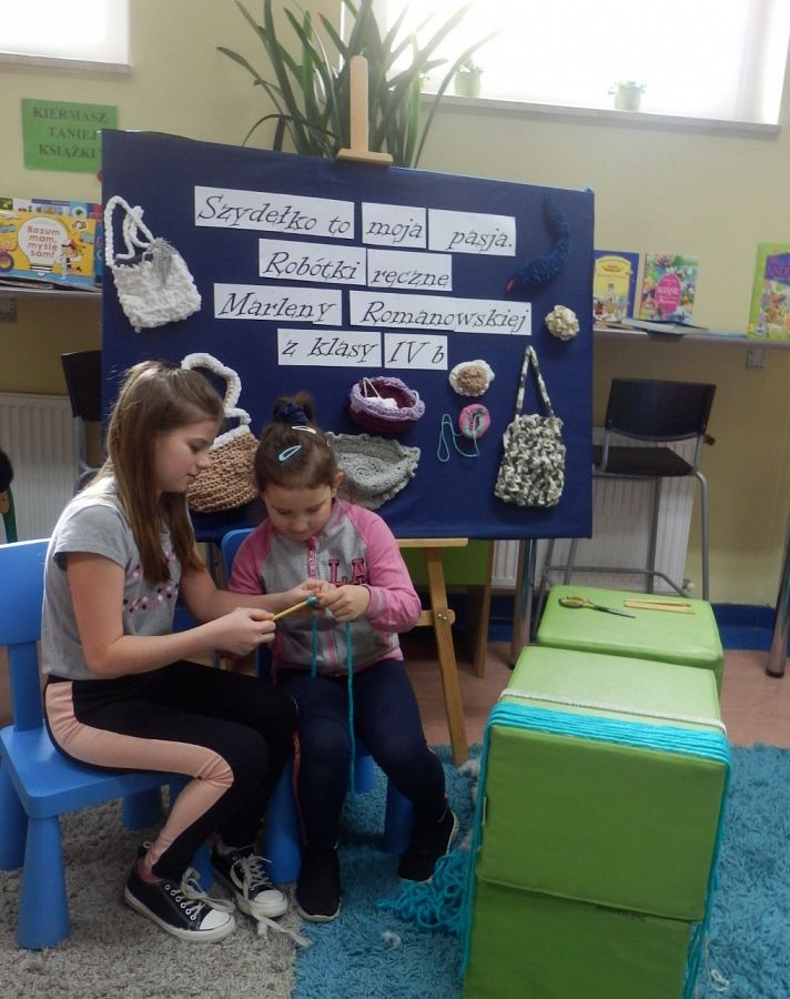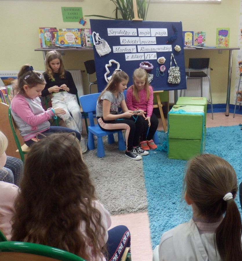 Dzisiaj w bibliotece na uczniów z klas I czekała miła niespodzianka. Mogli poznać tajniki szydełkowania, które przekazała im – na co dzień uczennica kasy IV, w czasie wolnym – miłośniczka szydełka – Marlena.