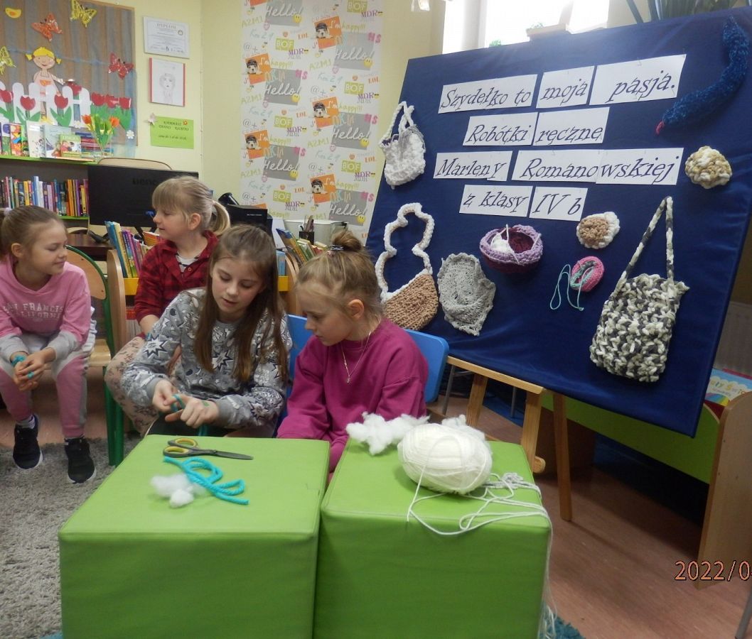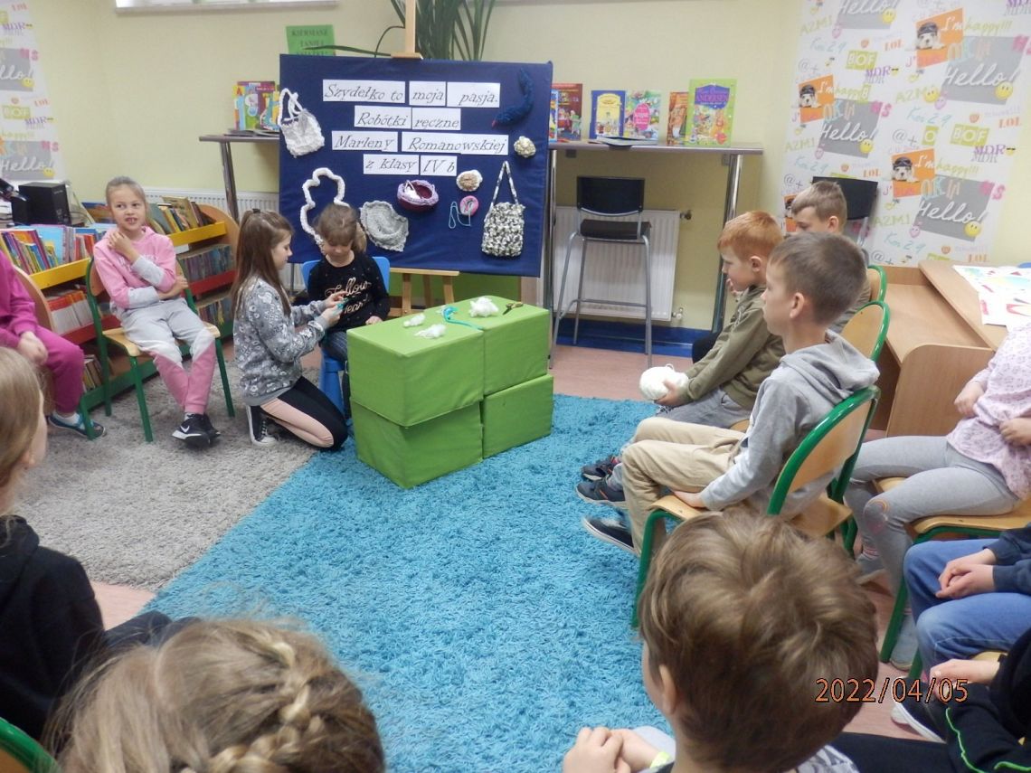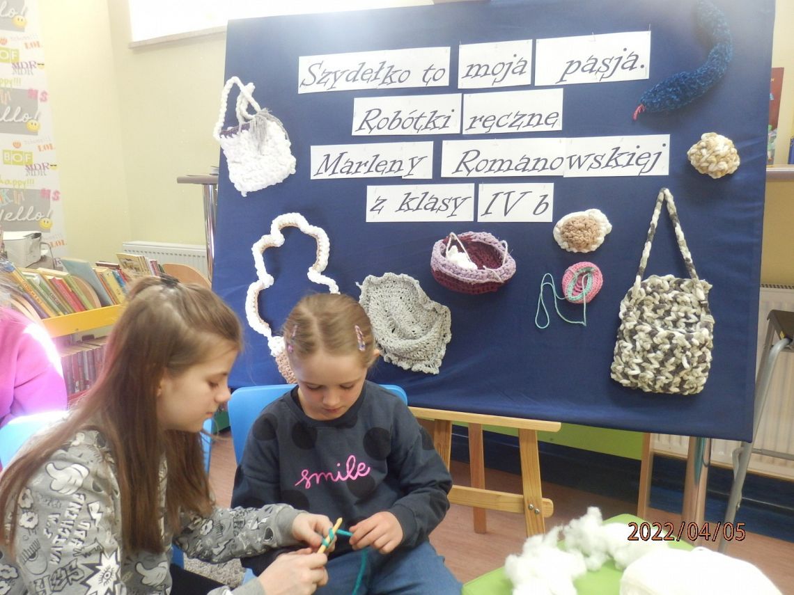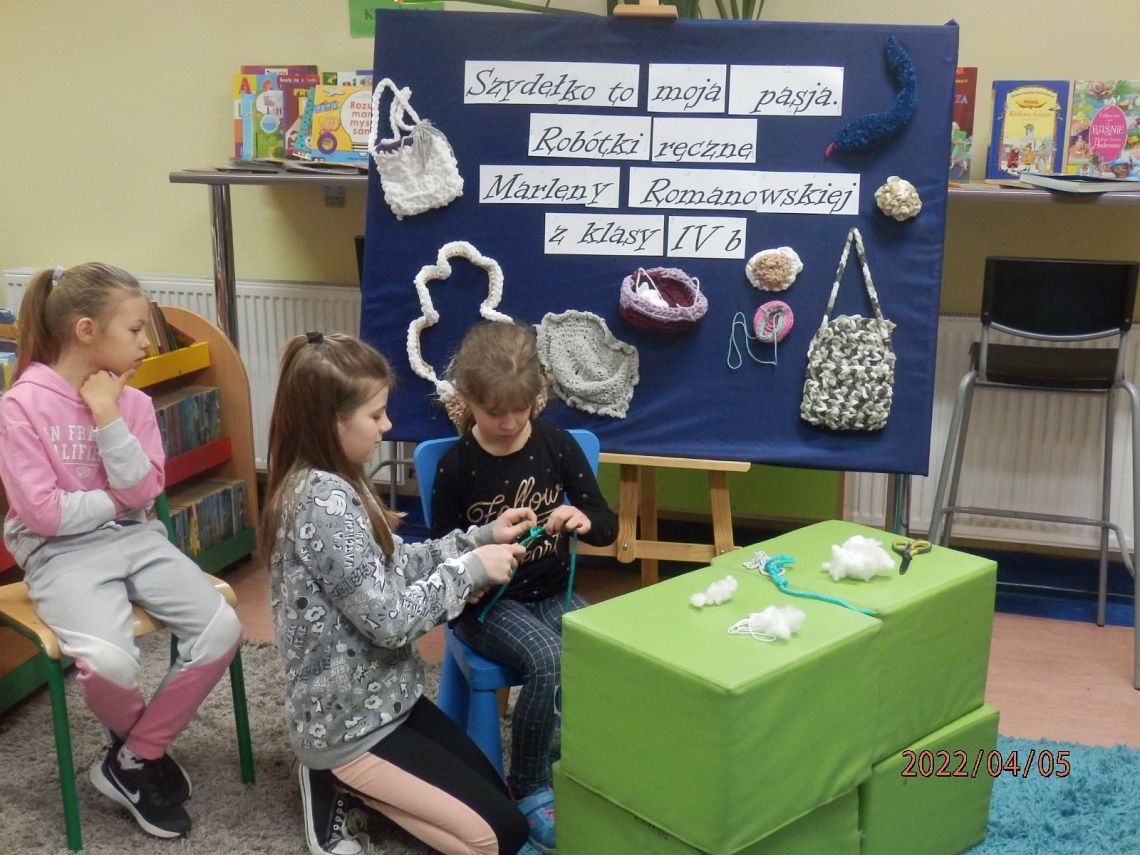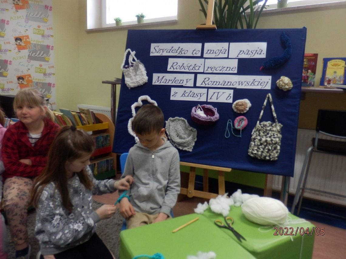 Dzisiaj w bibliotece na uczniów z klas I czekała miła niespodzianka. Mogli poznać tajniki szydełkowania, które przekazała im – na co dzień uczennica kasy IV, w czasie wolnym – miłośniczka szydełka – Marlena.