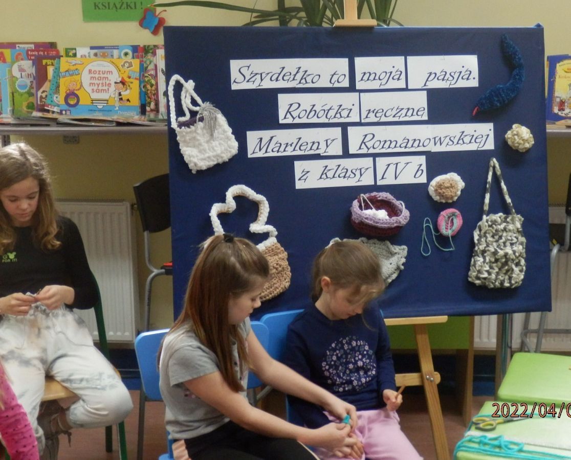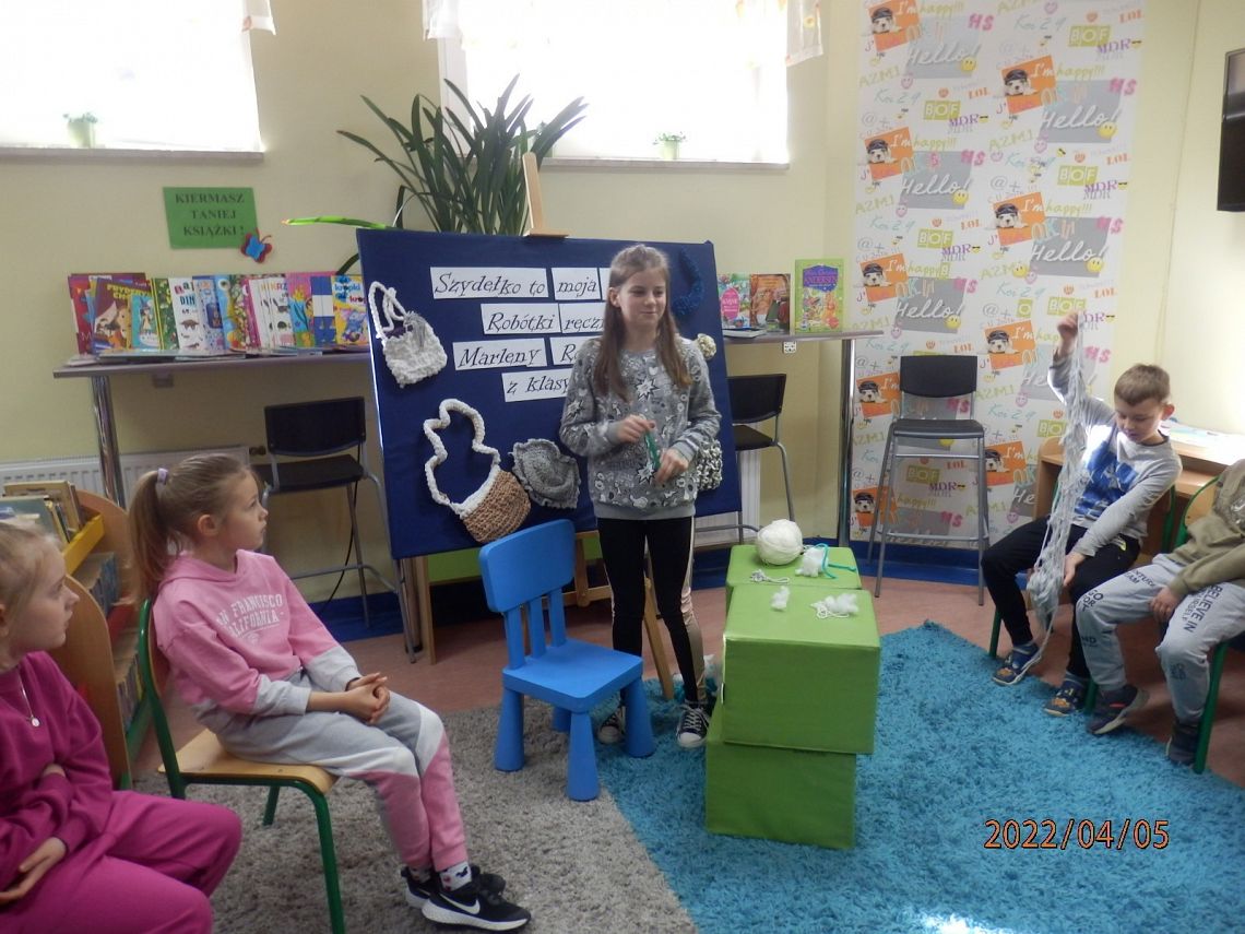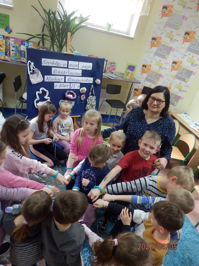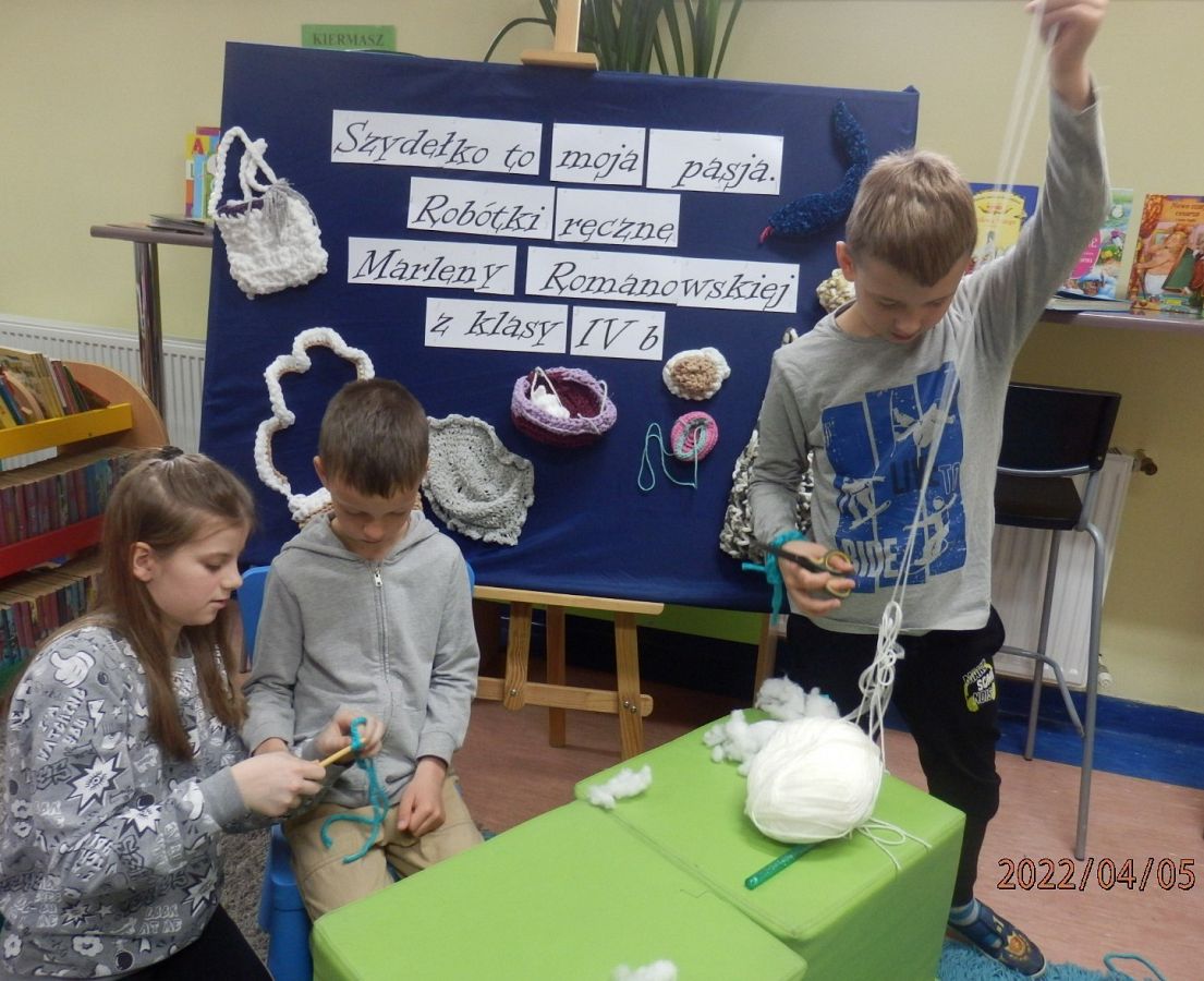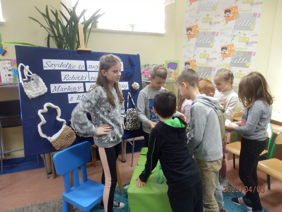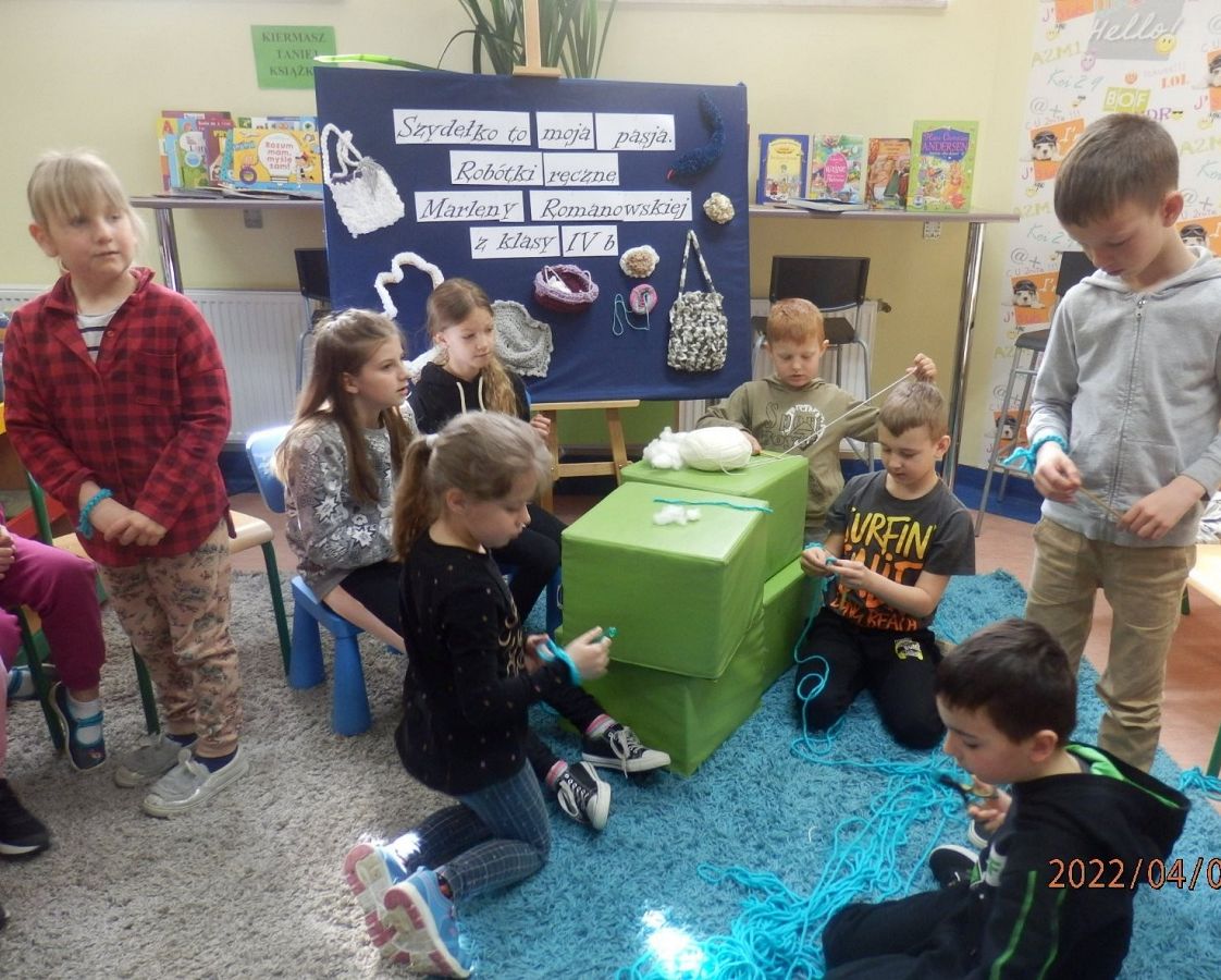 Dzisiaj w bibliotece na uczniów z klas I czekała miła niespodzianka. Mogli poznać tajniki szydełkowania, które przekazała im – na co dzień uczennica kasy IV, w czasie wolnym – miłośniczka szydełka – Marlena.