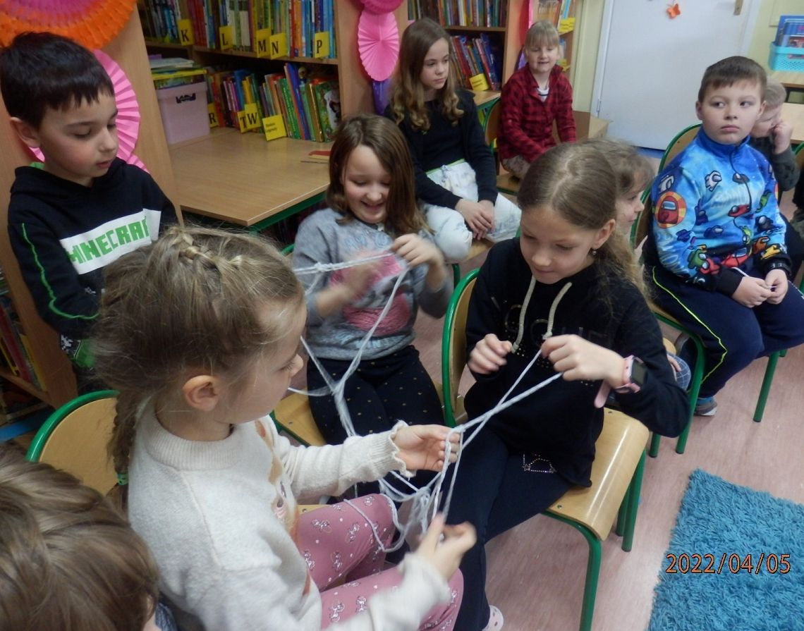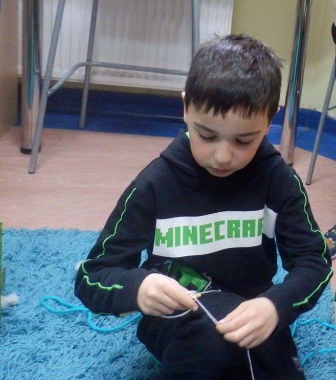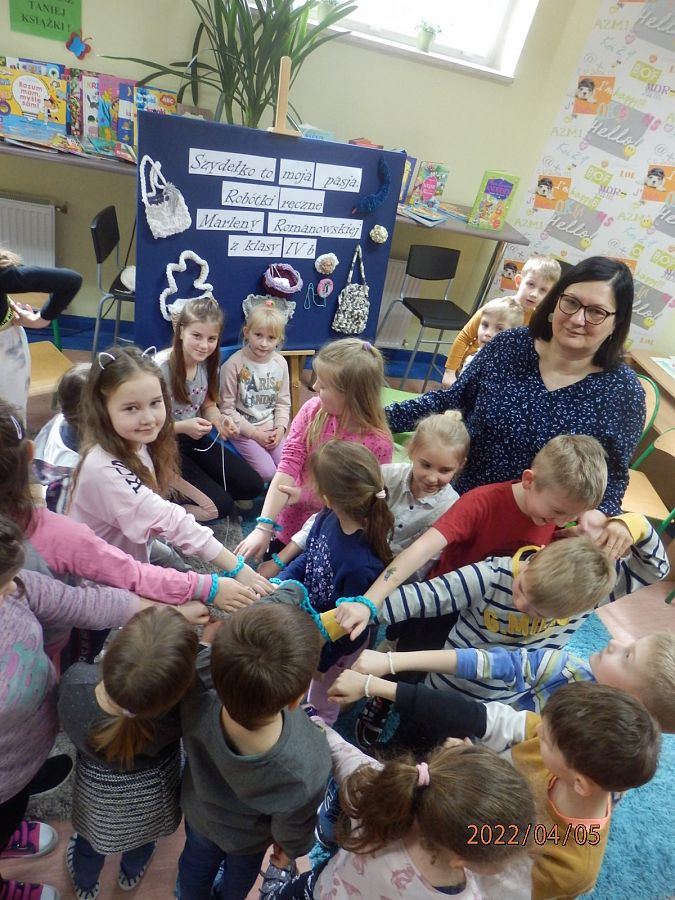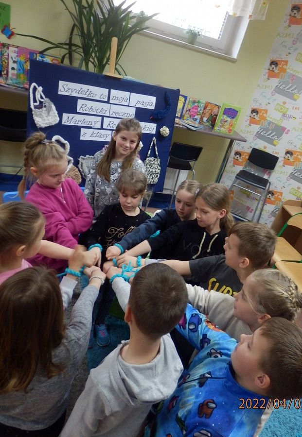 Podczas zajęć uczennica nawiązała znakomity kontakt z młodszymi kolegami i koleżankami, i nauczyła ich prostego ściegu z którego powstały bransoletki! I to jakie ! Własnoręcznie wykonane !
