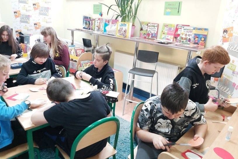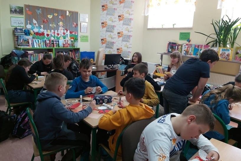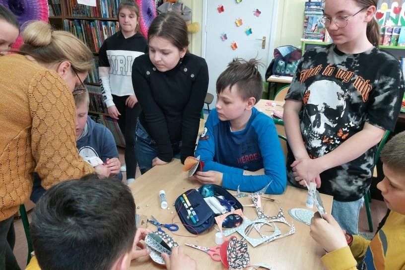 Dzisiaj w bibliotece odbyły się kolejne warsztaty wielkanocne. W kreatywnym spotkaniu uczestniczyła klasa 5 b, która swoją obecność zawdzięczała wygranej w szkolnym konkursie na „Najciekawszą gazetkę wiosenną”. Voucher ufundowany przez Gminną Bibliotekę Publiczną w Łęczycach w dniu dzisiejszym został zrealizowany!!! Uczniowie, pod czujnym okiem Pani Kornelii, wykonali nietypowe, bo papierowe pisanki, które niewątpliwie wprowadziły ich w świąteczny nastrój.
