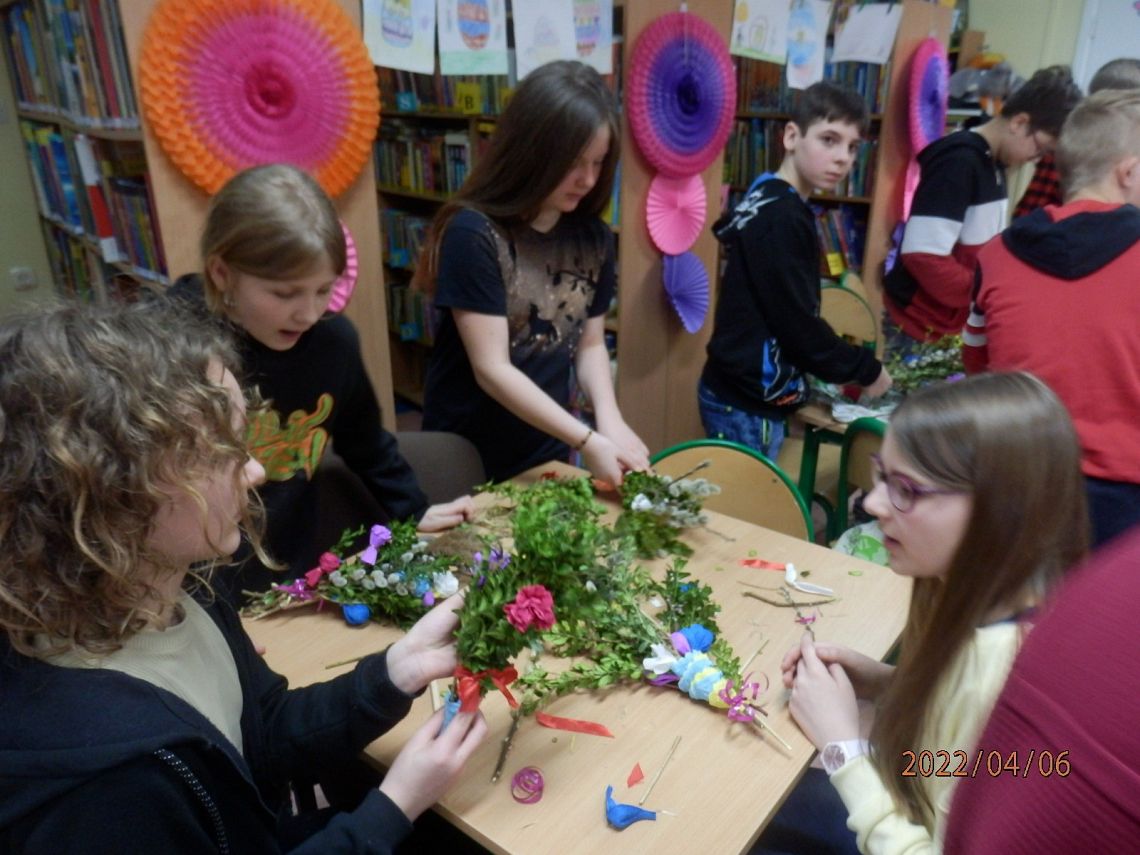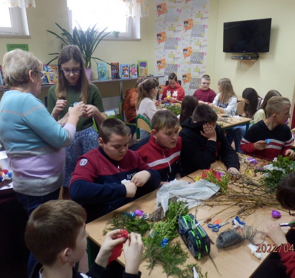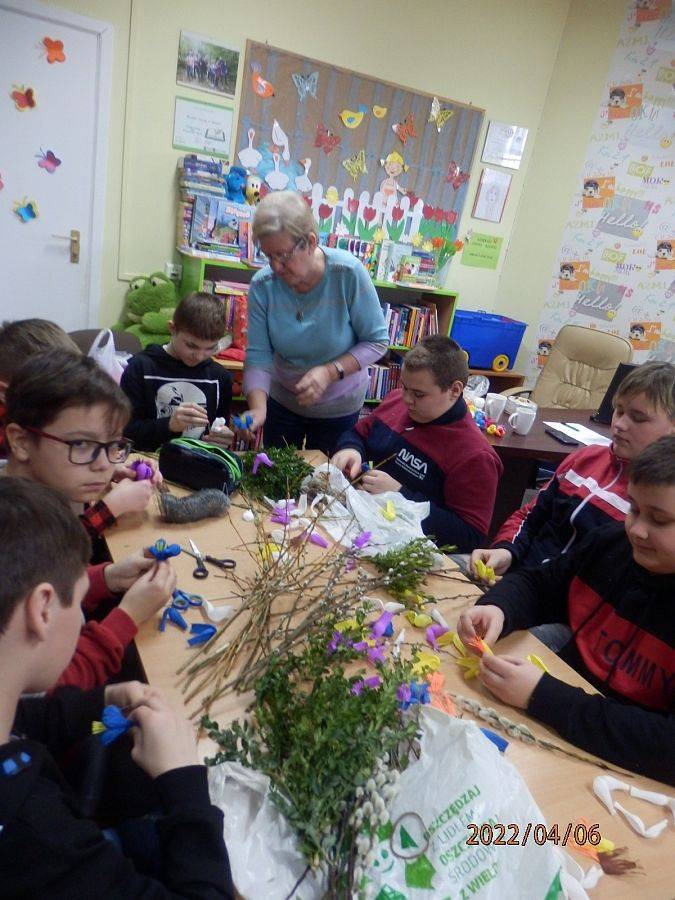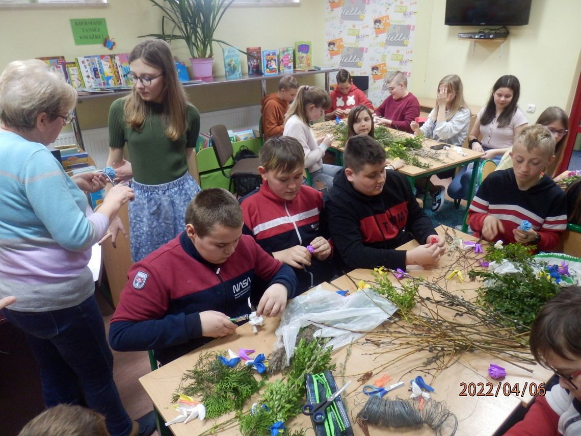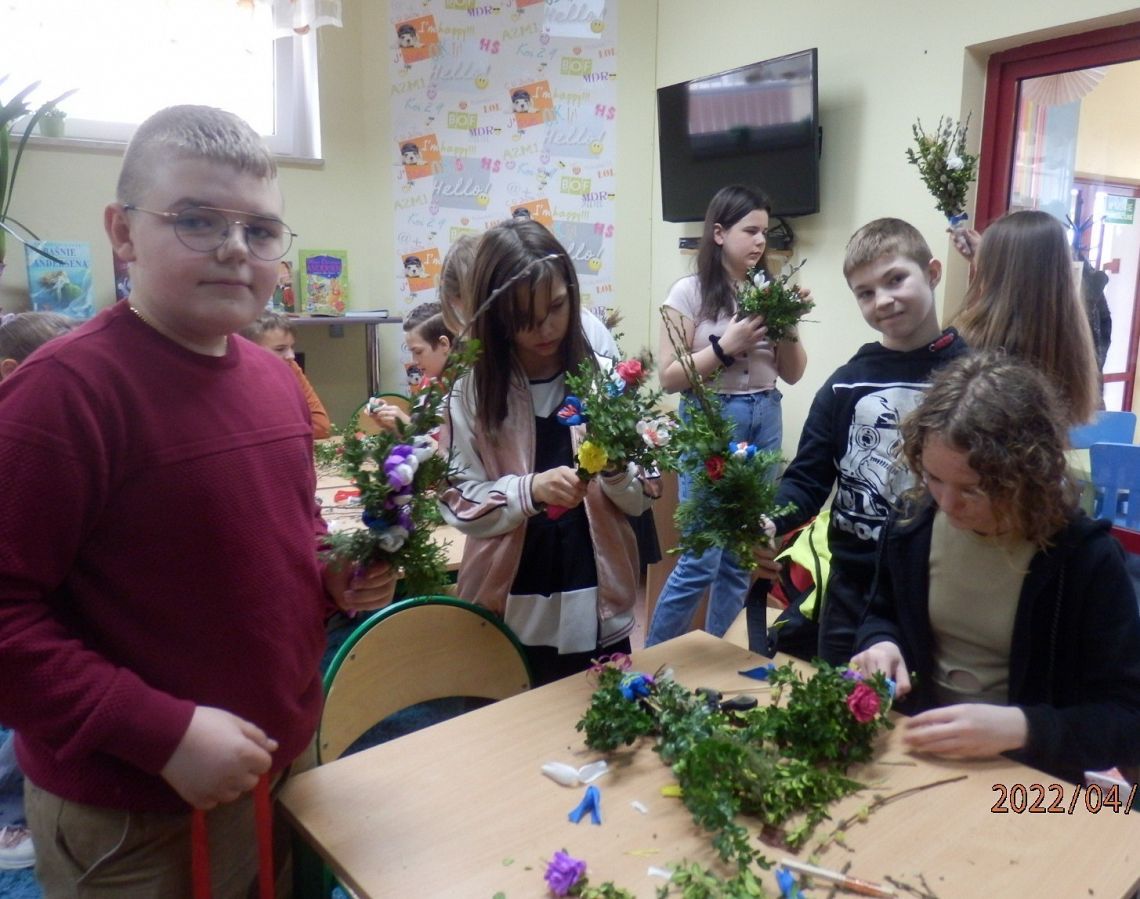 Zbliżające się Święta Wielkanocne to okazja, aby przypomnieć sobie polskie zwyczaje świąteczne. Z tradycją tworzenia palm wielkanocnych zapoznała dzisiaj uczniów klasy VI a Pani Alicja Godzisz z Łęczyc. Pani Alicja już wielokrotnie dzieliła się z uczniami naszej szkoły swoimi umiejętnościami plastycznymi. Dzisiaj pokazała, jak z gałązek oraz kolorowej krepiny wyczarować piękne palemki. Dzieci wykazały się dużym zapałem i kreatywnością, dlatego wykonane przez nich oryginalne palmy, z pewnością będą ozdobą wielu wielkanocnych stołów.
