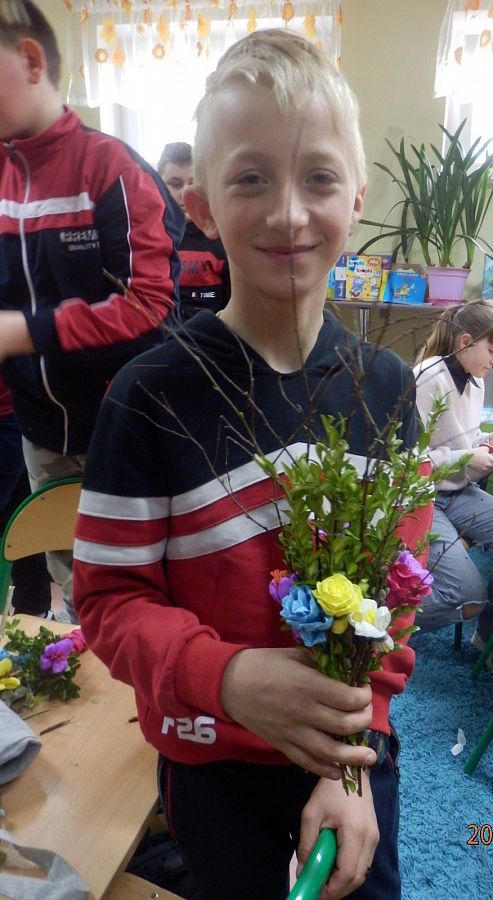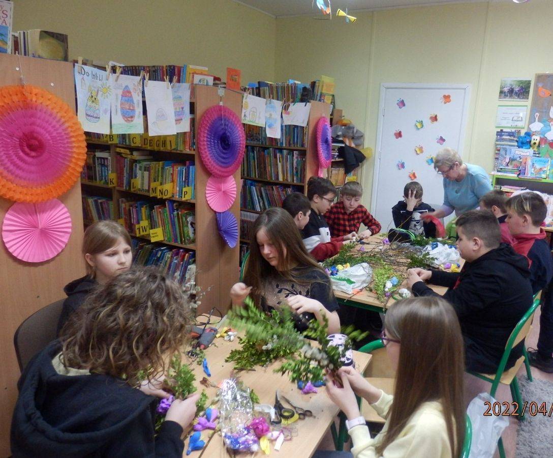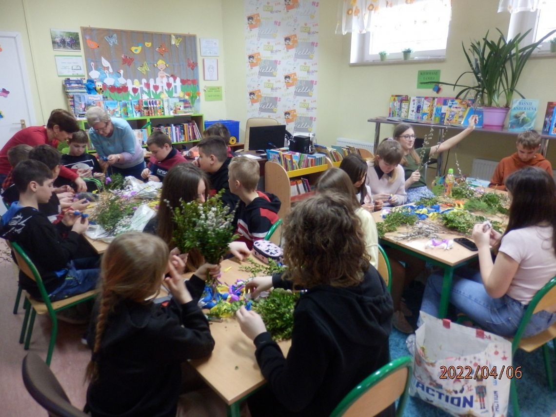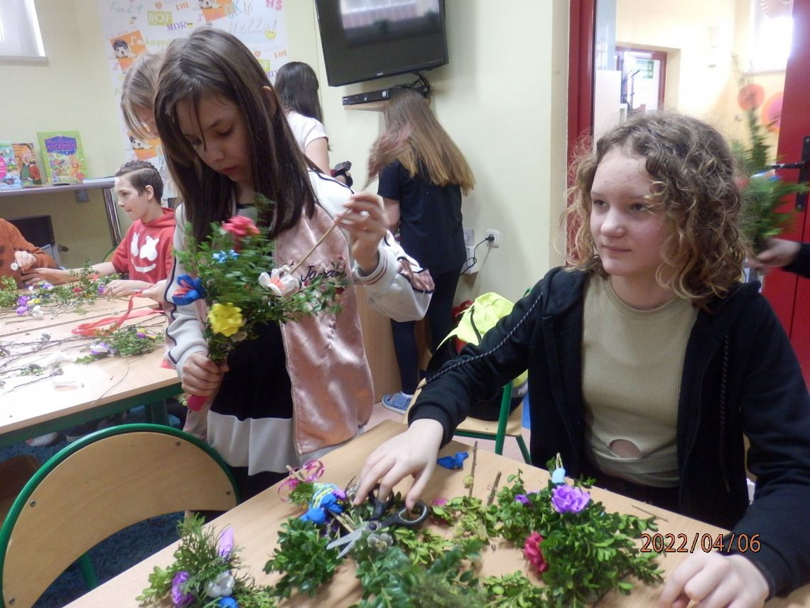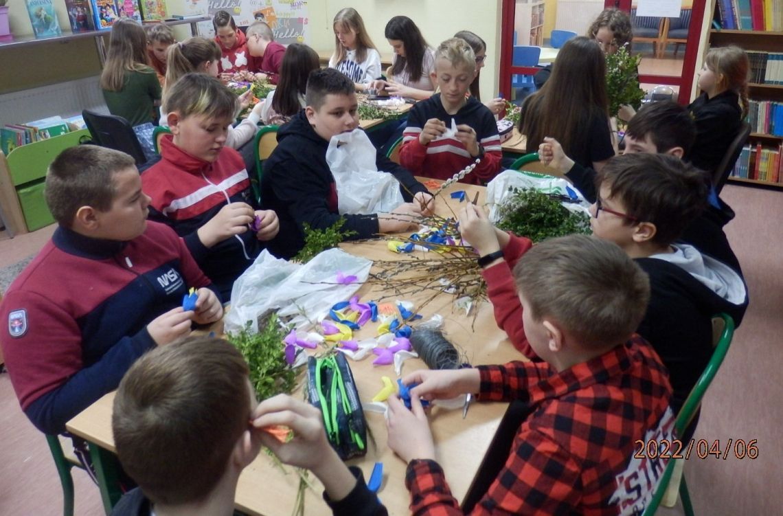 Zbliżające się Święta Wielkanocne to okazja, aby przypomnieć sobie polskie zwyczaje świąteczne. Z tradycją tworzenia palm wielkanocnych zapoznała dzisiaj uczniów klasy VI a Pani Alicja Godzisz z Łęczyc. Pani Alicja już wielokrotnie dzieliła się z uczniami naszej szkoły swoimi umiejętnościami plastycznymi. Dzisiaj pokazała, jak z gałązek oraz kolorowej krepiny wyczarować piękne palemki. Dzieci wykazały się dużym zapałem i kreatywnością, dlatego wykonane przez nich oryginalne palmy, z pewnością będą ozdobą wielu wielkanocnych stołów.