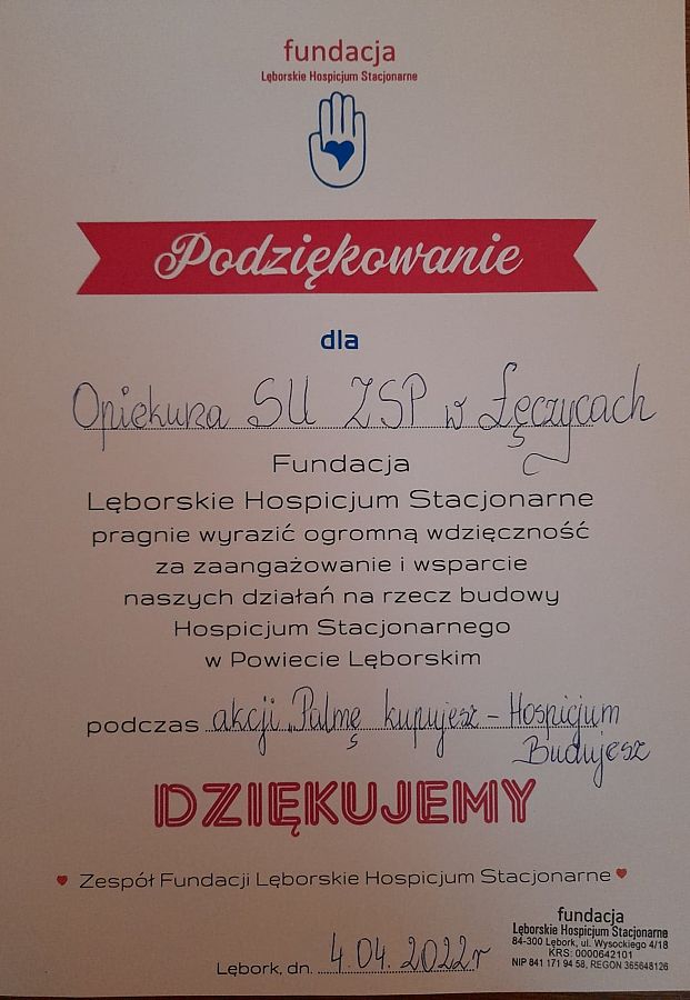 Nasza młodzież znowu pokazała, że potrafi robić cudowne, dobre rzeczy, a działalność wolontariacka jest bliska ich sercu. Samorząd Uczniowski zorganizował akcję wykonania palemek wielkanocnych, które w Niedzielę Palmową zostaną sprzedane przed kościołami, a uzyskane środki zostaną przekazane na rzecz fundacji Lęborskie Hospicjum Stacjonarne. FLHS dziękuje z całego serca za pomoc i zaangażowanie w akcję PALMĘ KUPUJESZ - HOSPICJUM BUDUJESZ nauczycielom plastyki, opiekunowi SU p. Annie Kotłowskiej oraz uczniom z klas VIIA i VIIB : Wiktorii Bogusz, Agacie Hoeft, Julii Rubel, Nikoli Kwaśniak, Julii Seta, Annie Stefanowskiej, Zuzannie Kostka, Alicji Warych, Michałowi Białobrzeskiemu, Michalinie Jędrych, Zuzannie Kowalskiej, Marcelinie Puszka, Marcinowi Żółtowskiemu, Nikodemowi Mizyk, Zuzannie Żywickiej,, Adampwi Walkowiak, Szymonowi Głuchaczka, Szymonowi Oliwa, Dawidowi Malek, Arsenowi Lutciv, Magdalenie Mazur, Lenie Dąbtowskiej i Wiktorii Latosińskiej. DZIĘKUJEMY - DOBRO POWRACA