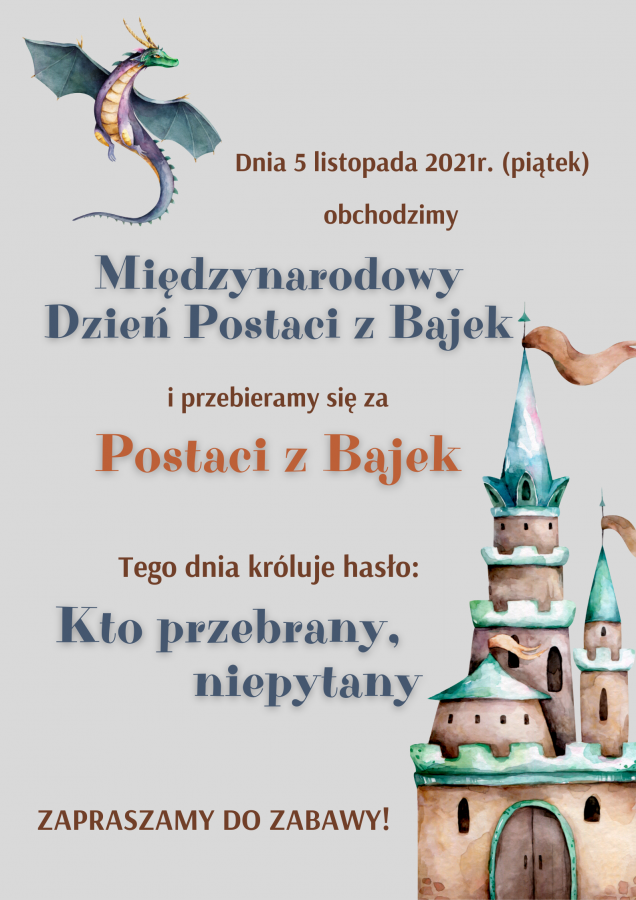 Bajkowi bohaterowie to nieodłączny element dzieciństwa. Uczą, bawią, wychowują. 5 listopada obchodziliśmy w naszej szkole Międzynarodowy Dzień Postaci z Bajek. Dobry nastrój w tym dniu zapewniły bajkowe kreacje, w których uczniowie klas I-III przyszli do szkoły. W klasowych zabawach i quizach towarzyszyła nam znana piosenka "Witajcie w naszej bajce". Oby więcej takich kolorowych i radosnych dni