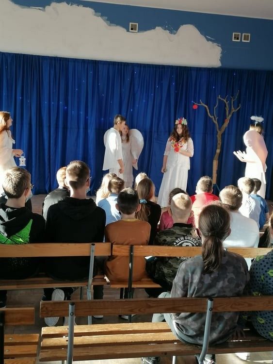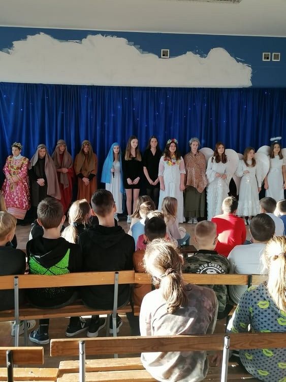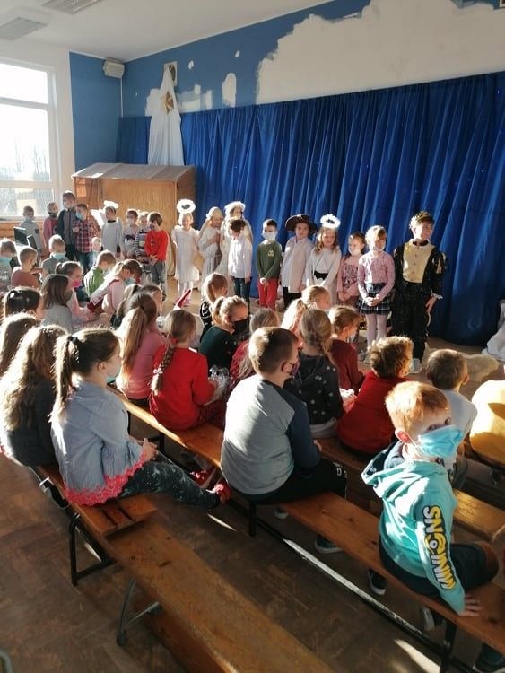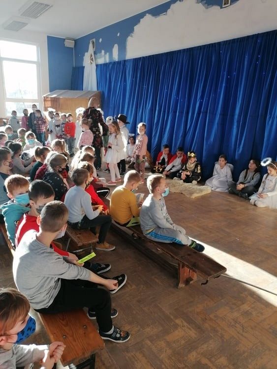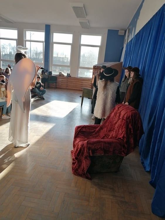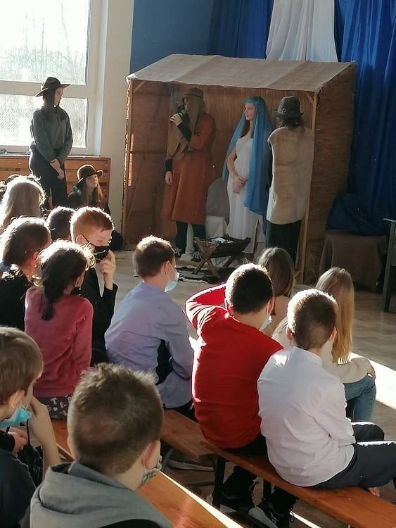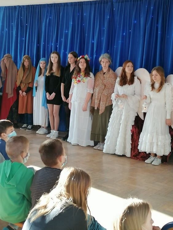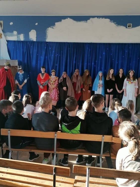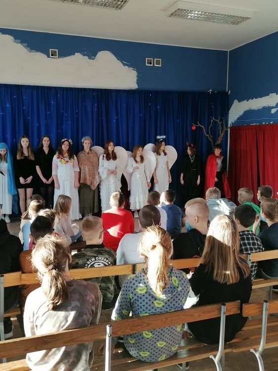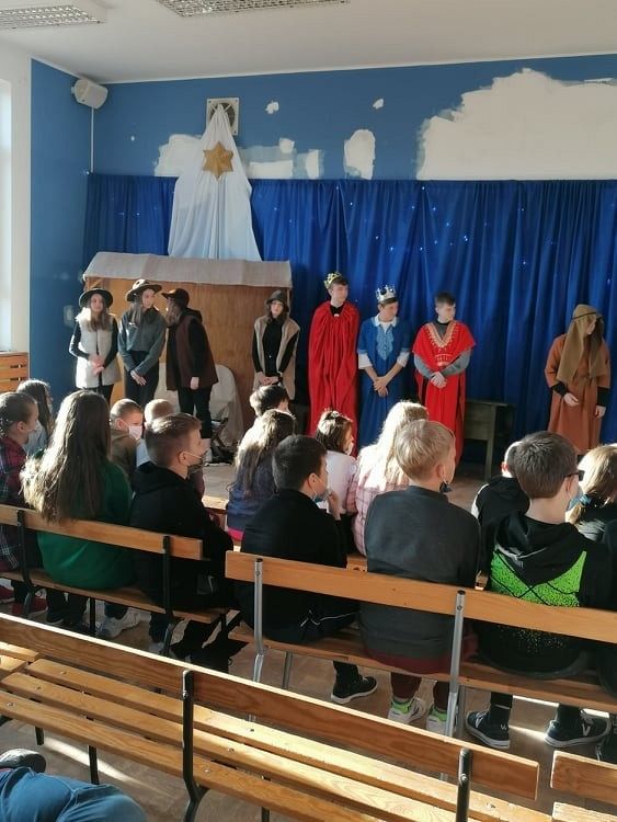 Jasełka przygotowali uczniowie klasy 8c z nauczycielem Ewą K. oraz chór szkolny pod kierunkiem p. Katarzyny H.