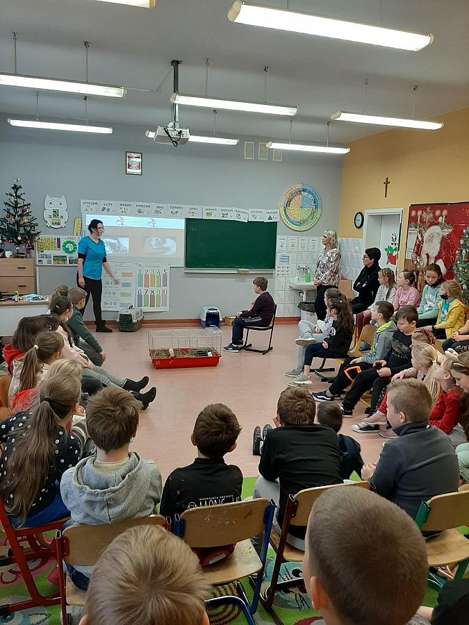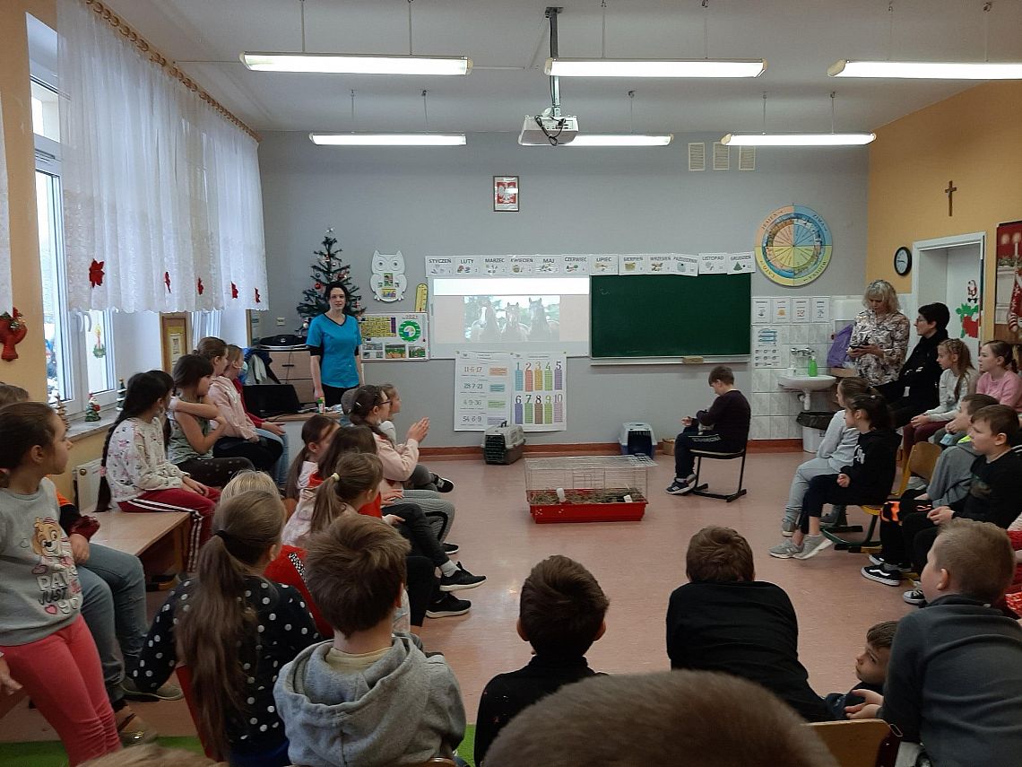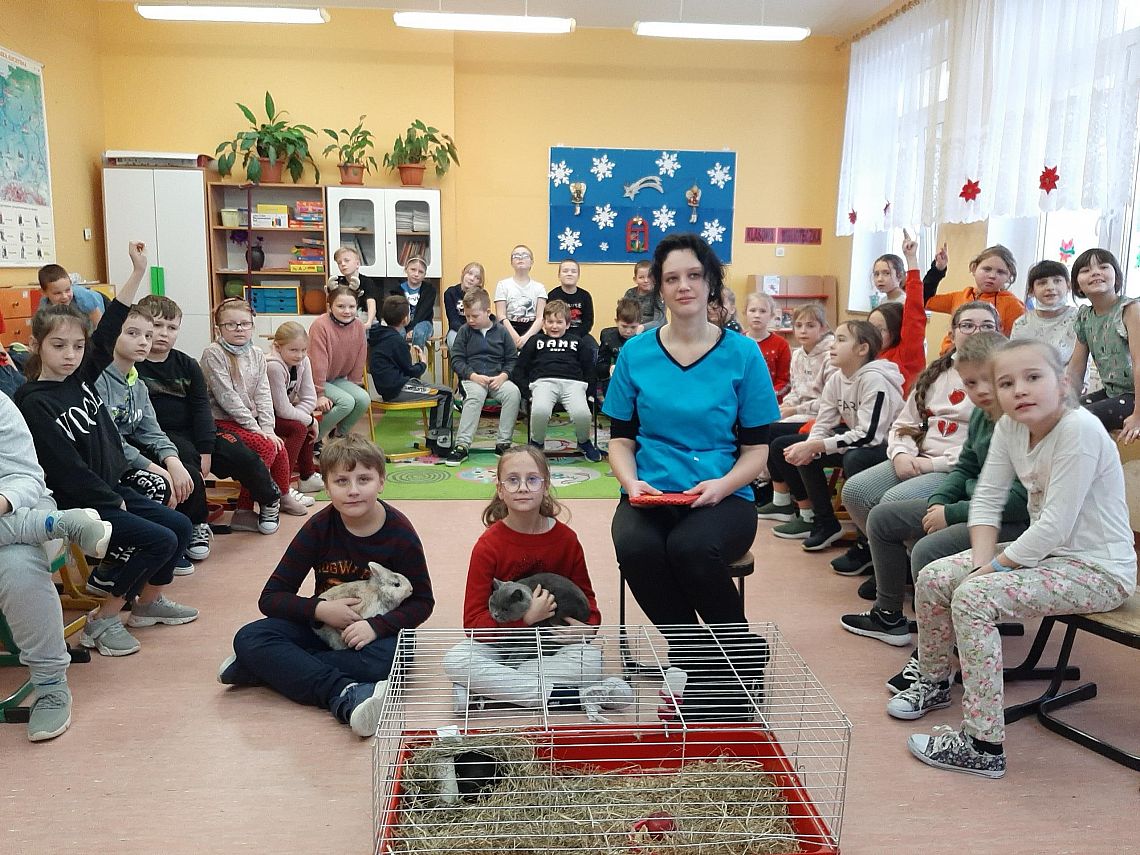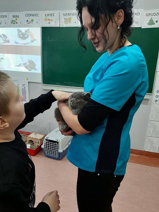 Dzieci uwielbiają zwierzęta. W minionym tygodniu klasy trzecie zajmowały się tą właśnie tematyką. Podsumowaniem nauki było spotkanie z lekarzem weterynarii. Pani Kasia przekazała uczniom wiele ważnych i ciekawych informacji na temat zwierząt domowych. Opowiedziała też o swojej pracy, wzbogacając wszystko licznymi zdjęciami. Atrakcją spotkania były zwierzaki : kot rasy brytyjskiej, królik i świnka morska. Trzecioklasiści aktywnie uczestniczyli w spotkaniu zadając wiele pytań. Dziękujemy za ciekawe i pouczające spotkanie.