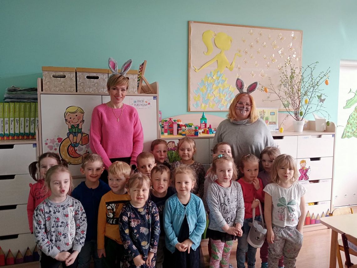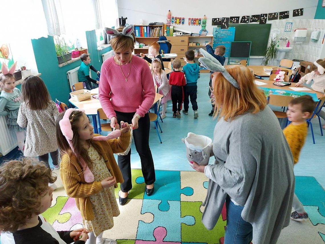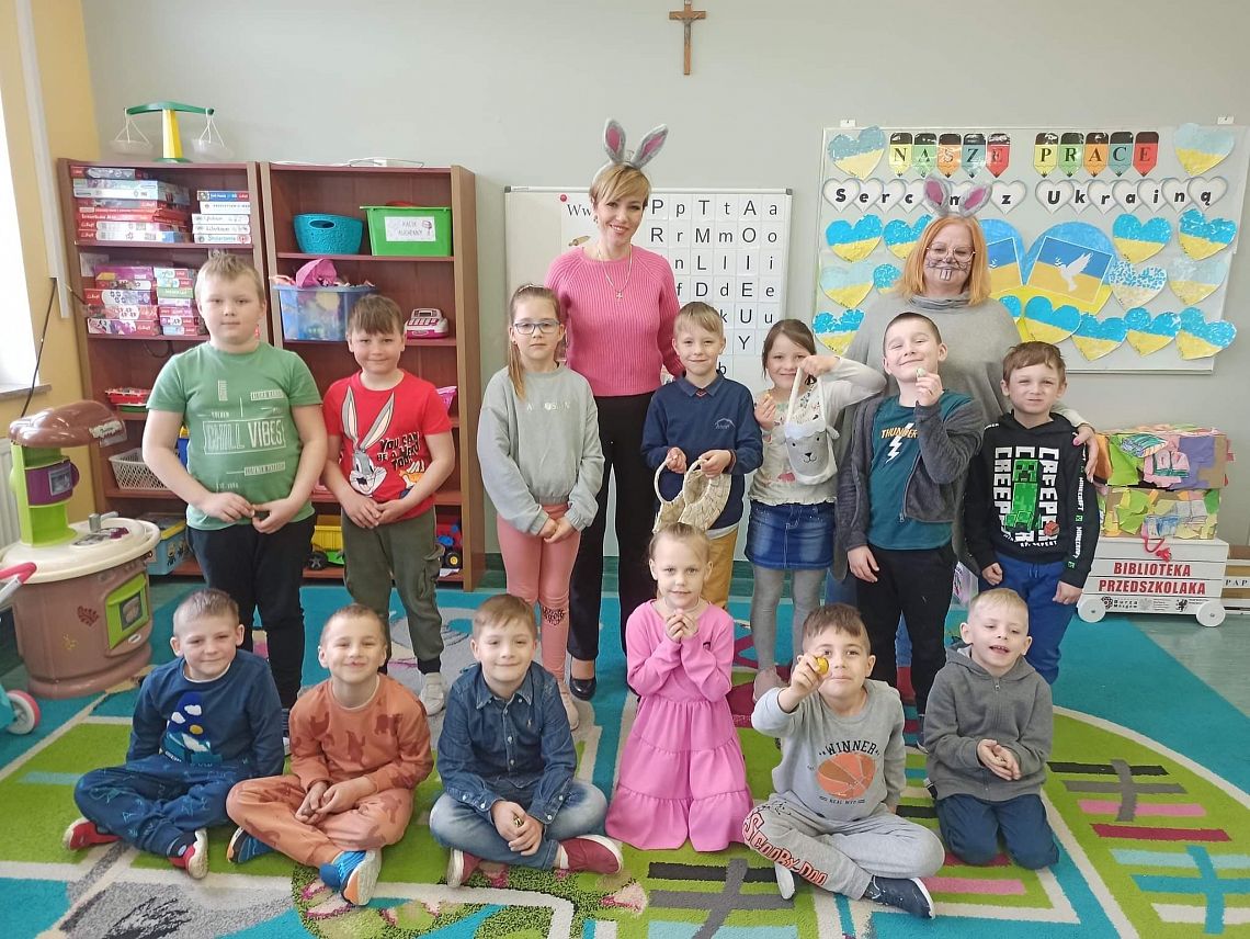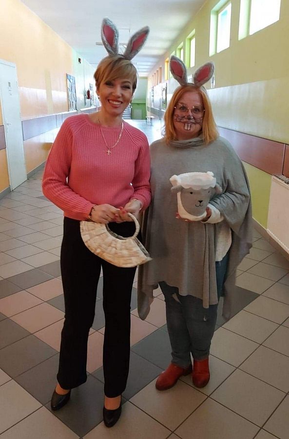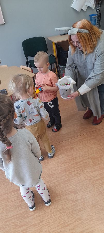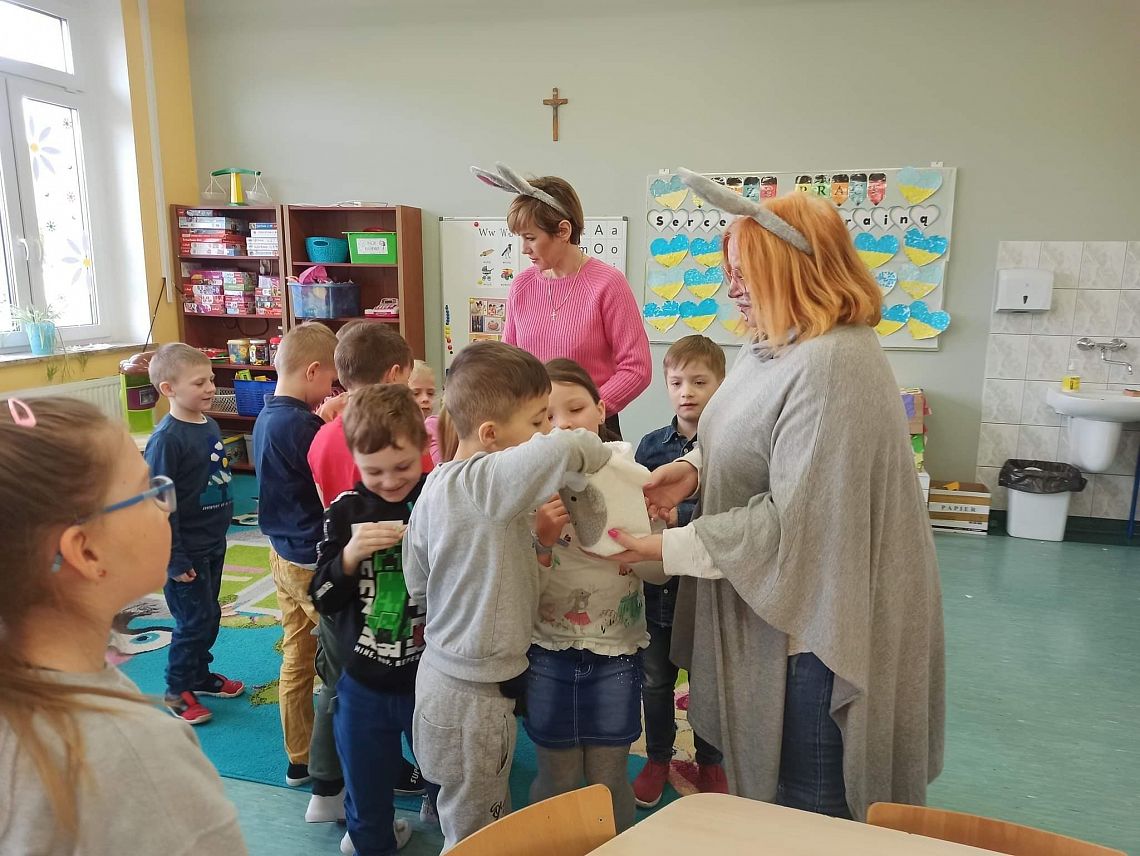 Dziś na holu naszej szkoły, a przede wszystkim w przedszkolu można było spotkać wielkanocne zajączki. To taka wielkanocna niespodzianka dla maluchów. Dzieci były zaskoczone wizytą i zadowolone ... zające obdarowywały wszystkich czekoladowymi jajkami życząc WESOŁYCH ŚWIĄT