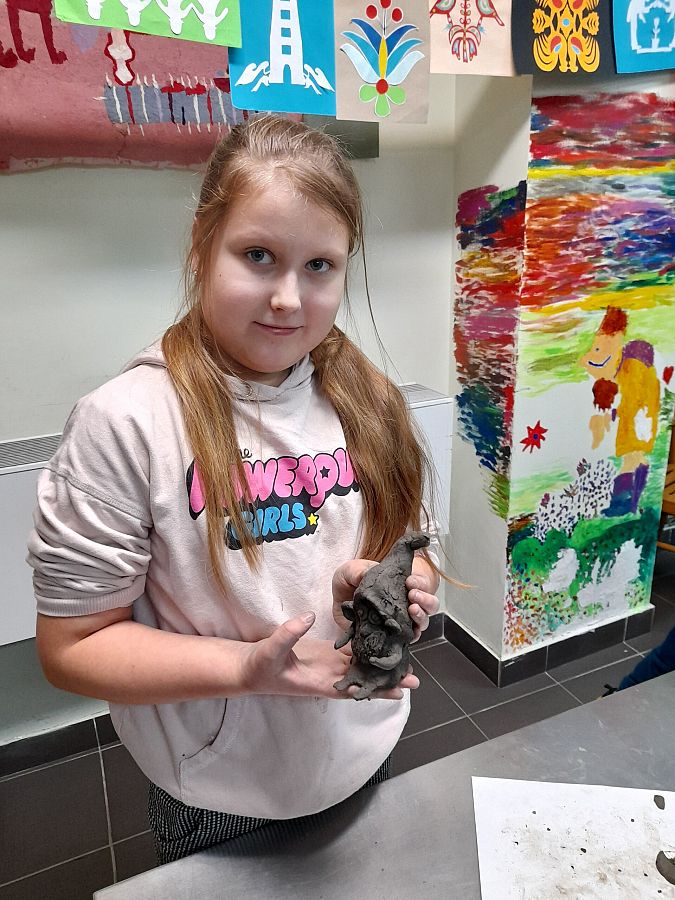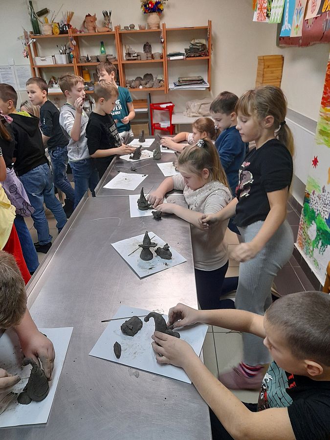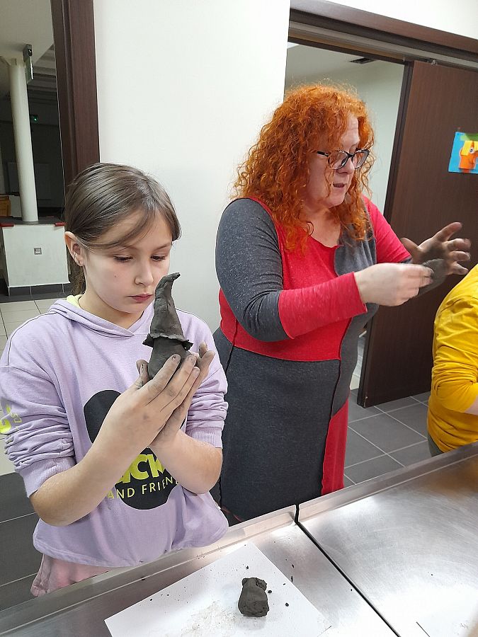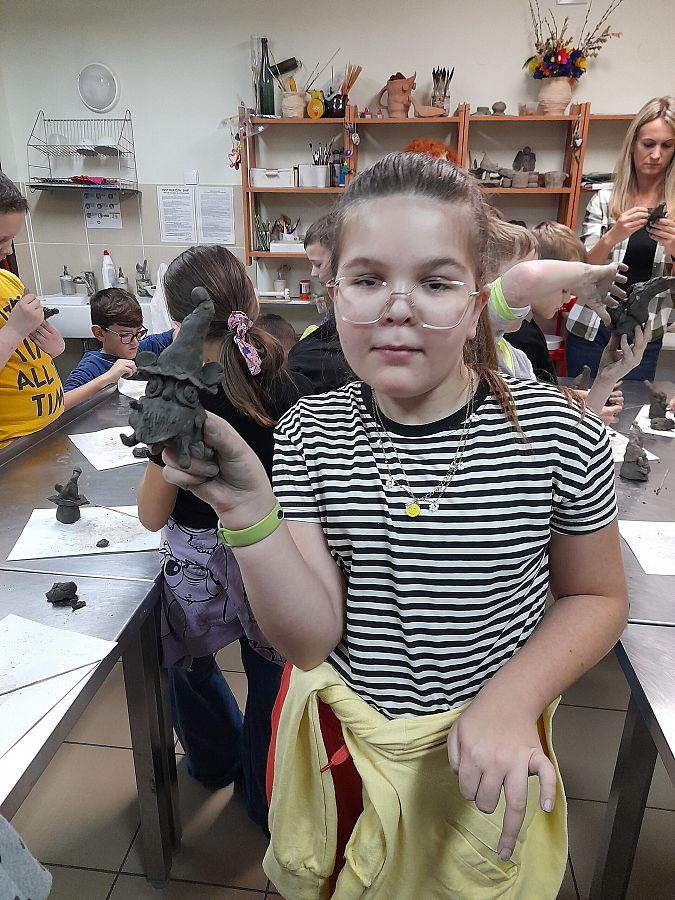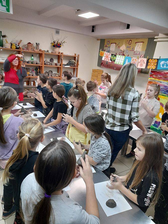 Kolejną atrakcją dnia była wizyta w  Lęborskim Muzeum. Tam  odbyły się warsztaty gliniarskie, podczas których uczniowie lepili… oczywiście krasnoludki z książki Marii Konopnickiej. Niepowtarzalne, własnoręcznie wykonane skrzaty, przyjechały z nami do szkoły i czekają teraz na pomalowanie.