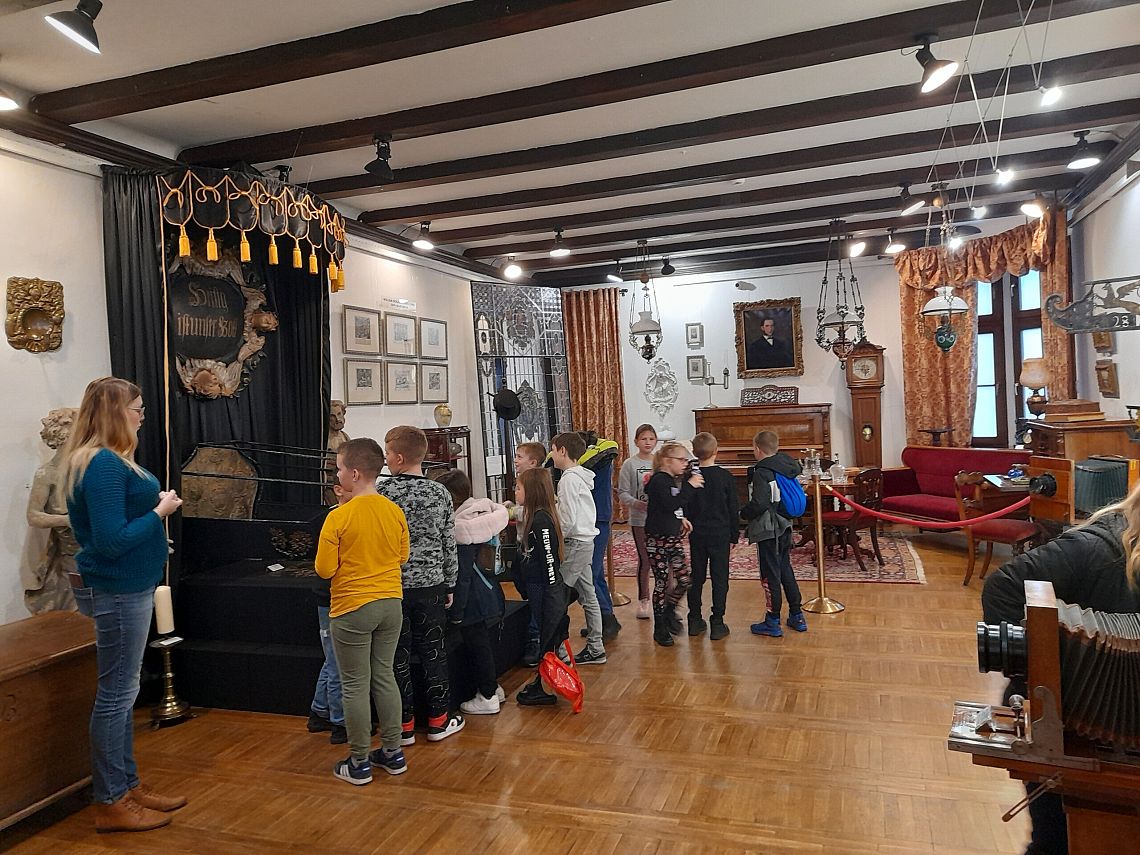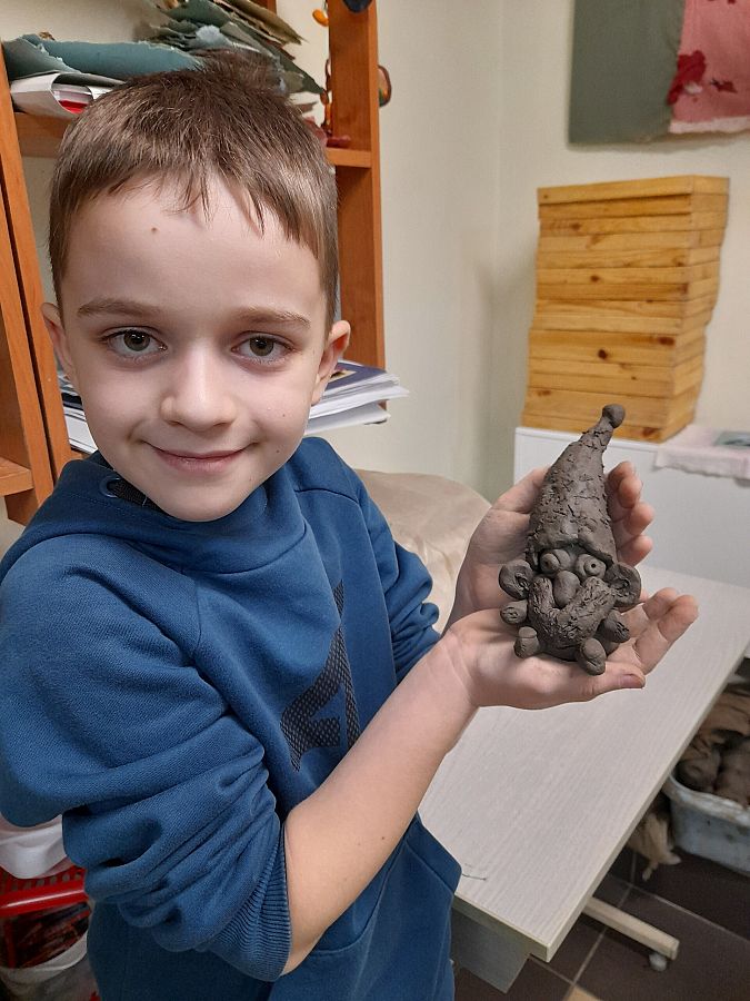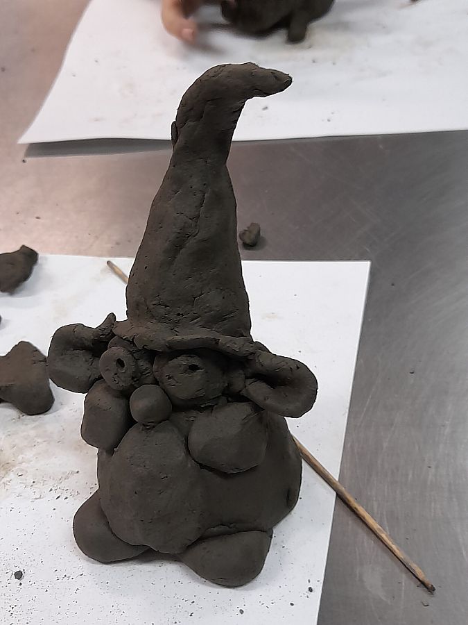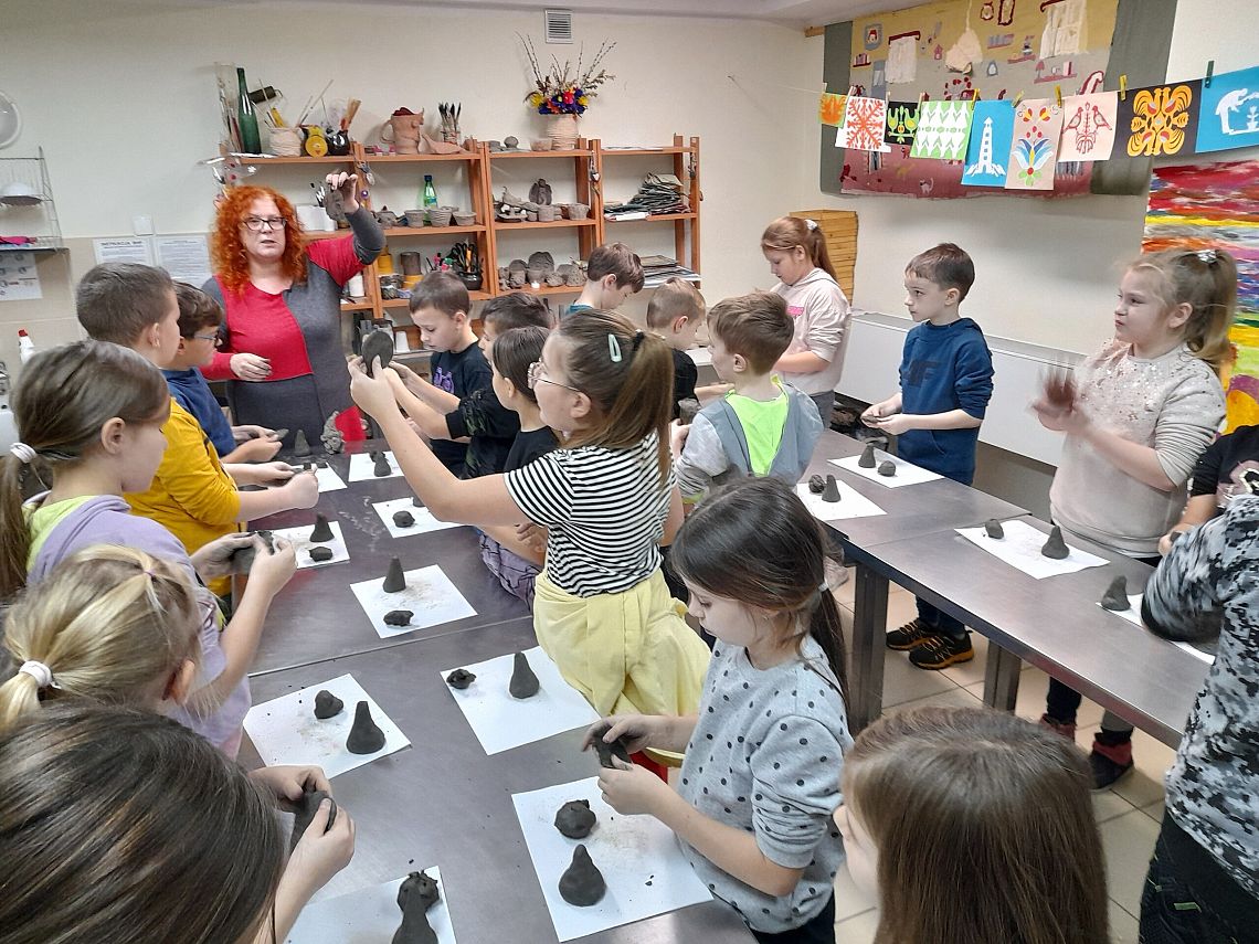 Kolejną atrakcją dnia była wizyta w  Lęborskim Muzeum. Tam  odbyły się warsztaty gliniarskie, podczas których uczniowie lepili… oczywiście krasnoludki z książki Marii Konopnickiej. Niepowtarzalne, własnoręcznie wykonane skrzaty, przyjechały z nami do szkoły i czekają teraz na pomalowanie.
