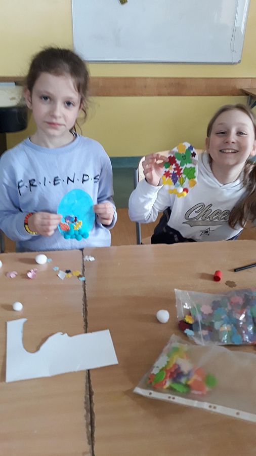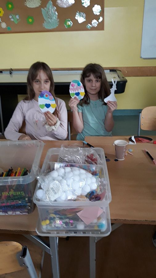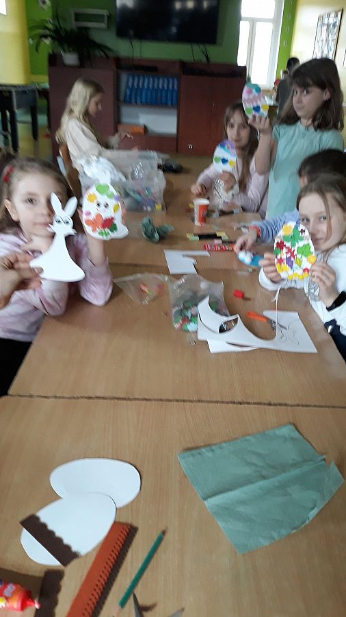 Uczniowie w świetlicy szkolnej zrobili samodzielnie wielkanocne kartki świąteczne w kształcie jajka i zająca. Z jednej strony kartka zawiera elementy Świąt Wielkanocnych, a z drugiej życzenia świąteczne. Dzieci wzięły kartki do domu, aby podarować je swoim bliskim.