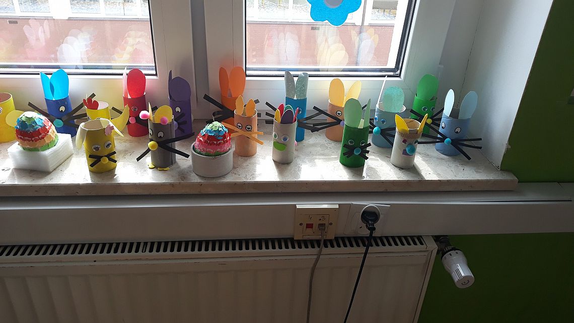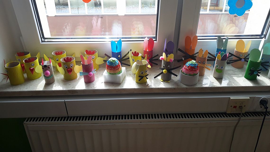 Uczniowie w świetlicy zrobili też kolorowe zające i kurczaki (z rolek od papieru toaletowego).