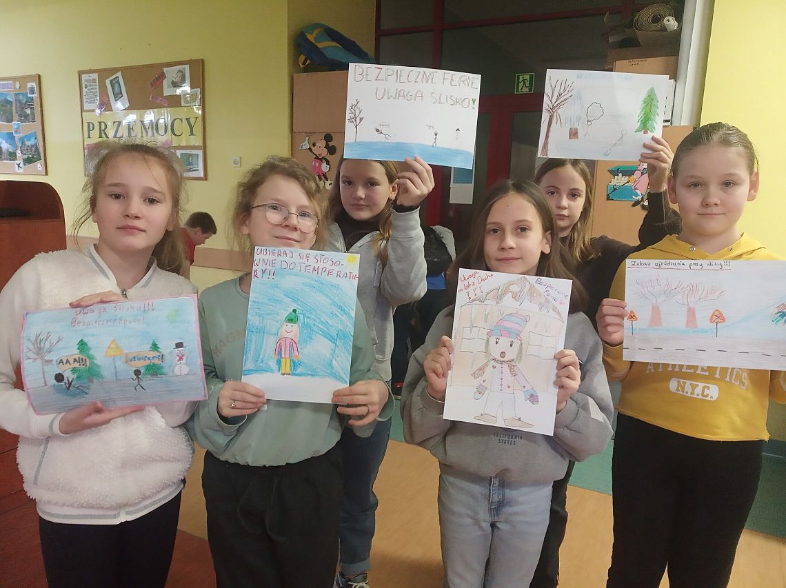 Ferie zimowe to czas odpoczynku dla uczniów oraz ich opiekunów. Abyśmy wszyscy czuli się bezpiecznie w tym miłym dla nas czasie uczniowie Samorządu Szkolnego zorganizowali akcję „Bezpieczne ferie” w szkole, w ramach której wszyscy uczniowie mieli okazję wykonania na świetlicy szkolnej plakatów przestrzegających kolegów i koleżanki przed zagrożeniami i niebezpieczeństwami w czasie ferii zimowych.