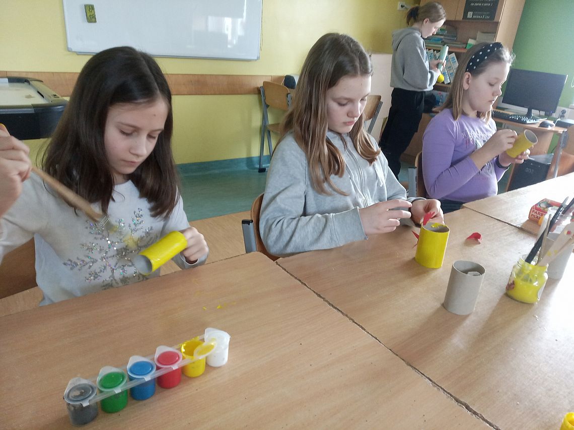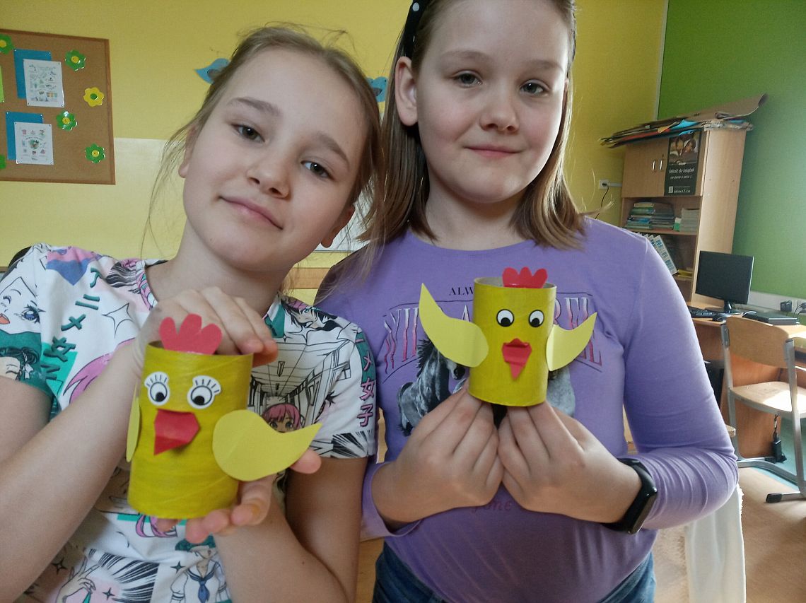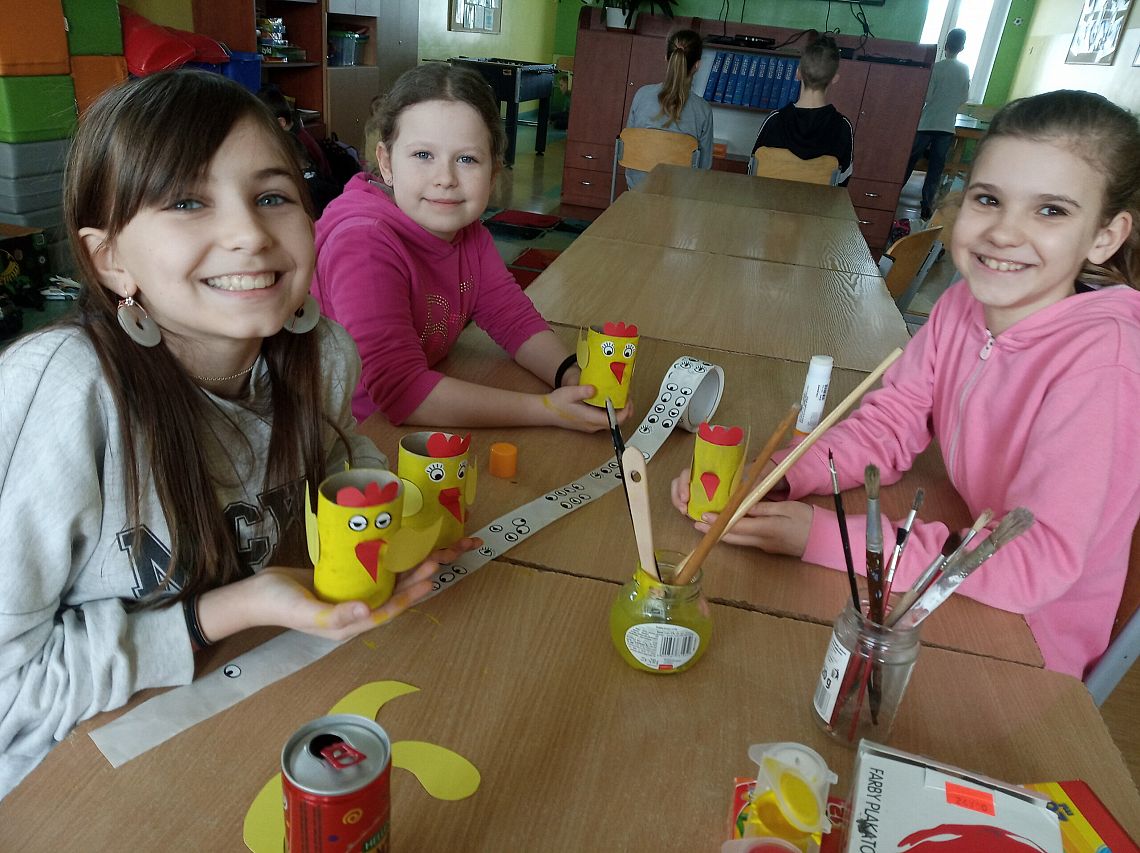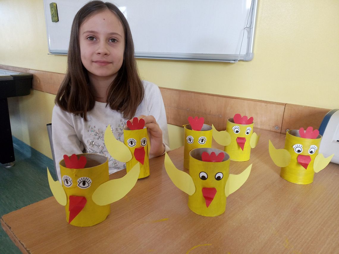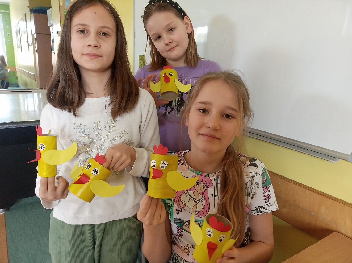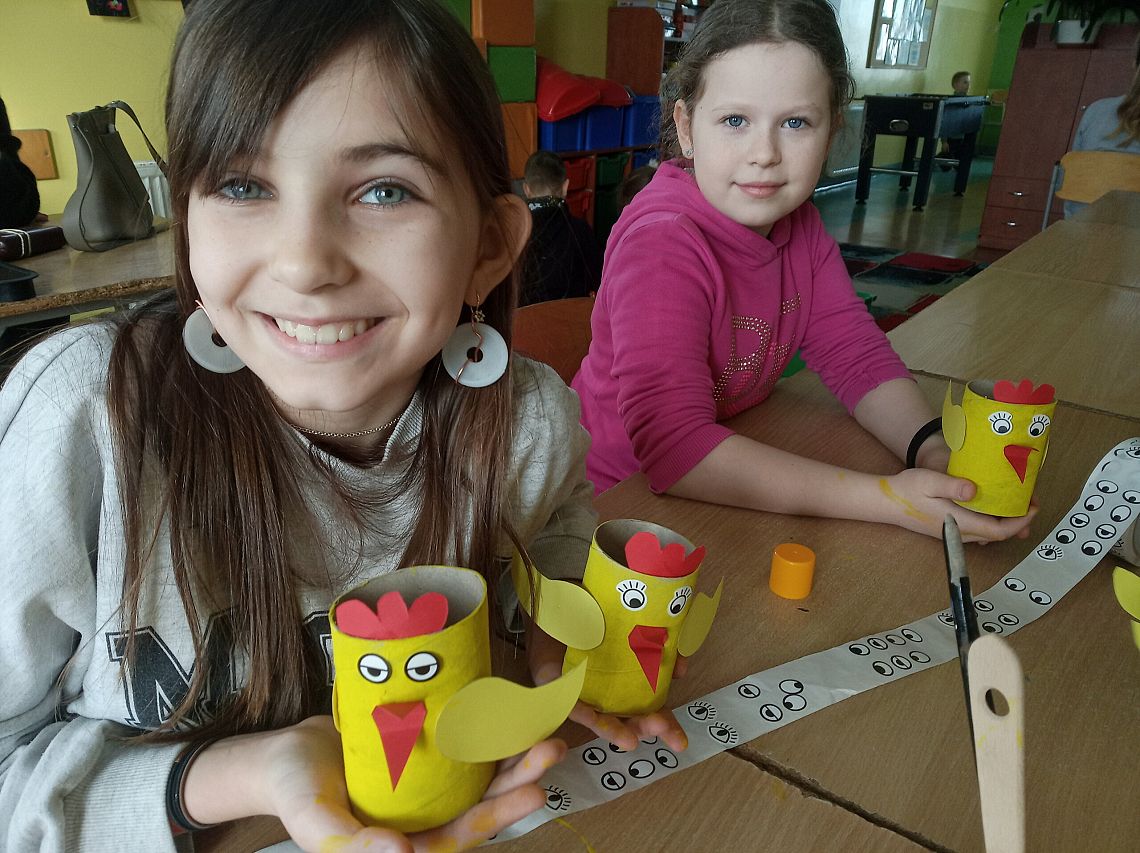 Przed Świętami Wielkanocy dzieci w świetlicy szkolnej dzielnie pracują pod opieką wychowawców wykonując dekoracje świąteczne dla swoich bliskich. Dziś dzień wykonania wielkanocnych uroczych kurczaków z rolek papieru i tektury.