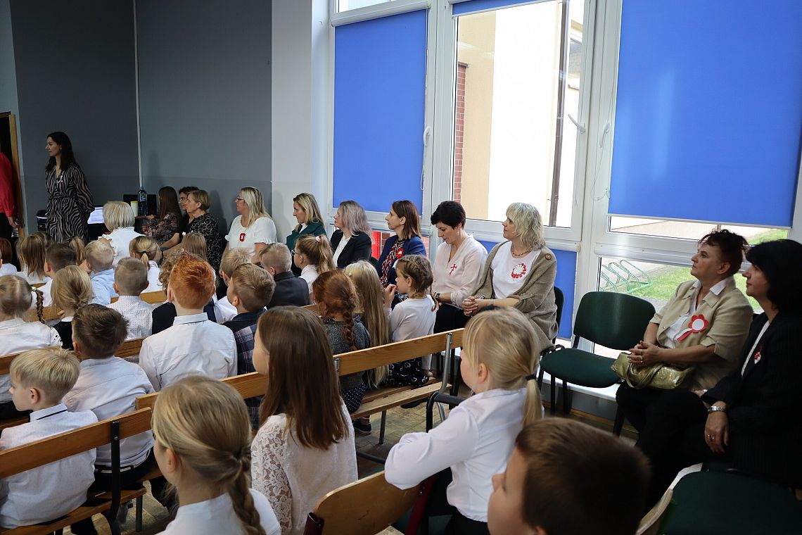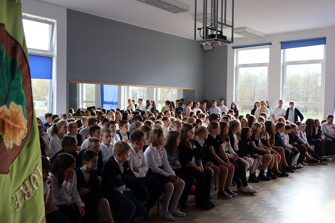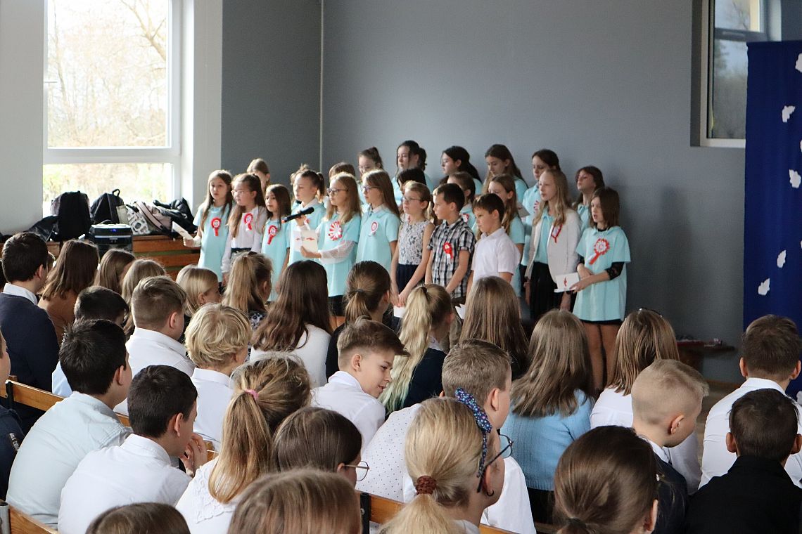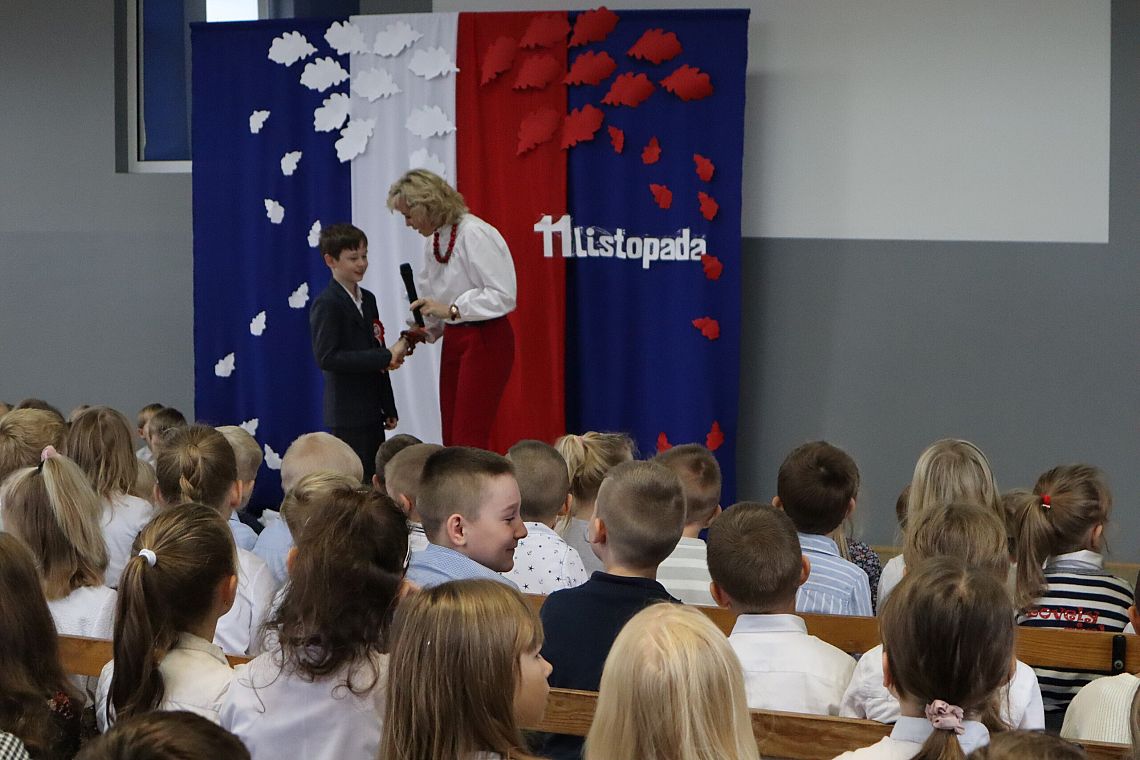Uczniowie również odpowiedzialnie podeszli do uroczystości, byli w strojach galowych i wszyscy mieli patriotyczne kotyliony.