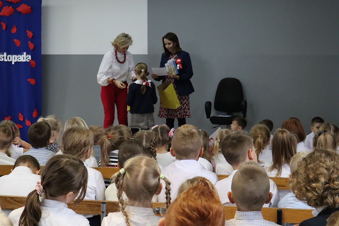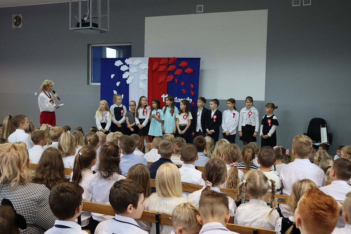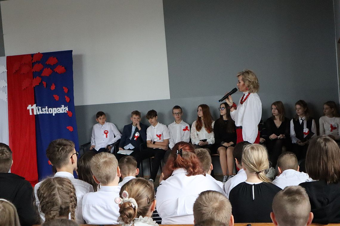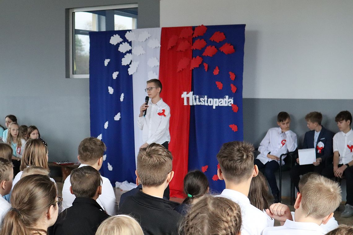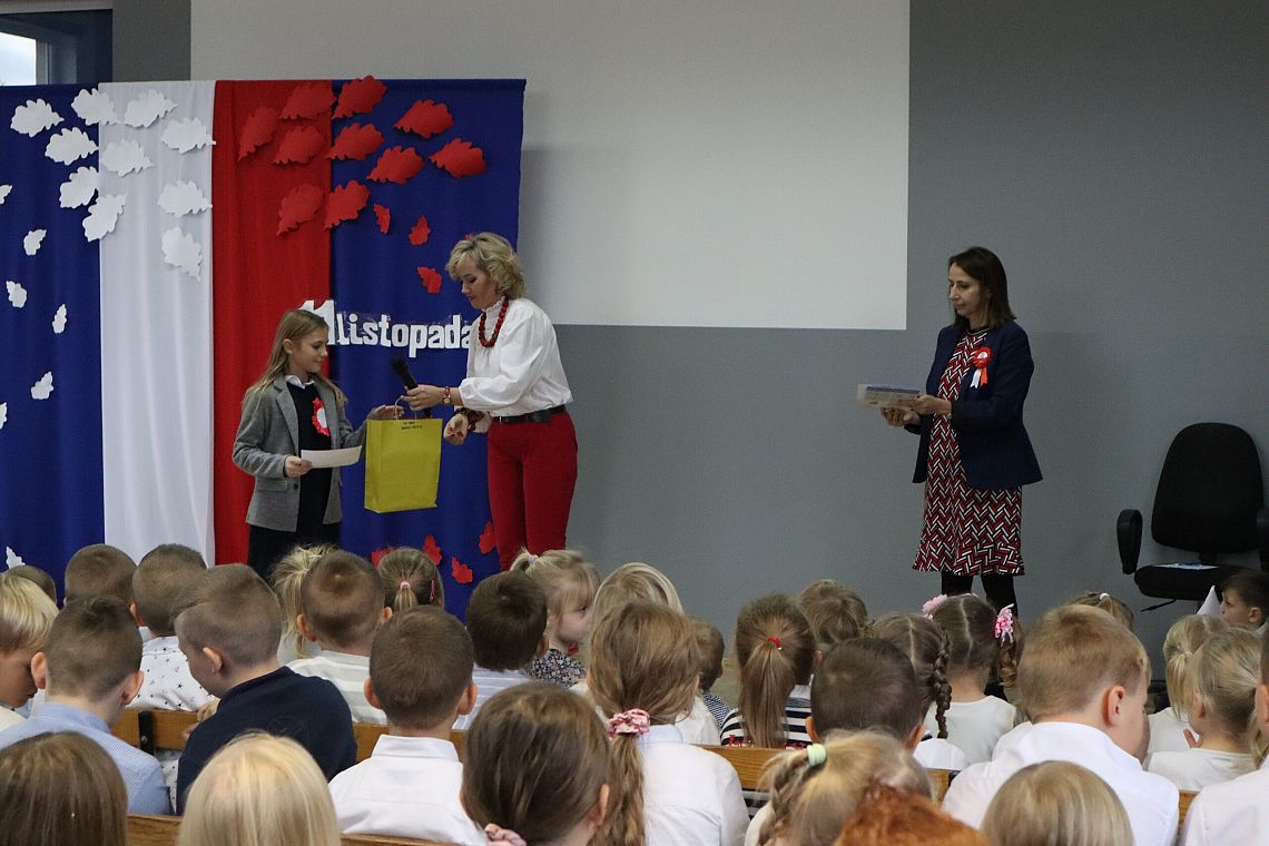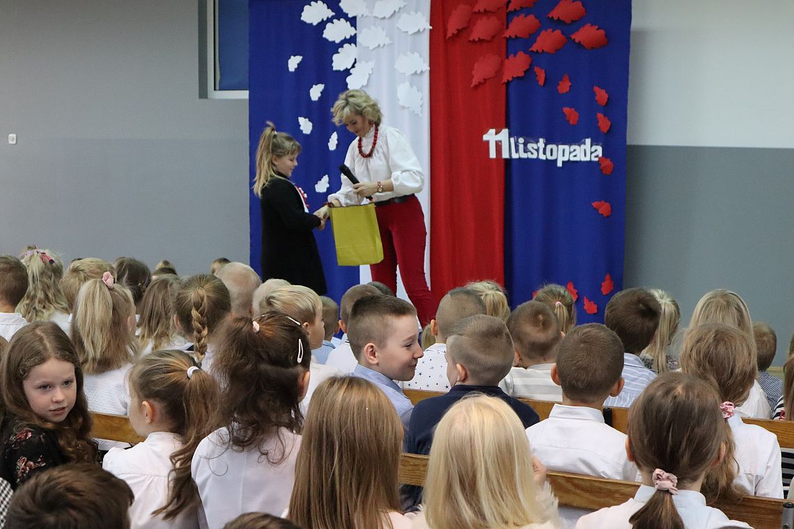 W czwartek 10 listopada, w przeddzień 104 rocznicy odzyskania niepodległości odbył się w naszej szkole uroczysty apel. Uczniowie klas ósmych wprowadzili nas w świat historii Polski od czasów zaborów aż po odzyskanie niepodległości przybliżając nam czas, kiedy Polska wróciła na mapy świata. Uroczystość wspaniale oprawił muzycznie chór szkolny śpiewając znane wszystkim Polakom pieśni patriotyczne takie jak: "Raduje się serce, raduje się dusza", "Maszerują strzelcy, maszerują..."czy "Wojenko, wojenko". Uczniów i całe przedstawienie zostało przygotowane przez Panią Danutę Wałdowską oraz Panią Ewelinę Stawską.