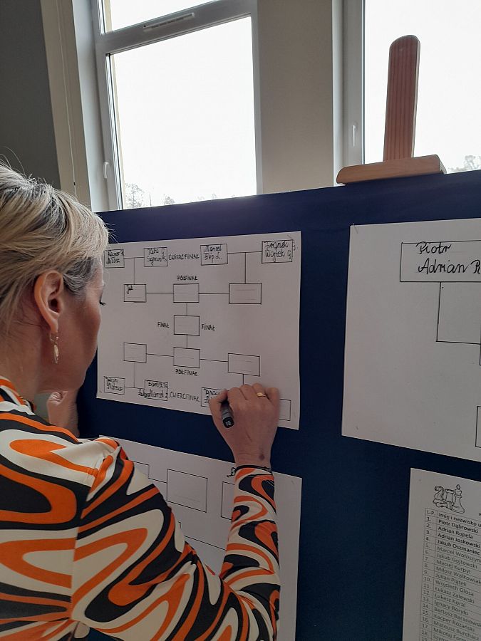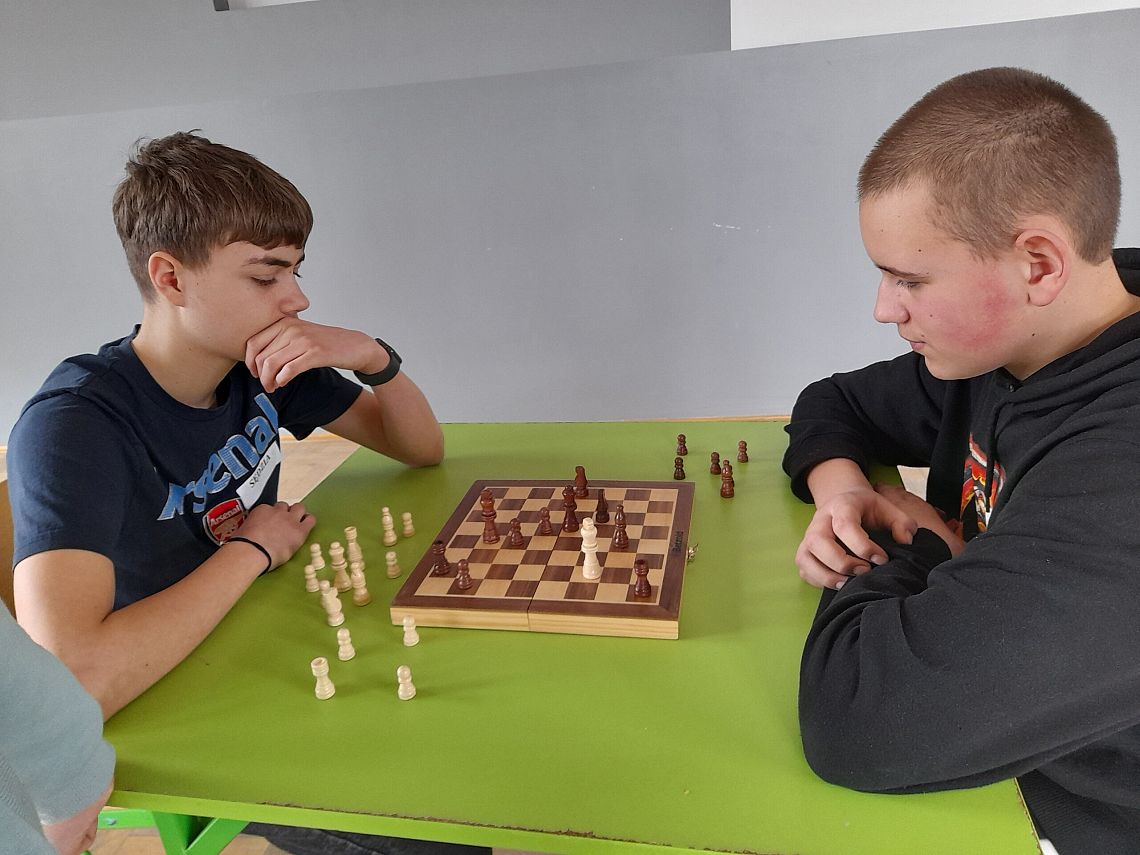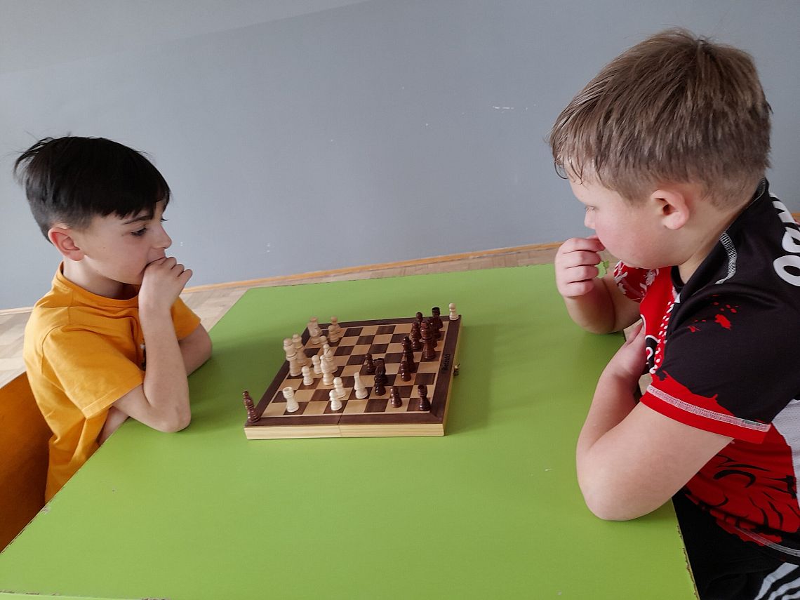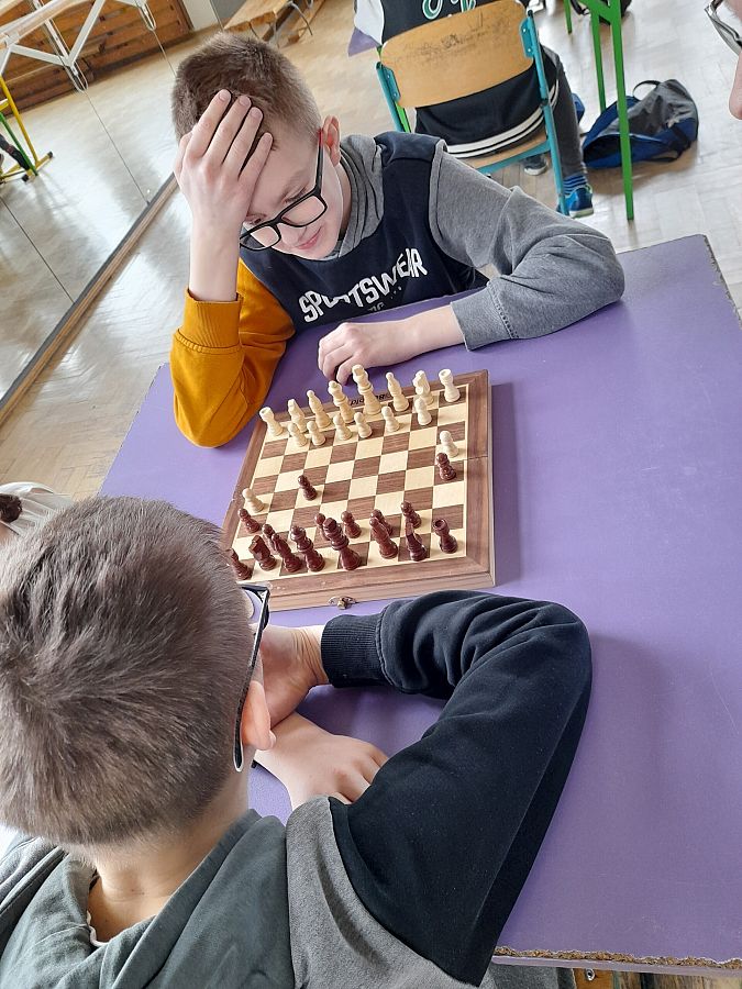 Wszyscy szachiści w wielkim skupieniu i rzetelnej grze, walczyli o przejście do kolejnego etapu. Po przeprowadzeniu meczy eliminacyjnych i półfinału,  do ścisłego finału zakwalifikowało się 2 uczniów: Marcel Wołoszynek z klasy 4 a oraz Mateusz Makurat z klasy 8 a. Emocje sięgnęły  zenitu! W ostateczności: