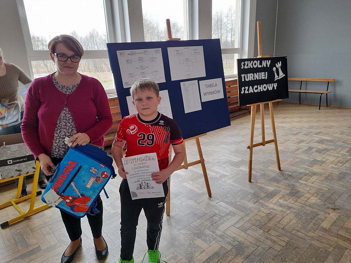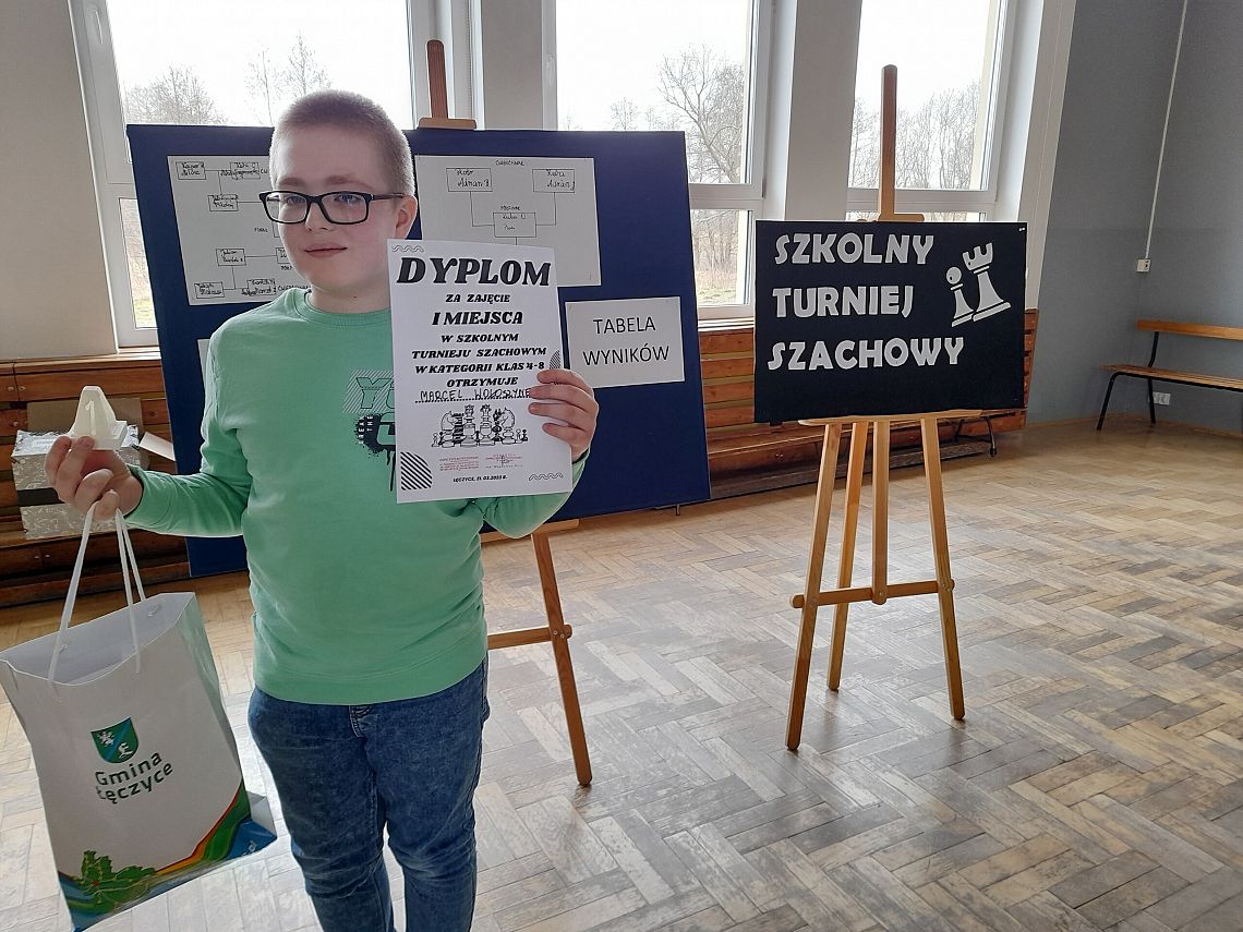 natomiast  MARCEL WOŁOSZYNEK z KLASY 4 a zdobył puchar (wydrukowany na drukarce 3D:) i TYTUŁ  MISTRZA SZACHÓW w kategorii klas 4-8. Marcel,  pomimo młodego wieku, doskonale poradził sobie ze współzawodnikami i w ostatecznym starciu ze starszym od siebie przeciwnikiem.  GRATULUJEMY!